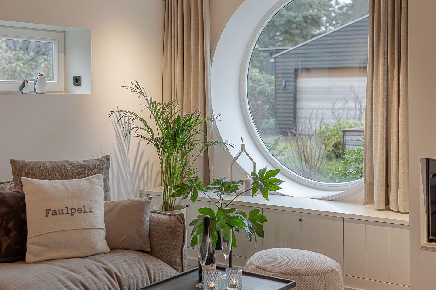 Das „Sylter Strandholz“ besticht durch klare, zeitlose Architektur und hochwertigste Materialien, die eine Atmosphäre der Leichtigkeit und Exklusivität schaffen. Die großzügigen, runden Fenster laden förmlich dazu ein, den Blick auf den liebevoll gepflegten Garten zu genießen und den Tag in harmonischem Licht zu erleben. Der offene Raumfluss im Inneren vermittelt eine unaufdringliche Weite und lässt jeden Moment in diesem Haus zu etwas Besonderem werden.