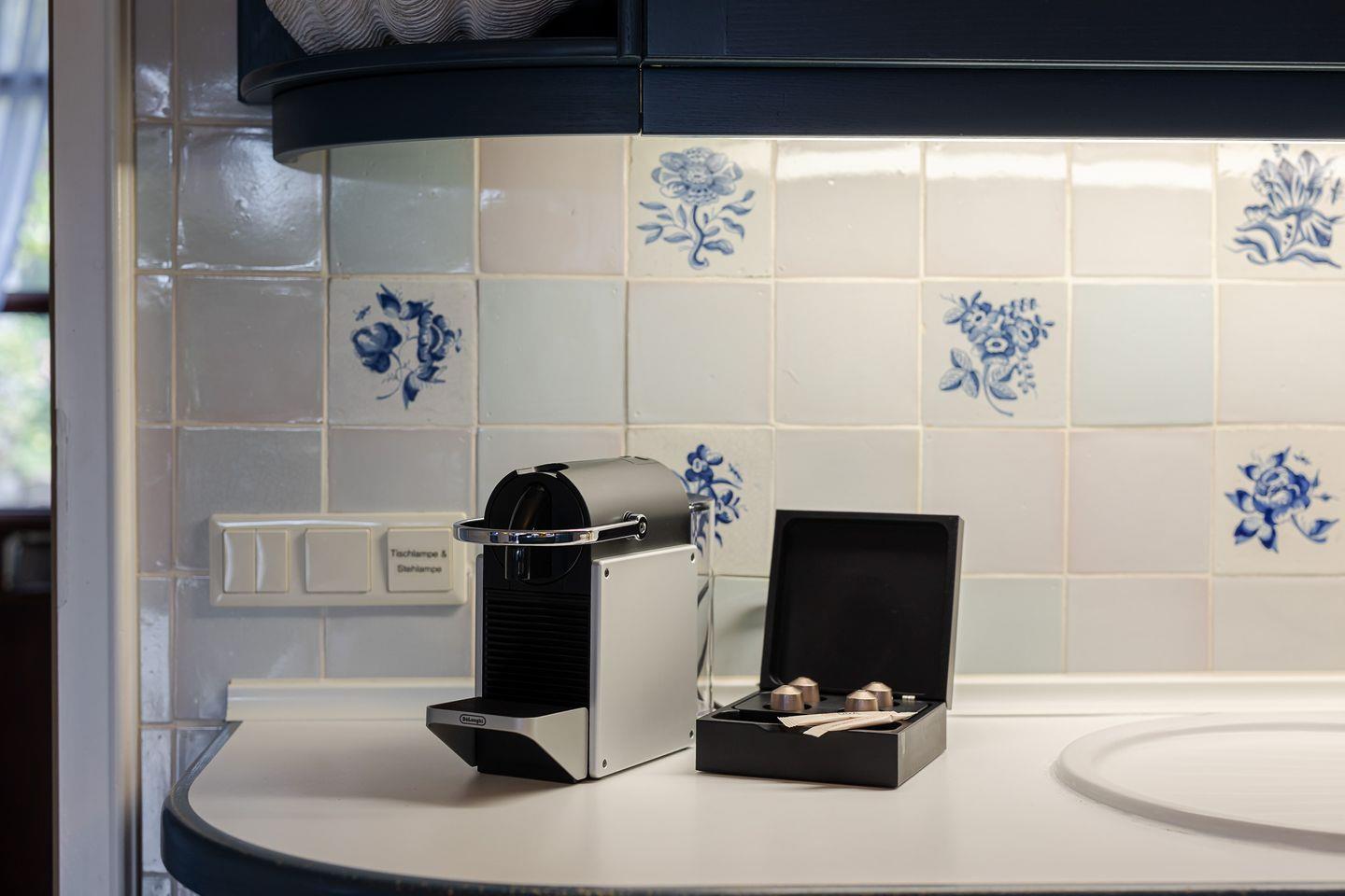 Die wunderschöne Landhausküche in Ozeanblau, die gemütliche Sofaecke und die warmen Farben schaffen innen ein Gefühl von Geborgenheit. Der Kamin ist dekorativ, zaubert aber mit seinen Kerzenlichtern eine stimmungsvolle Atmosphäre – besonders an kühleren Tagen. Auf dieser Ebene befinden sich zudem ein Vollbad sowie ein praktischer Waschraum, ideal für längere Aufenthalte, Strandtage und Reisen mit Kindern oder Hund.