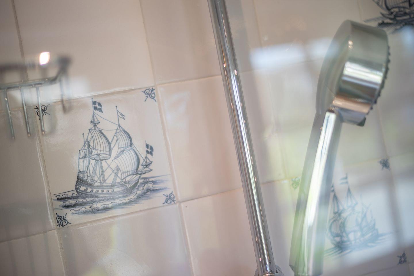 Bad 1: Dusche mit zusätzlichem Regenduschkopf, WC in weiß, Delfter-Fliesen, Fußbodenheizung, beheizter Handtuchtrockner, beleuchteter Kosmetikspiegel