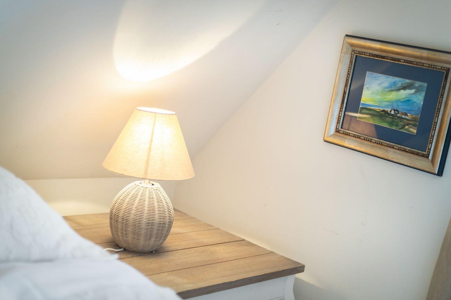 Im Dachgeschoss hat FIETE 2 Schlafräume: ein Elternschlafzimmer mit Doppelbett sowie ein Kinderzimmer mit einem breiten Bett (120 x 190 cm). Im Dachgeschoss befindet sich ein WC mit Waschgelegenheit.
