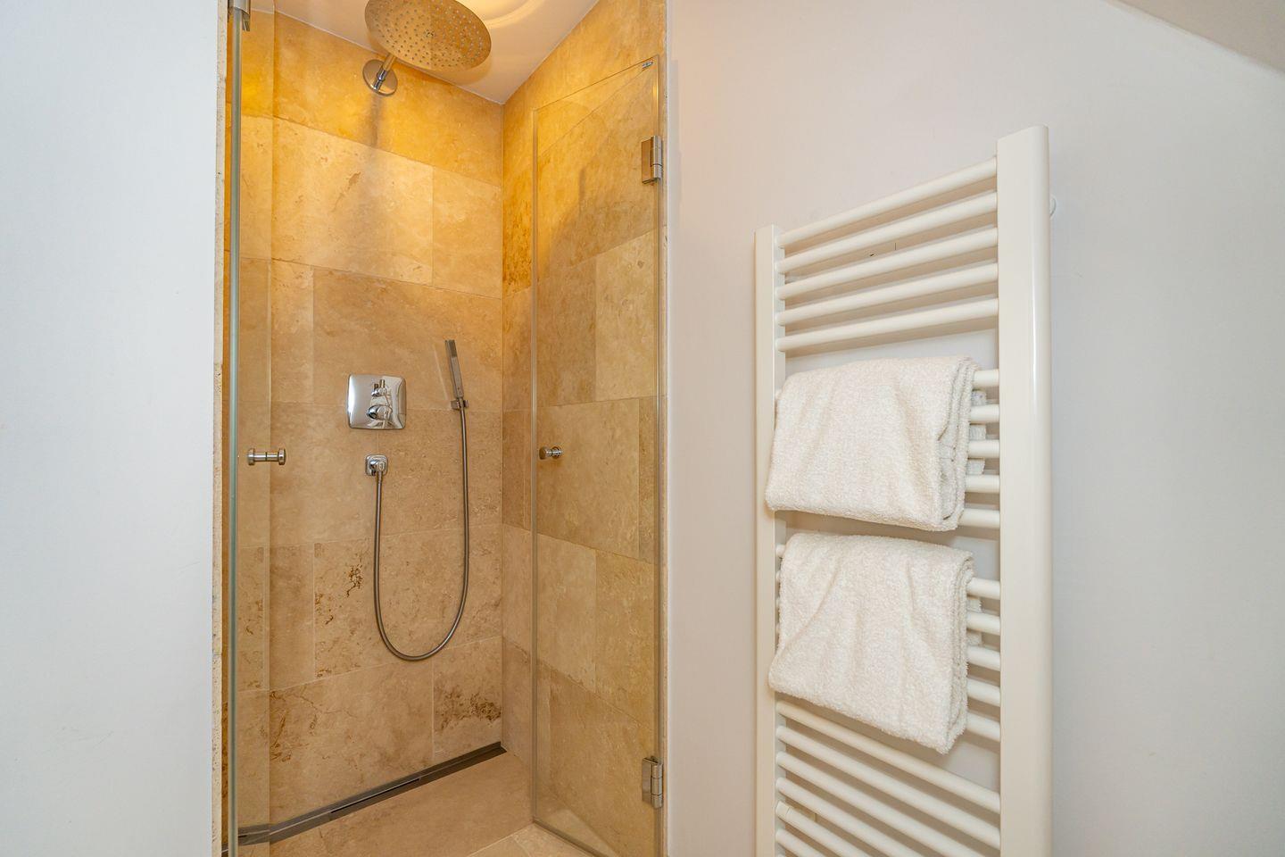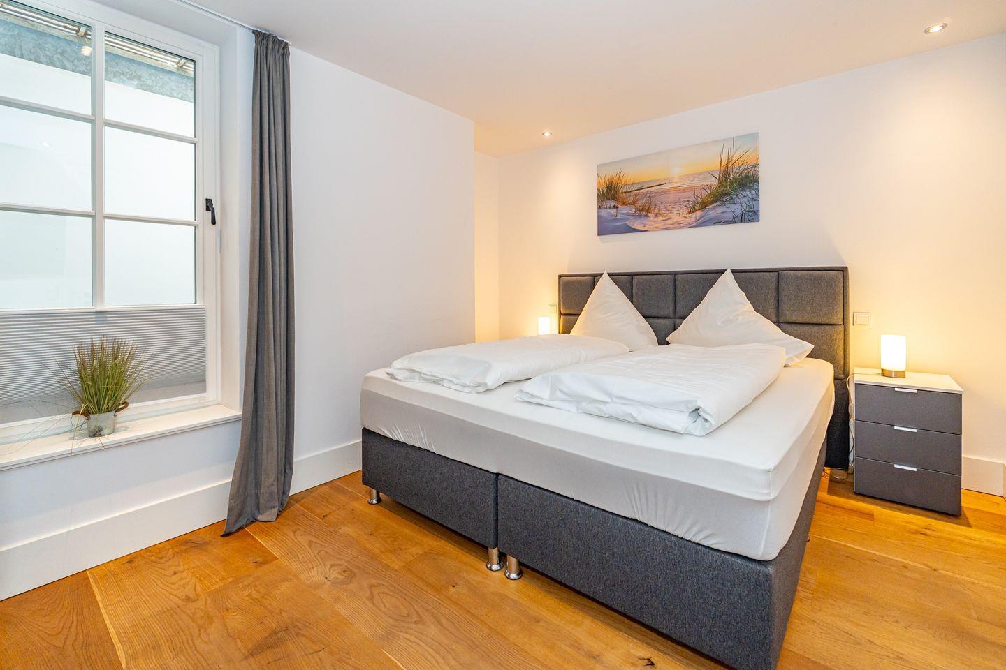 Im Obergeschoss können Sie es sich in einem weiteren Schlafzimmer mit gemütlichen Boxspringbett und Flat Screen nach einem schönen Urlaubstag bequem machen. Auf dieser Etage befindet sich ebenfalls ein Badezimmer mit WC, bodentiefer Dusche und Handtuchheizkörper.