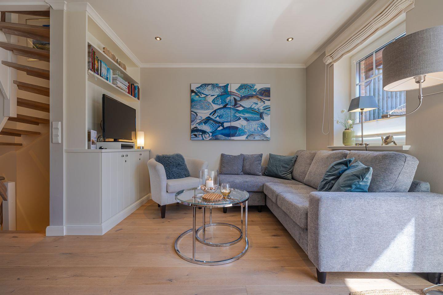 Auf drei geschmack- und liebevoll mit Eichendielen, warmen Syltfarben und mit Fußbodenheizung versehenen Ebenen stellt sich leicht das cozy Syltfeeling ein, um dem Alltagsstress zu entfliehen.