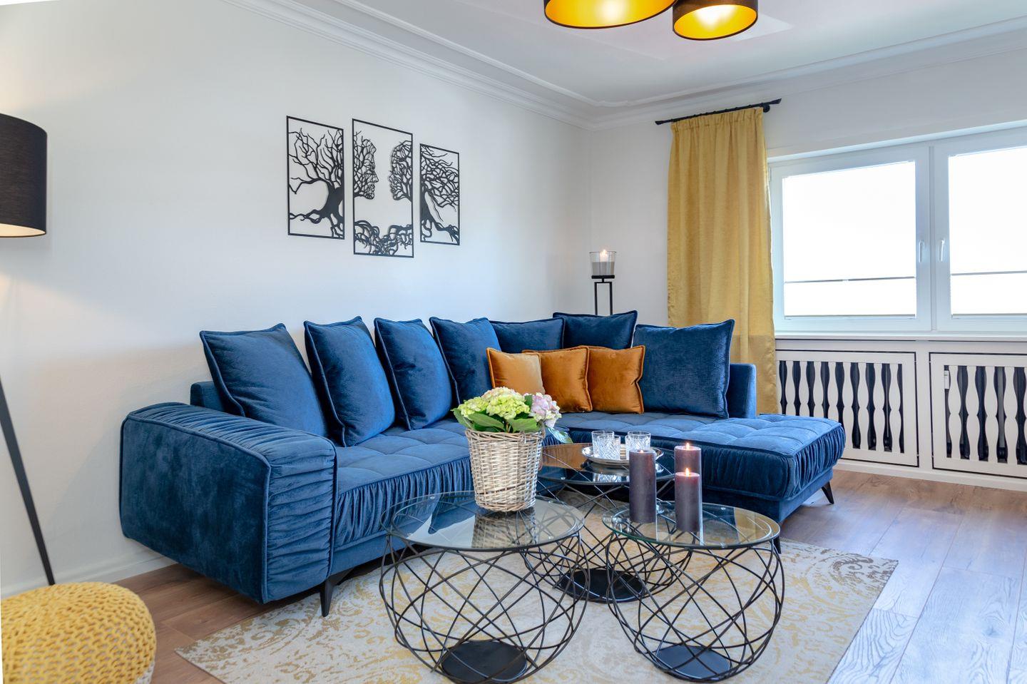 Die Wohnung begeistert durch ihre behagliche Atmosphäre und stilvolle Einrichtung. Der helle und einladende Wohnbereich lädt mit gemütlichen Sofaelementen zum Entspannen und gemeinsamen Verweilen ein.