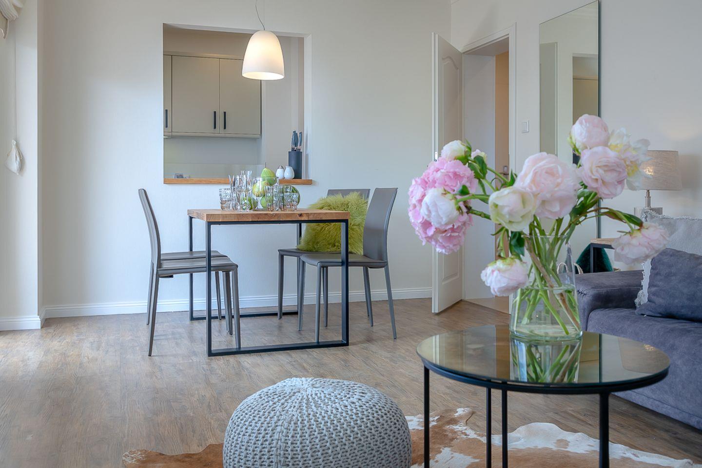 Die Ferienwohnung ist modern und komfortabel gestaltet, wobei viel Wert auf Details gelegt wurde. Die offene Küche zum Wohnzimmer ist mit allen Annehmlichkeiten ausgestattet, die man sich wünschen kann: ein Cerankochfeld, Backofen, Mikrowelle, Kühlschrank mit Gefrierfach, Geschirrspüler sowie eine Nespresso-Maschine für den perfekten Kaffeegenuss am Morgen. Der gemütliche Essbereich lädt zu gemeinsamen Mahlzeiten ein, während die Sofaecke im Wohnzimmer für entspannte Stunden sorgt – vielleicht bei einem Film auf einem der beiden Fernseher mit internationalen Kanälen.