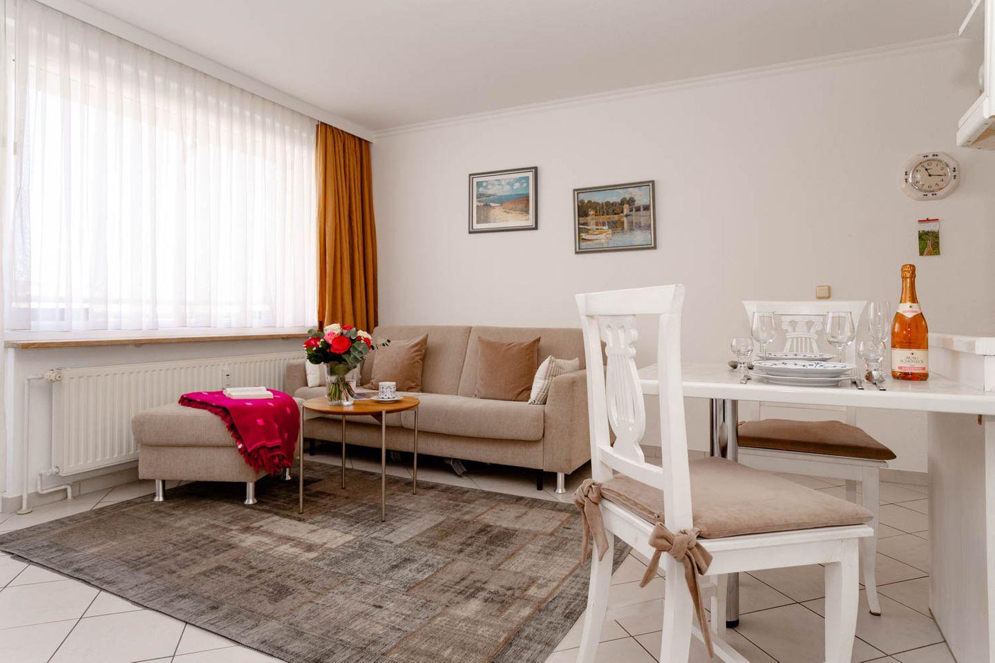 Ein königlicher Name und eine ebensolche Lage: Die 2-Zimmer-Ferienwohnung "Queen Mary" liegt nur 100 Meter von der Westerländer Strandpromenade entfernt im 3. Stock einer gepflegten Wohnanlage mit Fahrstuhl. Morgens vor dem Frühstück baden gehen, nachmittags durch die Fußgängerzone schlendern, abends auf der Promenade den Sundwoner genießen: Um die Lage dieser circa 38 Quadratmeter großen Wohnung beneiden Sie sogar Insulaner.