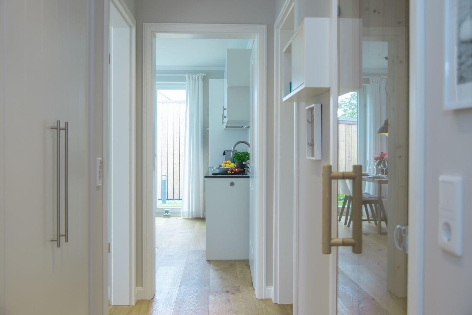 Die Wohnung liegt ebenerdig im Erdgeschoss und verfügt über eine Terrasse mit mittelgroßen Garten. Das Grundstück beinhaltet jeweils einen PKW-Stellplatz mit (ab spätestens August) einer Elektrozapfsäule sowie Fahrradständer. Die im nordischen Stil möblierten Wohnungen verfügen über massive Eichendielenböden, hochwertige tischlergearbeitete Küchen und Einbaumöbel sowie Bäder mit Yellow-Stone Fliesen. Eine Fußbodenheizung ist in allen Räumen vorhanden.