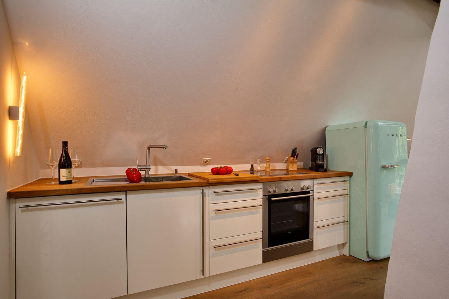 Die Küchenzeile wurde ansprechend ausgestattet und verfügt über zahlreiche Annehmlichkeiten, darunter ein Geschirrspüler, ein Backofen und liebevoll ausgewähltes Geschirr sowie nützliche Küchenutensilien. Unterhaltungsmöglichkeiten bieten Ihnen neben dem Kabel-TV auch der DVD-Spieler sowie das in der ganzen Wohnung nutzbare WLAN. Wohn- und Schlafraum wurden mit einem schönen Eichen-Holzboden ausgelegt.