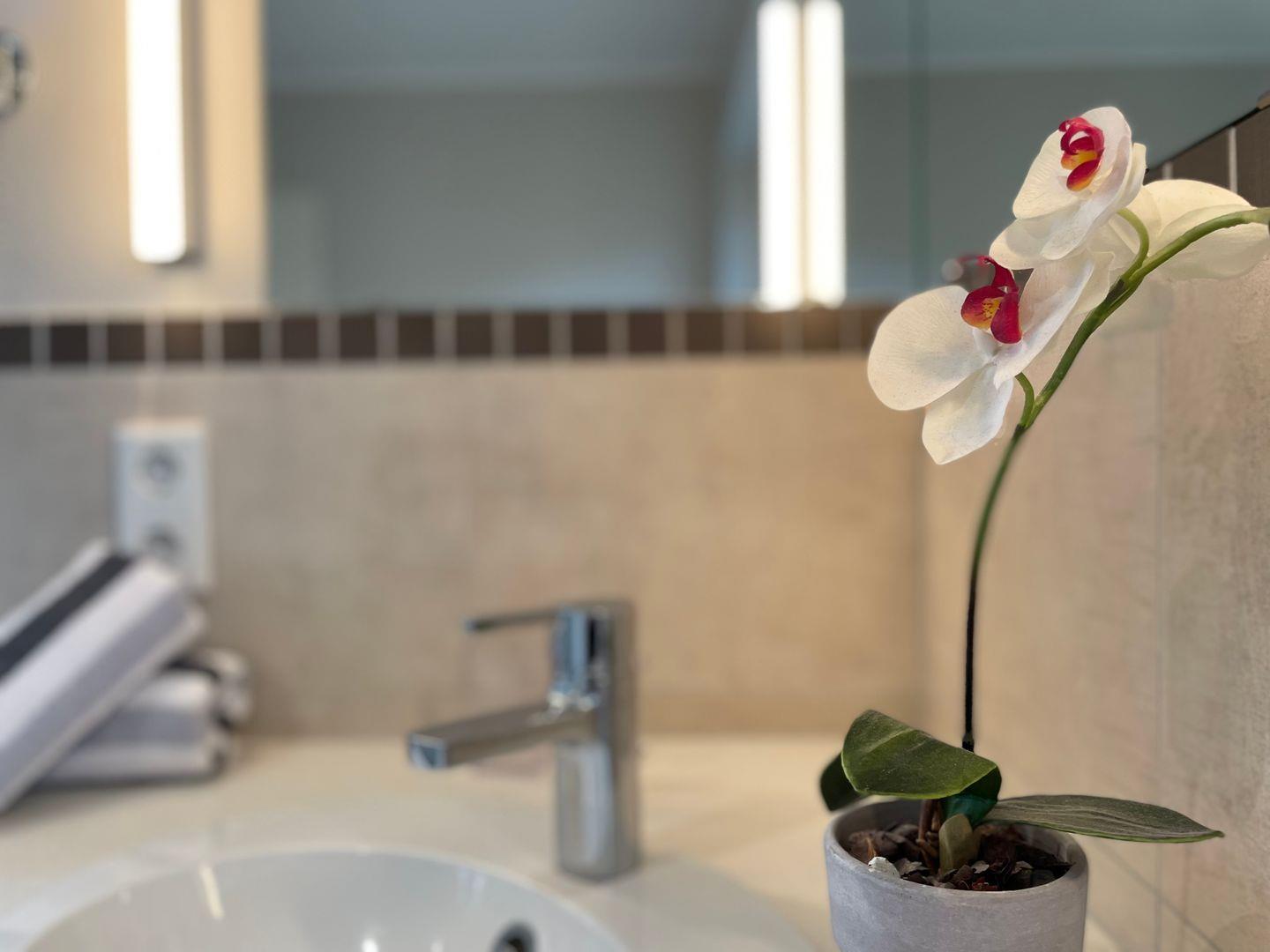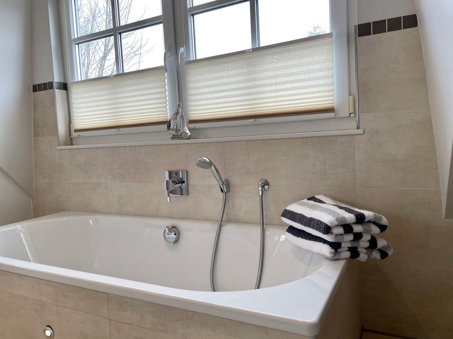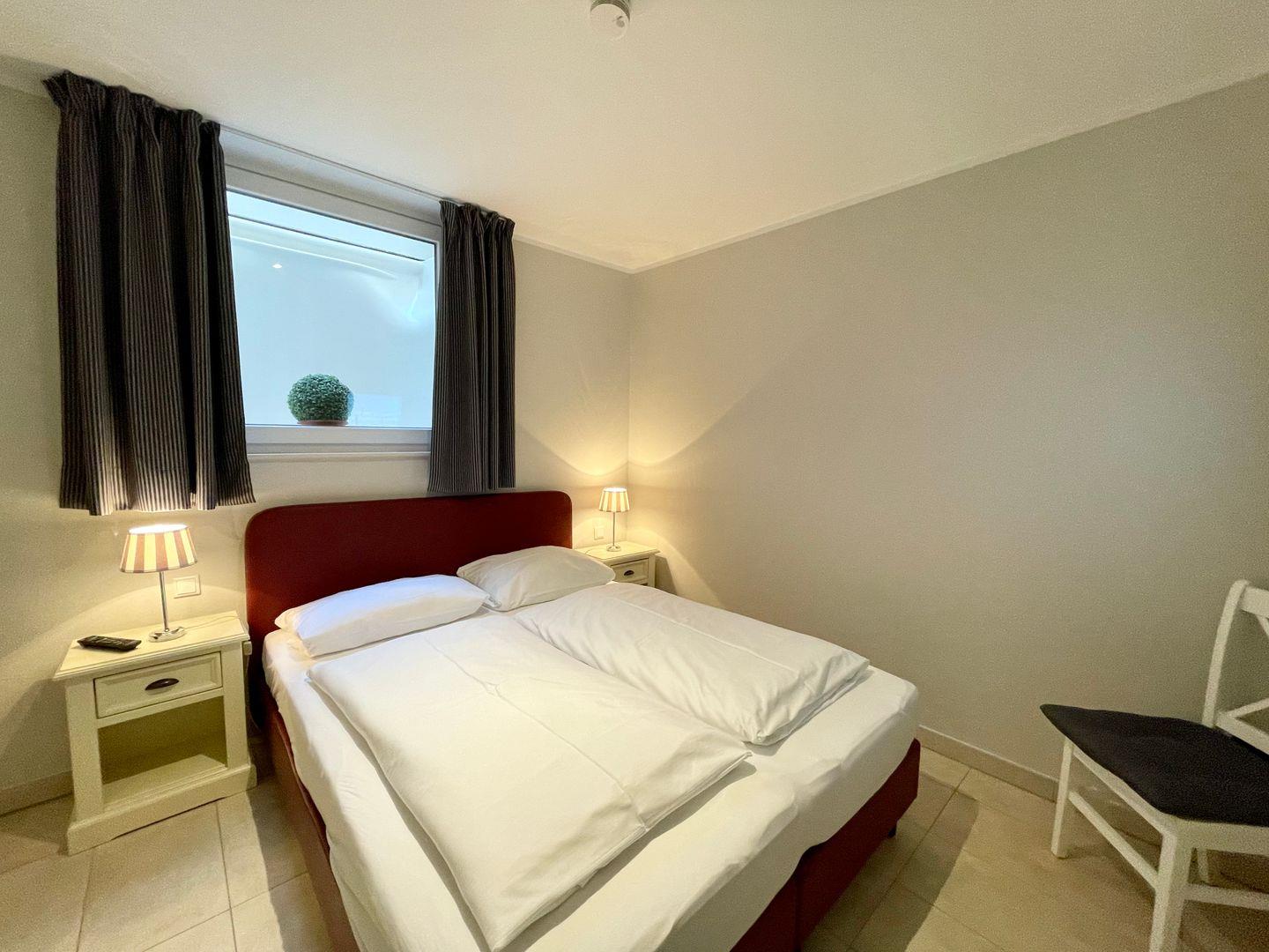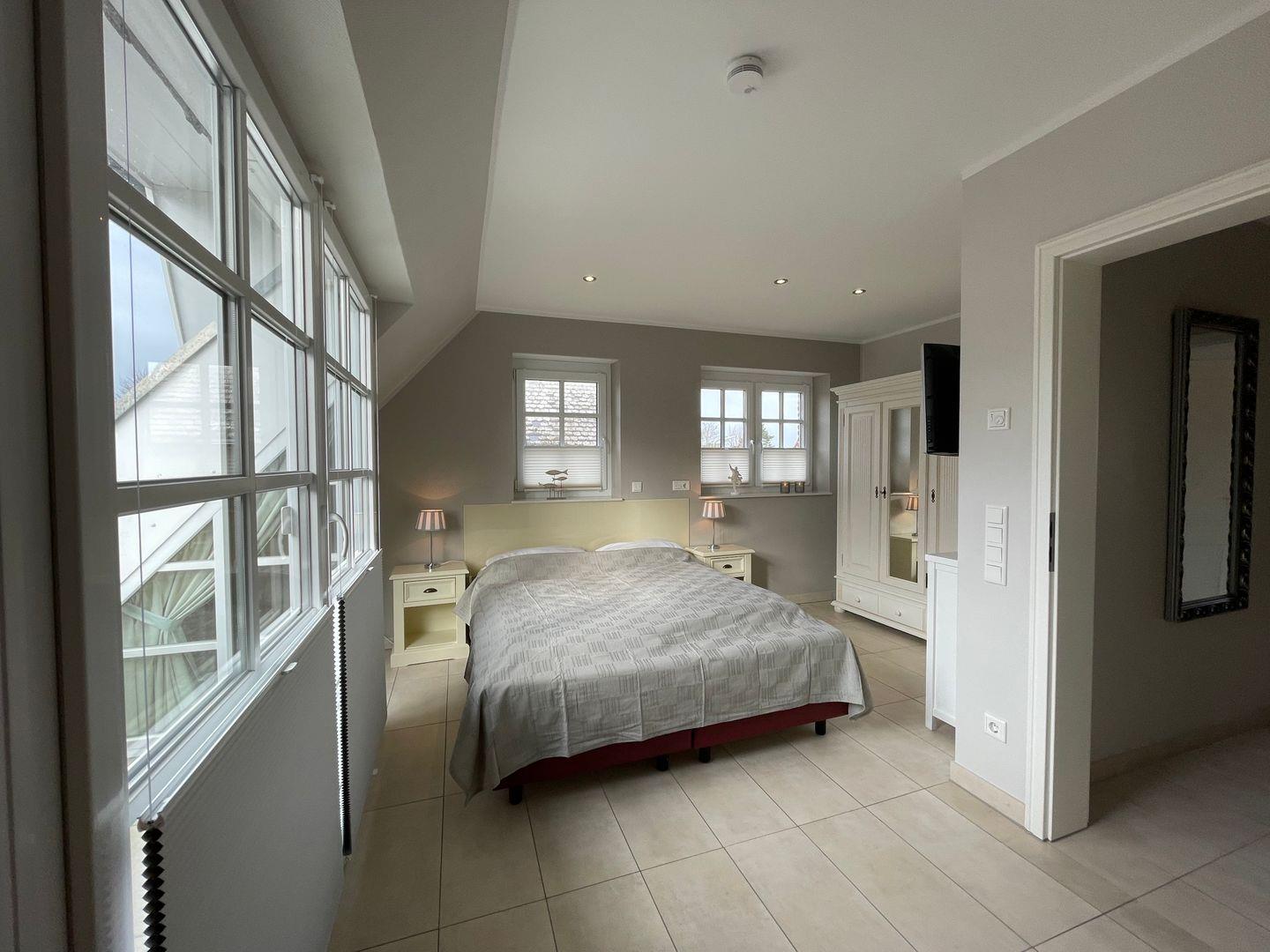 Die Badezimmer sind mit Doppelwaschtisch, einer Dusche nebst separater Badewanne, Make-up Spiegel und Fön ausgestattet. Insgesamt sind drei Vollbäder und eine zusätzliche Toilette im Haus vorhanden. Ein Schlafzimmer mit eigenem Balkon und Kaminofen befindet sich im ersten Stock des Hauses. Vom Erdgeschoss gelangen Sie über eine Treppe zu weiteren zwei Schlafräumen im UG. Alle drei Schlafzimmer sind mit Flatscreen TV ausgestattet.