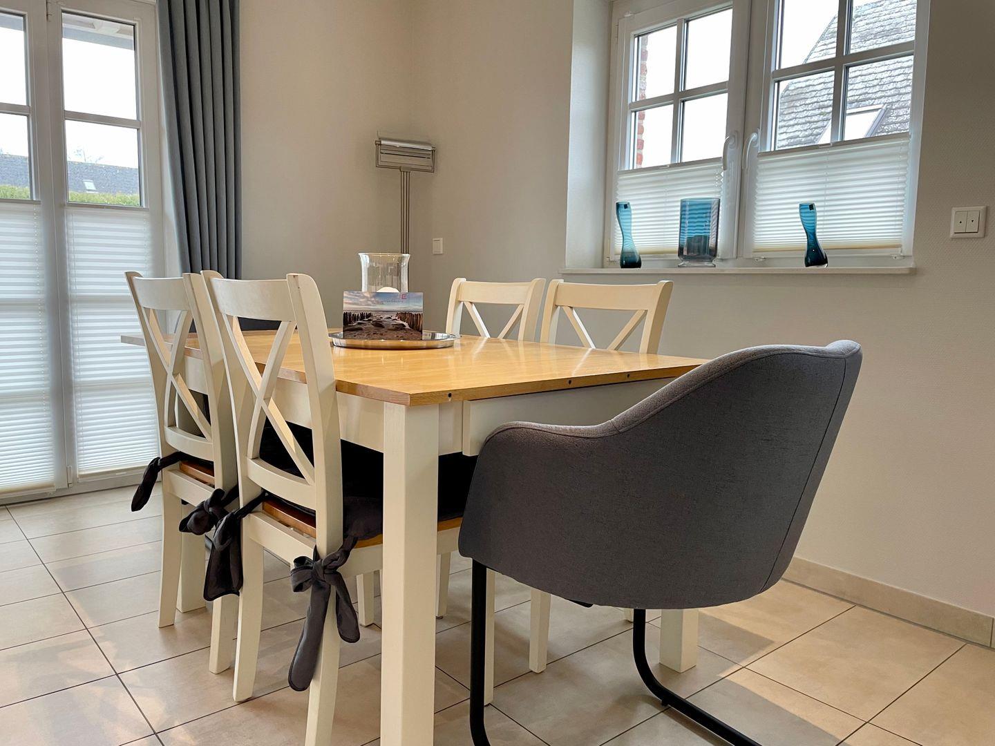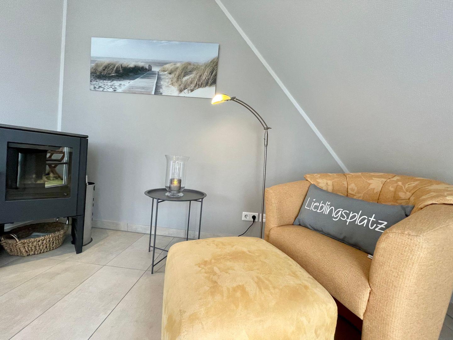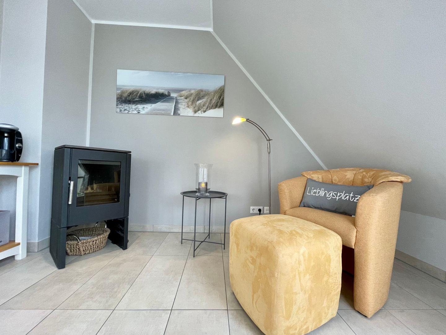 Der Wohnbereich im EG ist im hochwertigen Landhausstil mit Smart TV, DVD-Player, Hi-Fi-Anlage mit i-Pod Anschluss, WLAN-Internetzugang und Kaminofen ausgestattet. Hochwertig ausgestattete Einbauküche mit Kaffeevollautomat, Tassimo Kapselmaschine und Filterkaffeemaschine, Cerankochfeld, Geschirrspülmaschine, Backofen mit integrierter Mikrowelle und weiteren Extras.