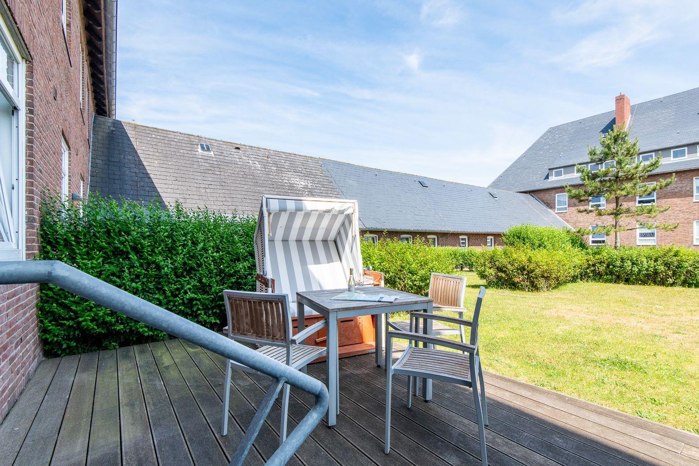 Die gemütliche Holzterrasse mit Tisch und Stühlen, sowie Zugang zur Rasenfläche, macht den Aufenthalt im Freien komfortabel. Von den Osterferien bis zu den Herbstferien befindet sich auf der Terrasse zusätzlich noch ein Strandkorb.