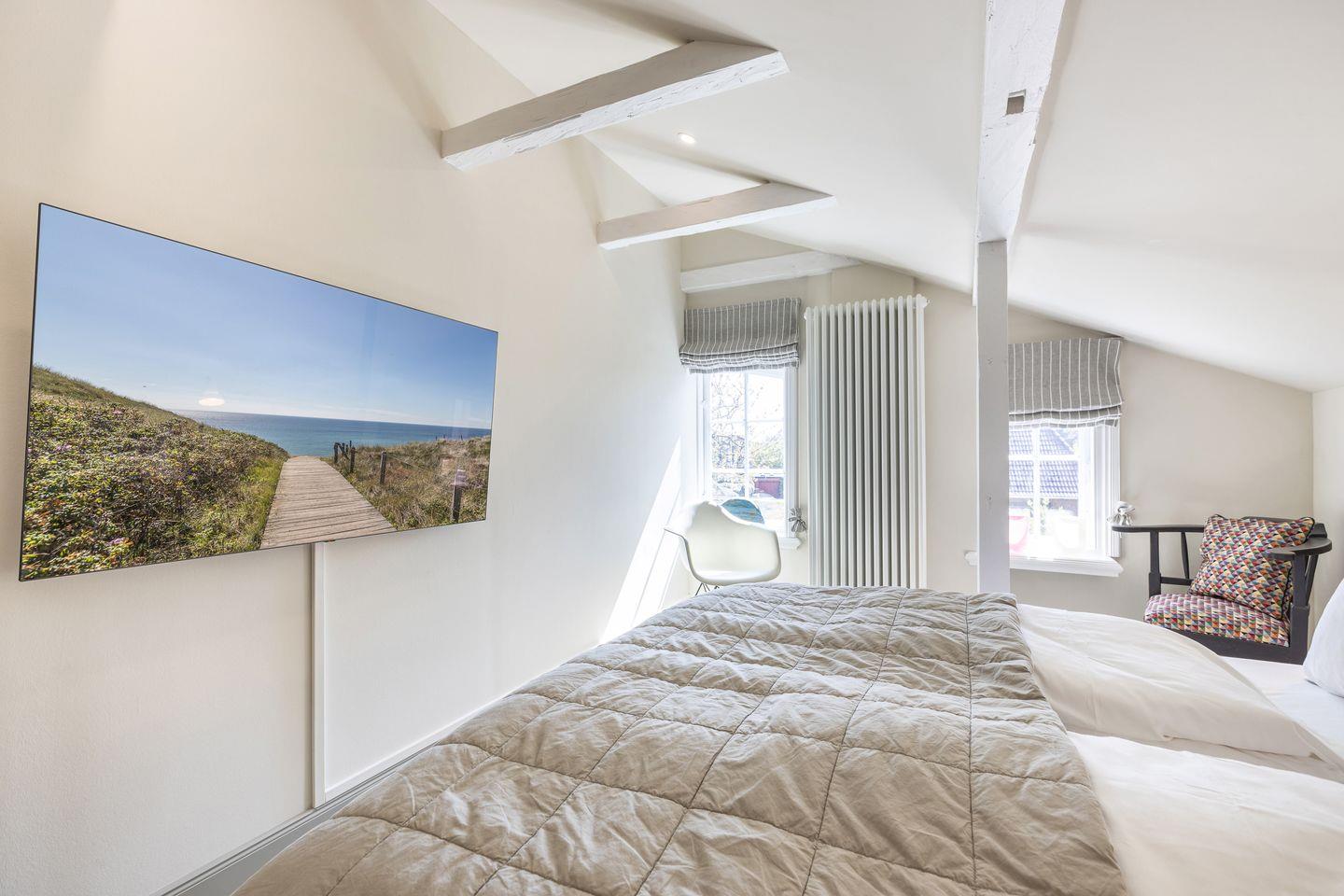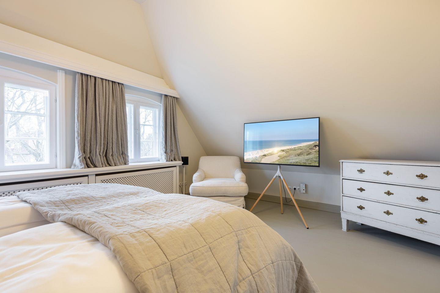 OG: zwei Schlafzimmer mit Doppelbett (180x200cm) und TV, ein Schlafzimmer mit zwei Einzelbetten (90x200cm). Ein Bad mit Dusche, Badewanne und WC. Ein Bad mit Sauna, Dusche und WC.