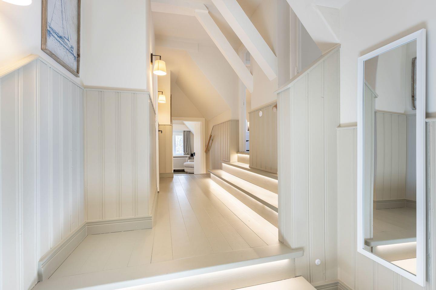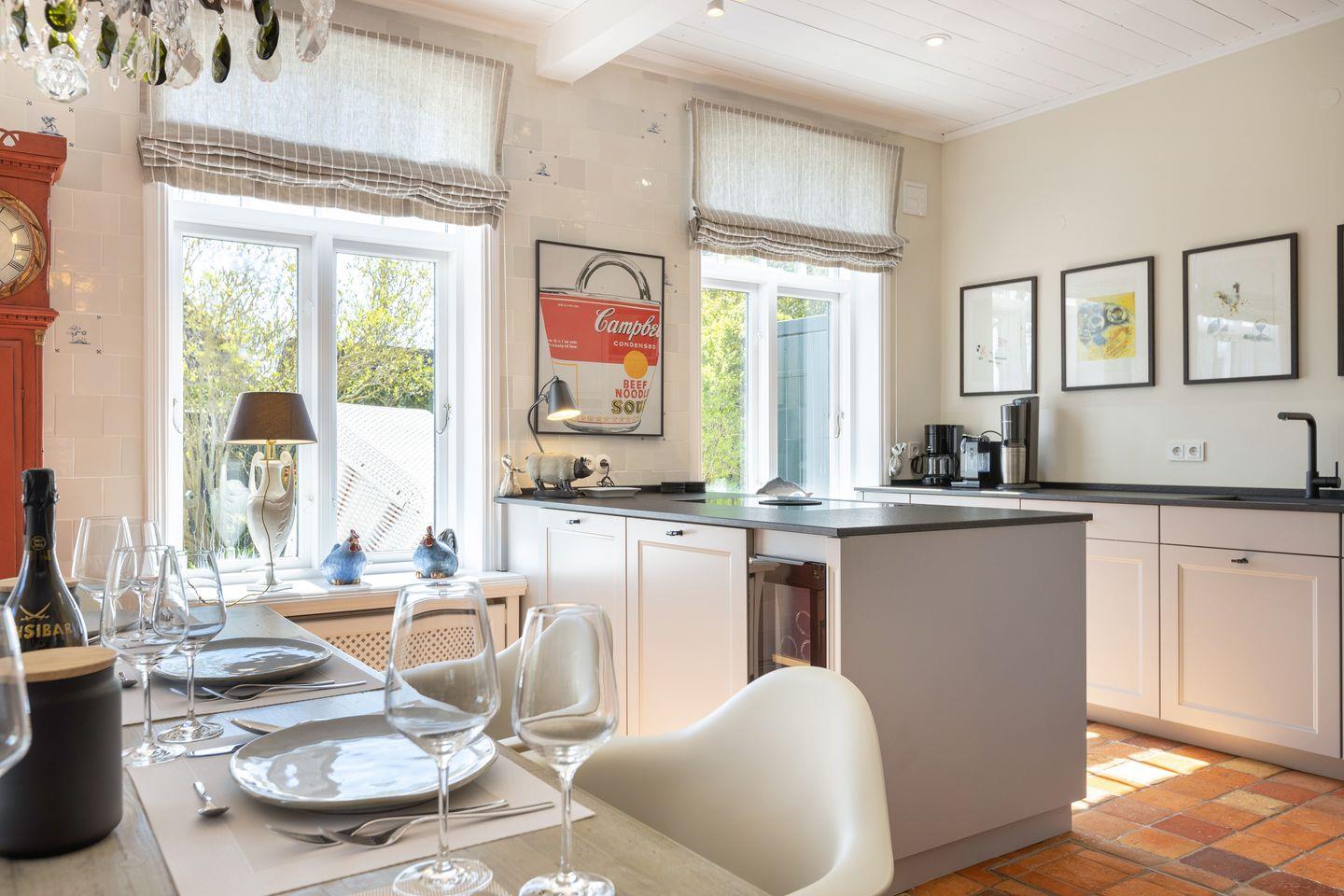 EG: Wohnraum mit Sitzecke, Kachelofen und Essbereich. Offene Küche mit Microwelle-Backofen-Kombi, Geschirrspüler, Induktionsherd, Nespresso-Maschine, Soda-Stream. Separates Fernsehzimmer und Bibliothek. Großer Garten mit Gartenmöbeln und Strandkorb (April-Oktober). Im Gartenhaus befindet sich eine zusätzliche Sauna.