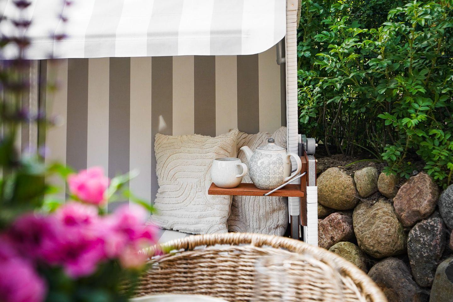Wohnzimmer mit Gaskamin, Essecke, offener Küche und direktem Zugang zur Terrasse mit Strandkorb und Gartenmöbeln, Gäste-WC, Garderobe