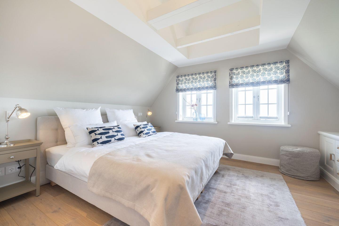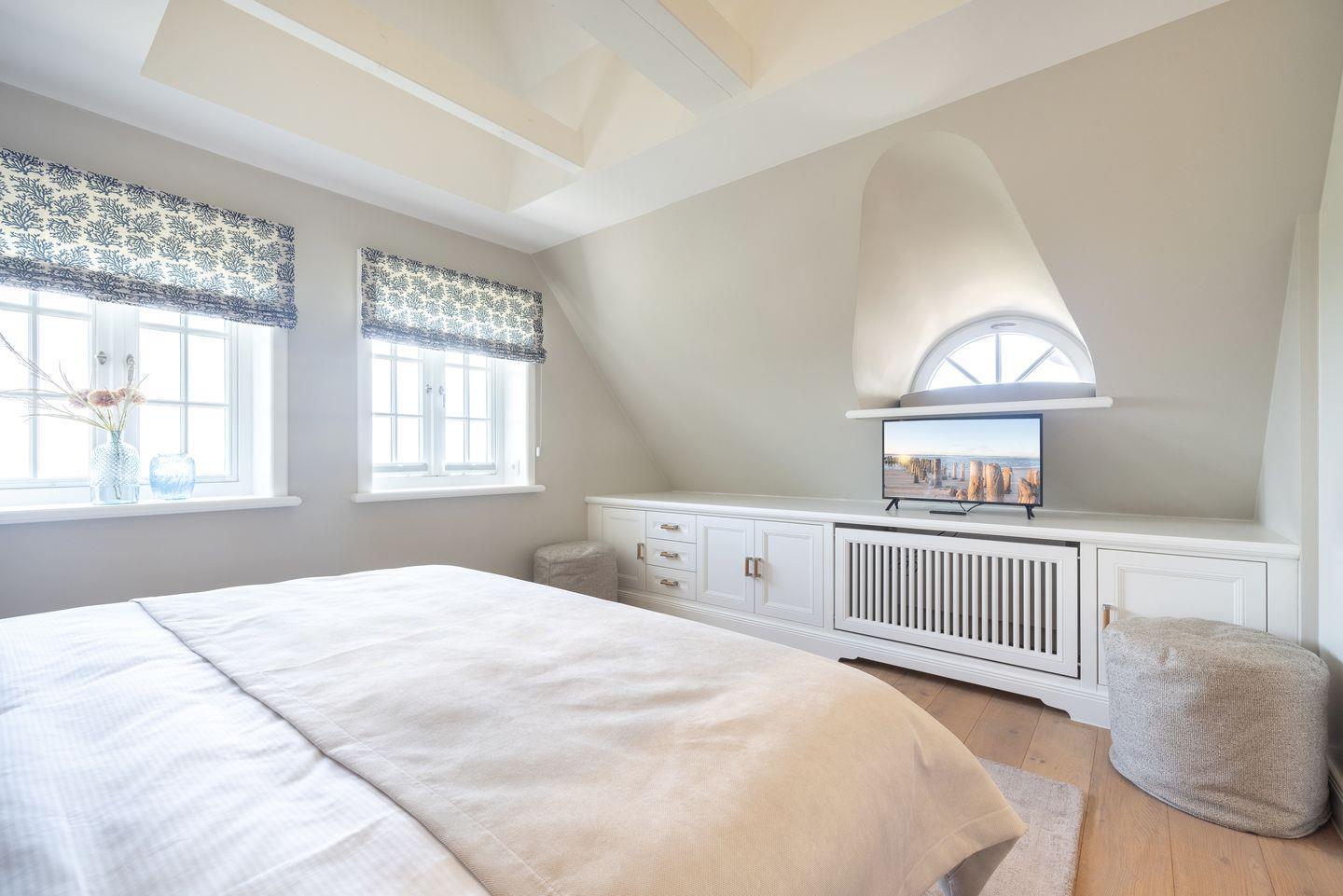 Die großzügigen Schlafzimmer sind mit hochwertigen Doppelbetten und TV ausgestattet und bieten maximalen Komfort. Das Hauptschlafzimmer mit Blick nach Osten lässt Sie den Morgen mit dem wunderschönen Wattenmeerblick begrüßen. Hochwertige Holzeinbauten unterstreichen den luxuriösen Charakter der geschmackvollen Einrichtung.