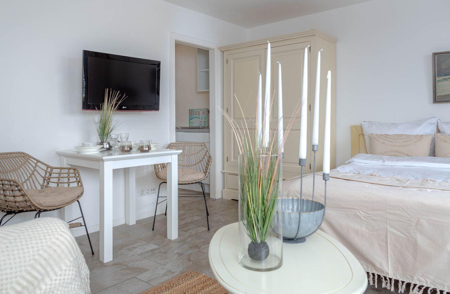 Das Appartement erstreckt sich über ca. 27qm und verfügt über ein modernes Duschbad sowie eine Küche mit Mikrowelle, Kühlschrank, Geschirrspüler und 2-Platten-Kochgelegenheit. Genießen Sie Ihr Frühstück doch einmal mit Meerblick!