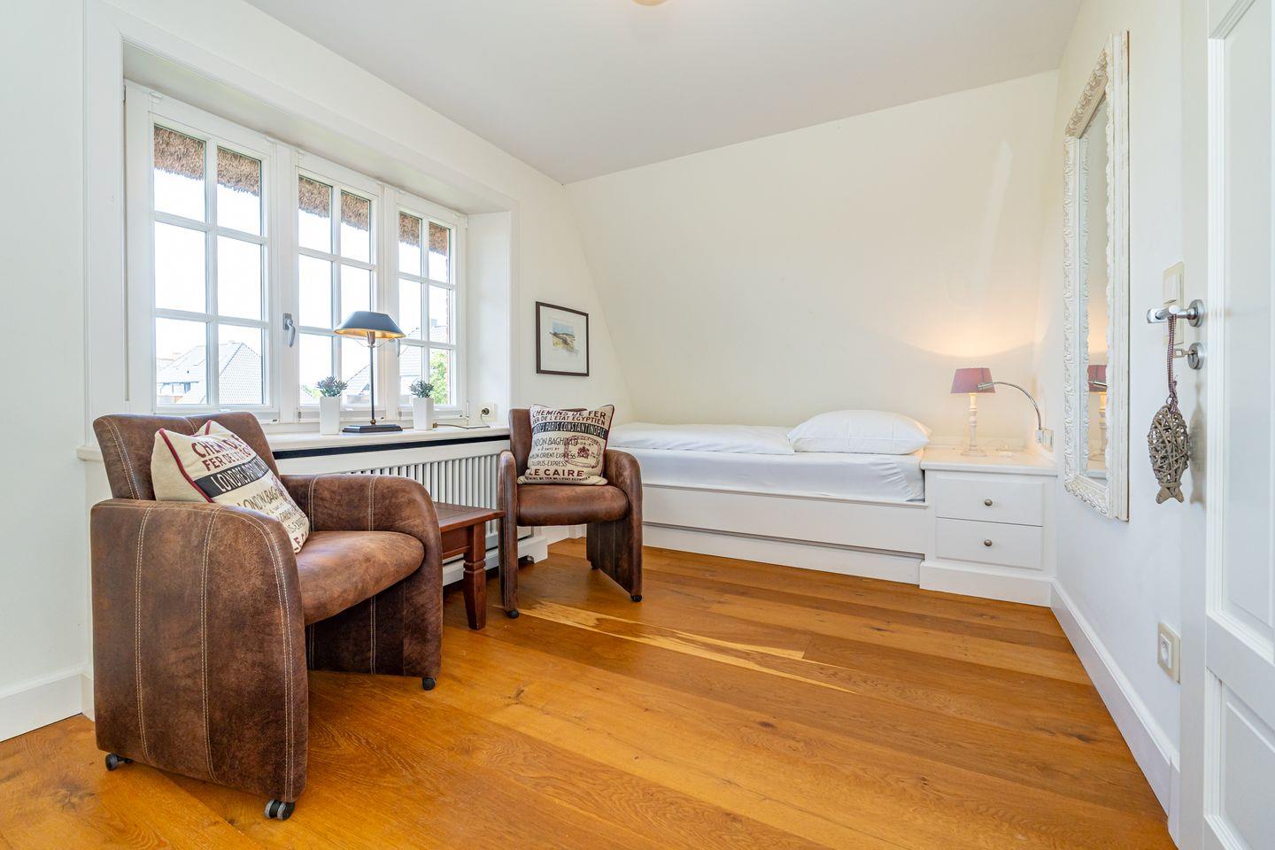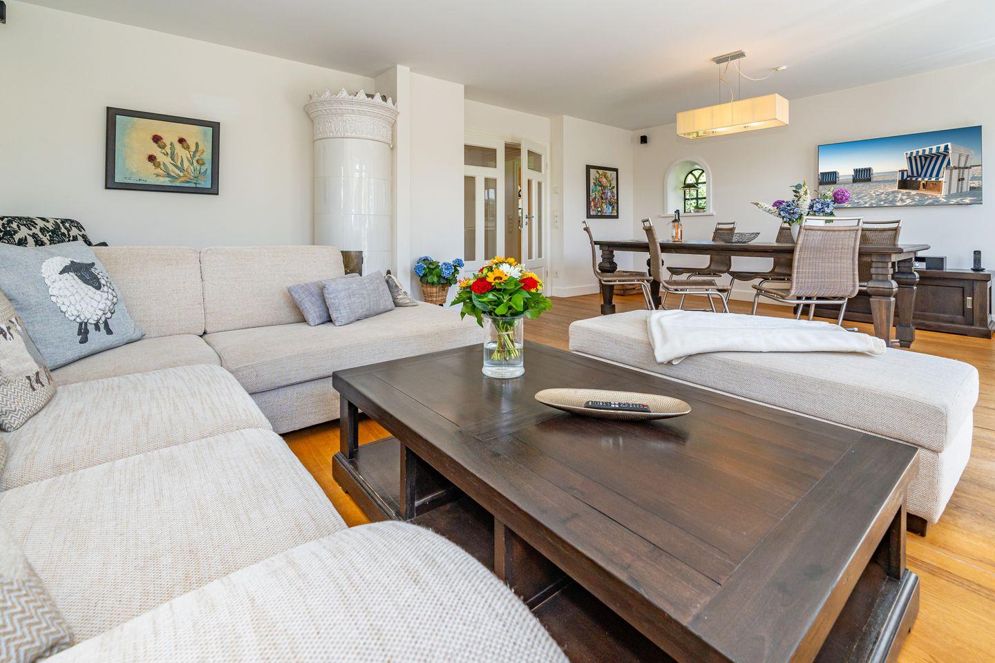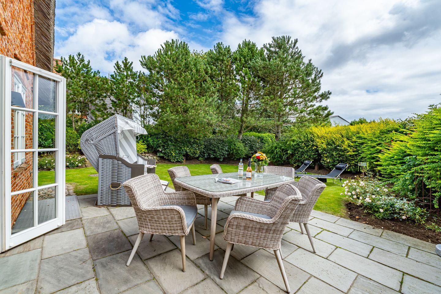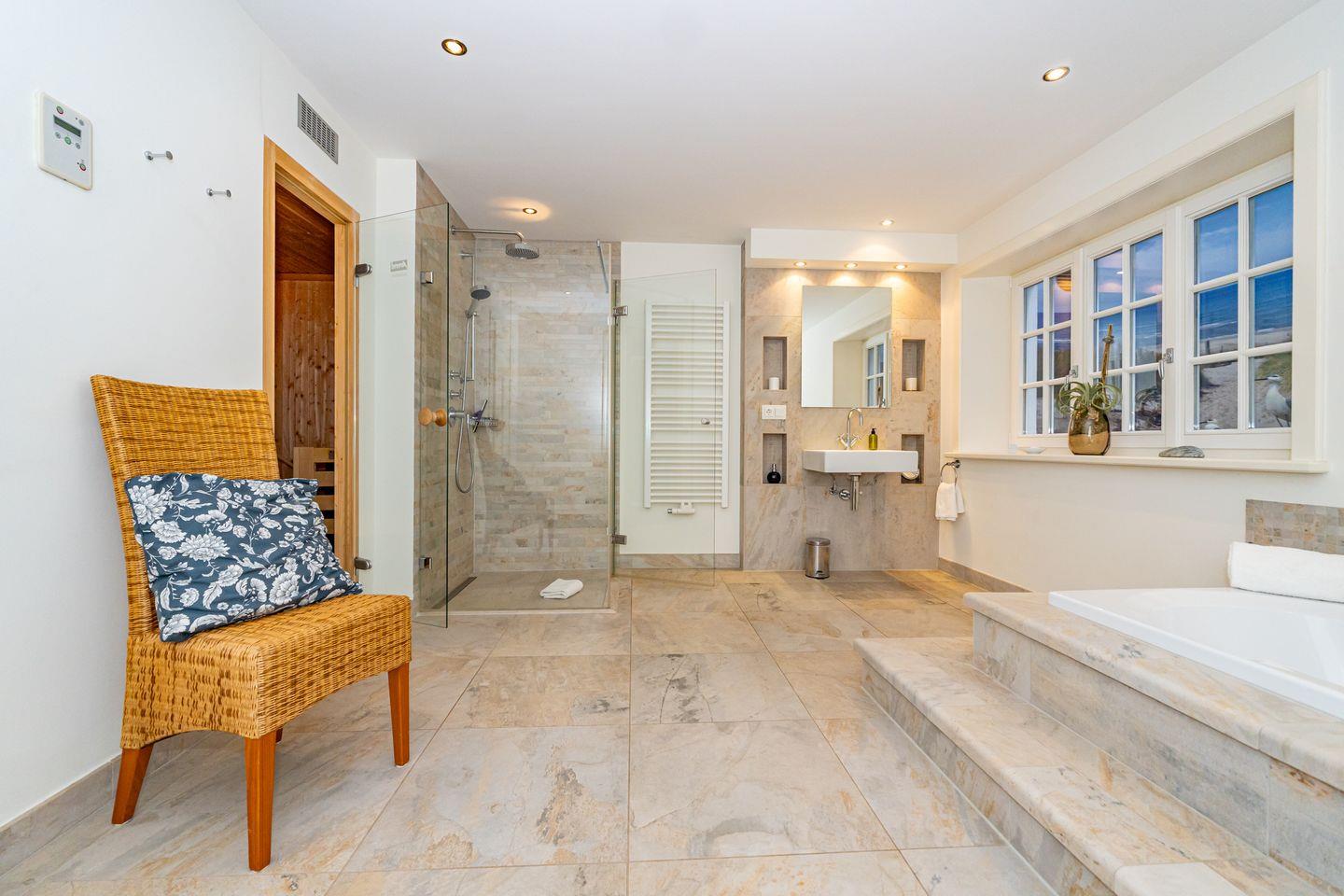 Das große Wohn/Esszimmer und die separate, vollausgestattete geschlossenen Küche laden dazu ein, gemütliche Stunden in geselliger Runde zu verbringen. Der hochwertige Holzfußboden sowie der Kachelofen sorgen für eine ganz besondere Atmosphäre, selbst bei stürmischem Wetter. Von hier aus gelangen Sie auch auf die Terrasse und den Garten. Ob Im eigenen Strandkorb oder auf den Sonnenliegen, wir versprechen Ihnen hier Syltfeeling pur. Ebenfalls im Erdgeschoss befindet sich ein Gäste WC. Im Untergeschoss gibt es neben dem Doppelschlafzimmer ein weiters Highlight, das große Badezimmer mit finnischer Sauna, Badewanne und Regendusche. Ein weiters Doppelschlafzimmer sowie ein Einzelschlafzimmer befinden sich ersten Obergeschoss. Hier stehen Ihnen zwei Badezimmer mit Dusche und WC zur Verfügung. Ein eigener Parkplatz befindet sich vor dem Ferienhaus.