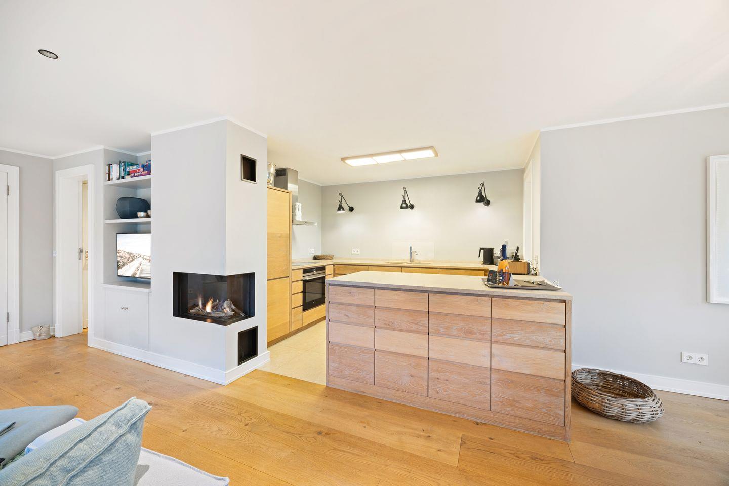 Das stilvolle Wohnzimmer lädt mit einem gemütlichen Lounge-Sofa vor dem Gas-Kamin zu entspannten Stunden ein. Der großzügige Essbereich ist ideal für gemeinsame Mahlzeiten und bietet einen direkten Zugang zur Terrasse, die mit ihrem Blick über das Wattenmeer begeistert.