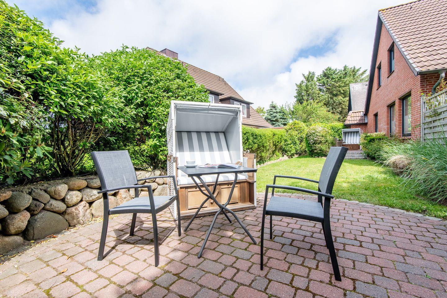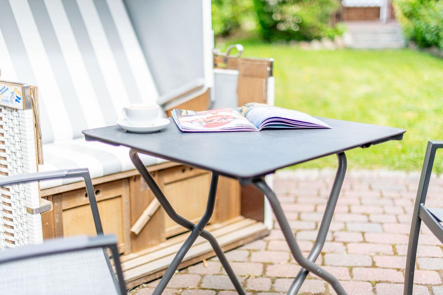 Ein besonderes Highlight ist der zugehörige sonnige Gartenteil im vorderen Bereich der Anlage. Genießen Sie die frische Luft im bequemen Strandkorb oder nehmen Sie Platz an dem Tisch mit zwei Stühlen samt Auflagen – perfekt für ein Frühstück im Freien oder einen entspannten Nachmittag in der Sonne.