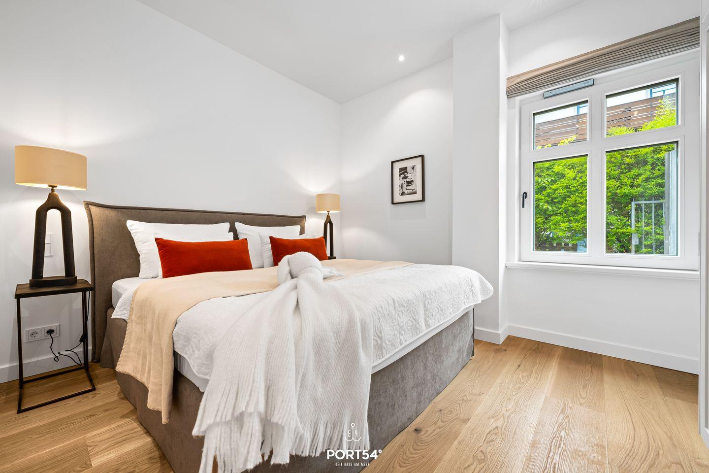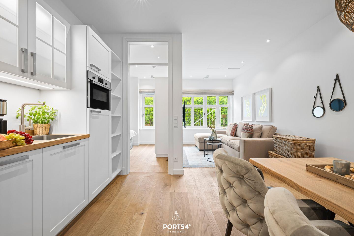 Mit einer großzügigen Grundfläche von 43 m² bietet die im Erdgeschoss gelegene Ferienwohnung ausreichend Platz für bis zu drei Personen. Die lichtdurchfluteten Räume sind geschmackvoll eingerichtet und die offene Küche, die zum Wohnzimmer hin gestaltet ist, lädt dazu ein, kulinarische Köstlichkeiten zuzubereiten. Hier finden Sie alle notwendigen Geräte wie einen Elektro-Herd mit Induktionskochfeld, einen Backofen, eine Spülmaschine, einen Kühlschrank mit Gefrierfach und vieles mehr. Das Schlafzimmer ist mit einem gemütlichen Doppelbett, Verdunkelungsmöglichkeiten und einem Smart TV ausgestattet. Einen weiteren Schlafplatz bietet die gemütliche Schlafcouch (Maße: 120x184cm), aufgrund der Größe empfehlen wir diese nur für Kinder.