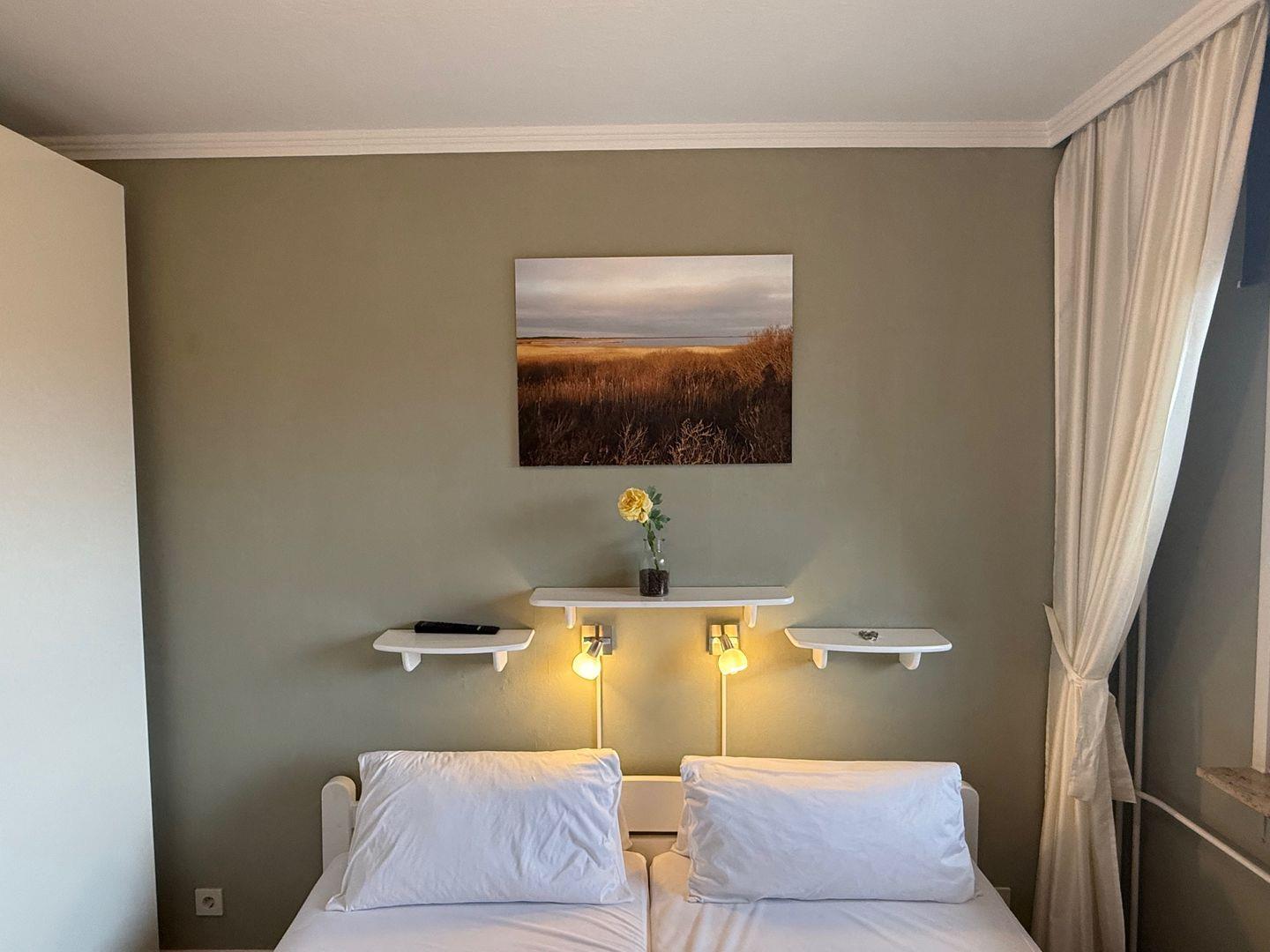Ein Schlafzimmer mit einem angenehmen Ambiente garantiert erholsame Nächte. Hier stehen Betten mit frischer Bettwäsche bereit. Das moderne Badezimmer wartet mit einer Dusche, einem WC und weiteren praktischen Elementen auf. Handtücher und Föhn sind ebenfalls vorhanden.