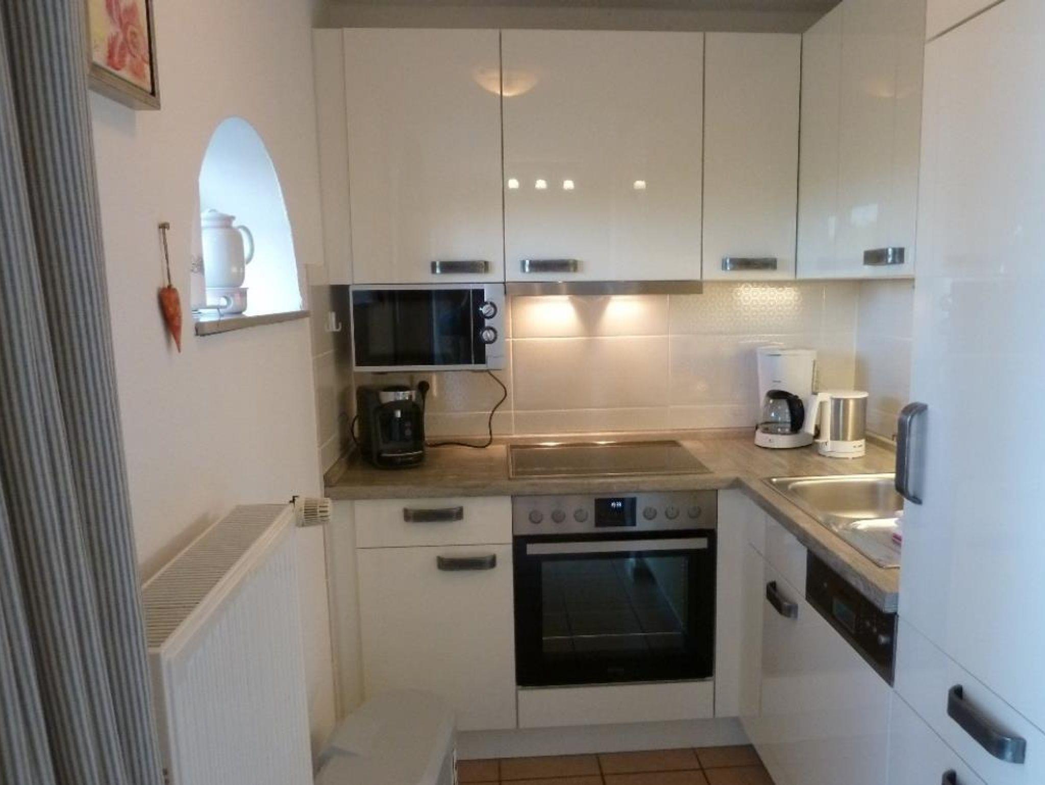 Die schöne Landhausküche liegt in einer Nische und ist zum Wohnraum hin offen.