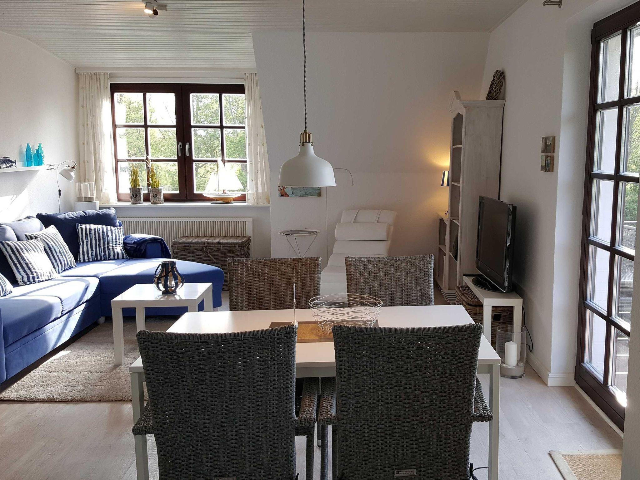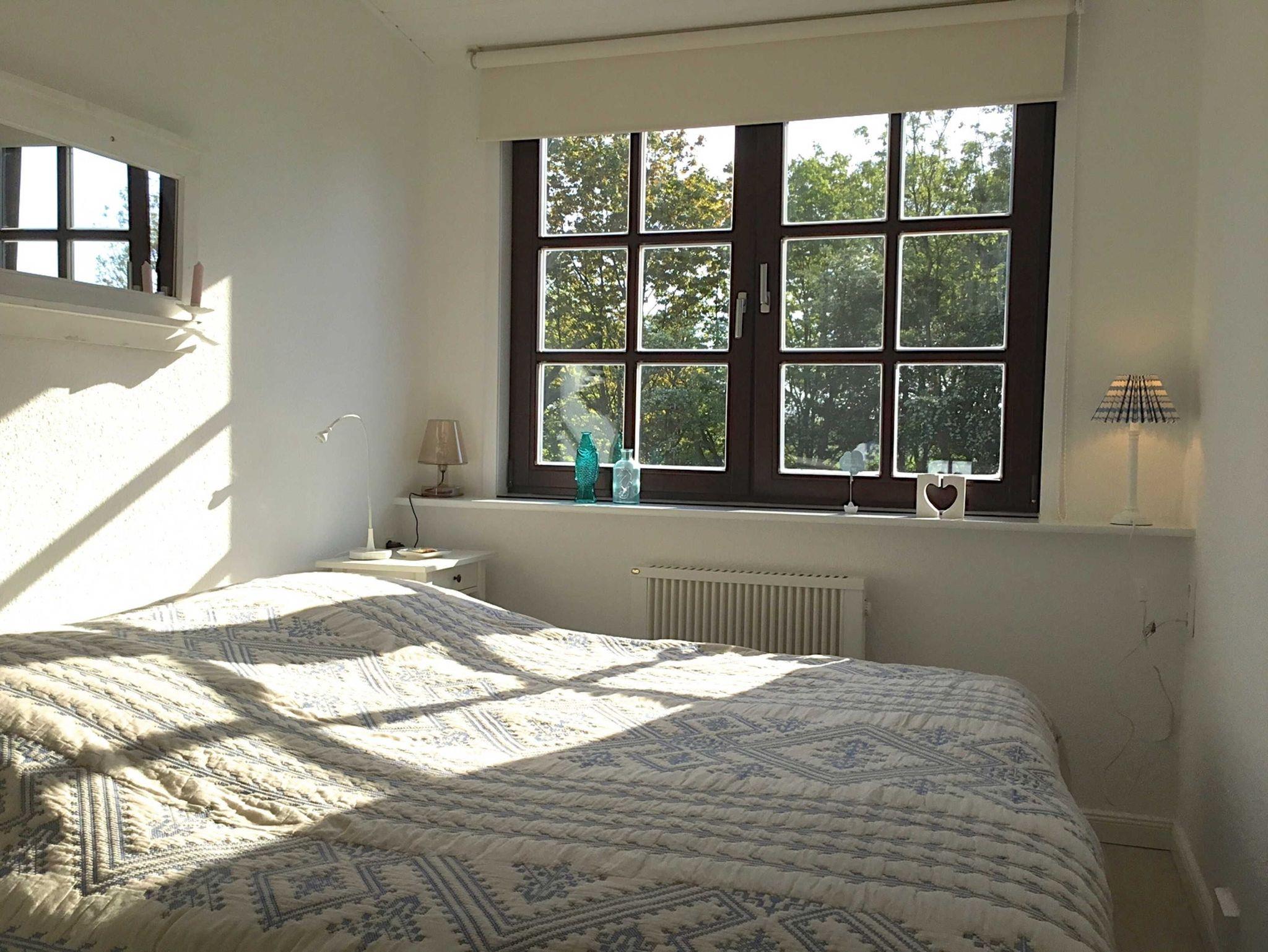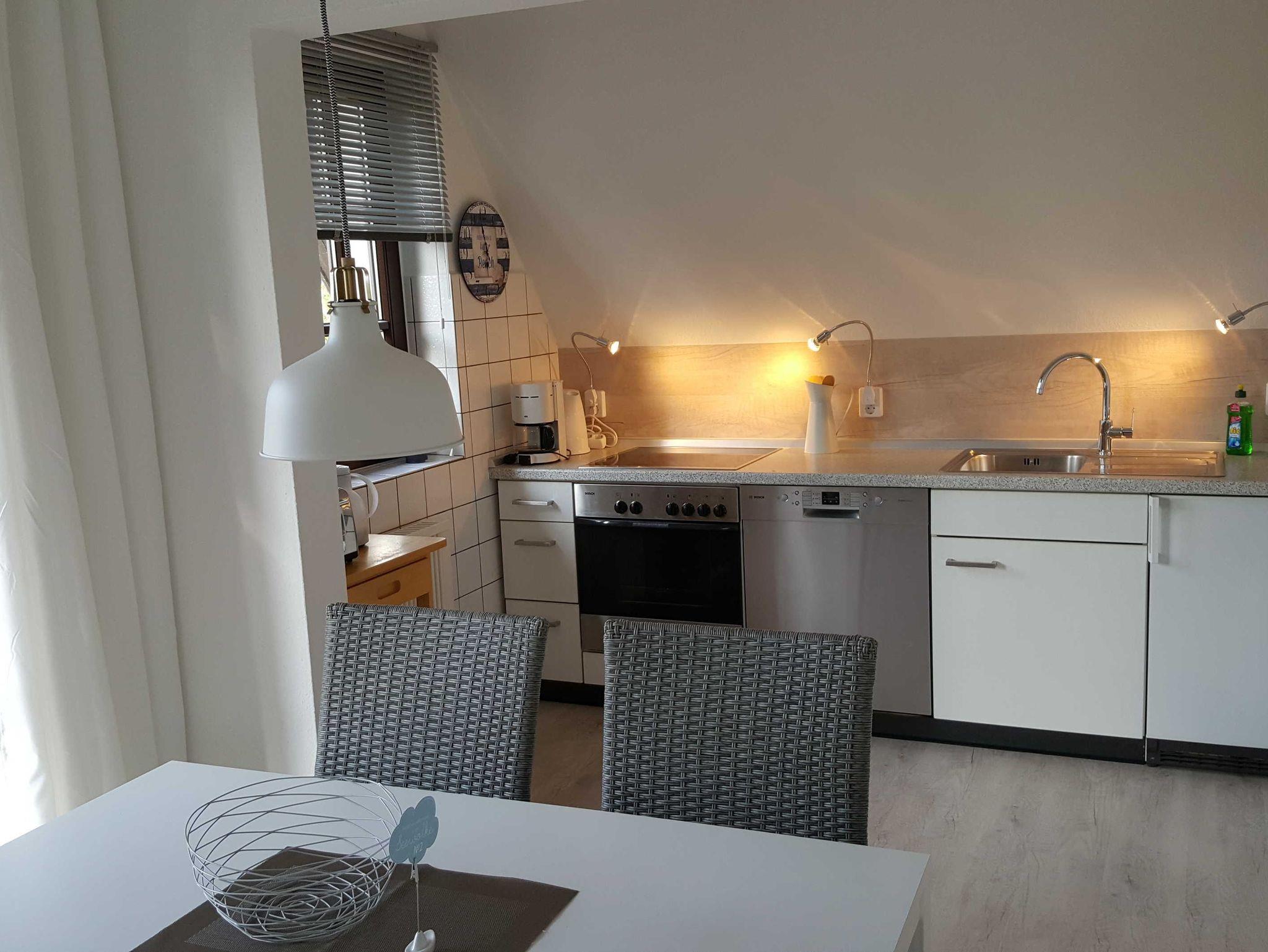 SEEWOLKE N° 2 besteht aus einem Wohn-/Esszimmer mit neuem, ganz modernem Schlafsofa (1,40 x 2,00 m), einem Schlafzimmer mit Swiss-Flex Doppelbett, einer voll ausgestatteten offenen Küche mit Fenster mit 4 Platten Ceranfeld-Herd, Backofen, Geschirrspüler, Kühlschrank mit Gefrierfach und Mikrowelle sowie ausreichend hochwertigem Geschirr und Gläsern (8-fach) , Töpfen etc., einem Flur, einem komplett modernisierten Duschbad und einem praktischen Abstellraum mit Waschmaschine. Gegen störende Mücken in der Nacht befinden sich an vielen Fenstern Insektenschutzrahmen.