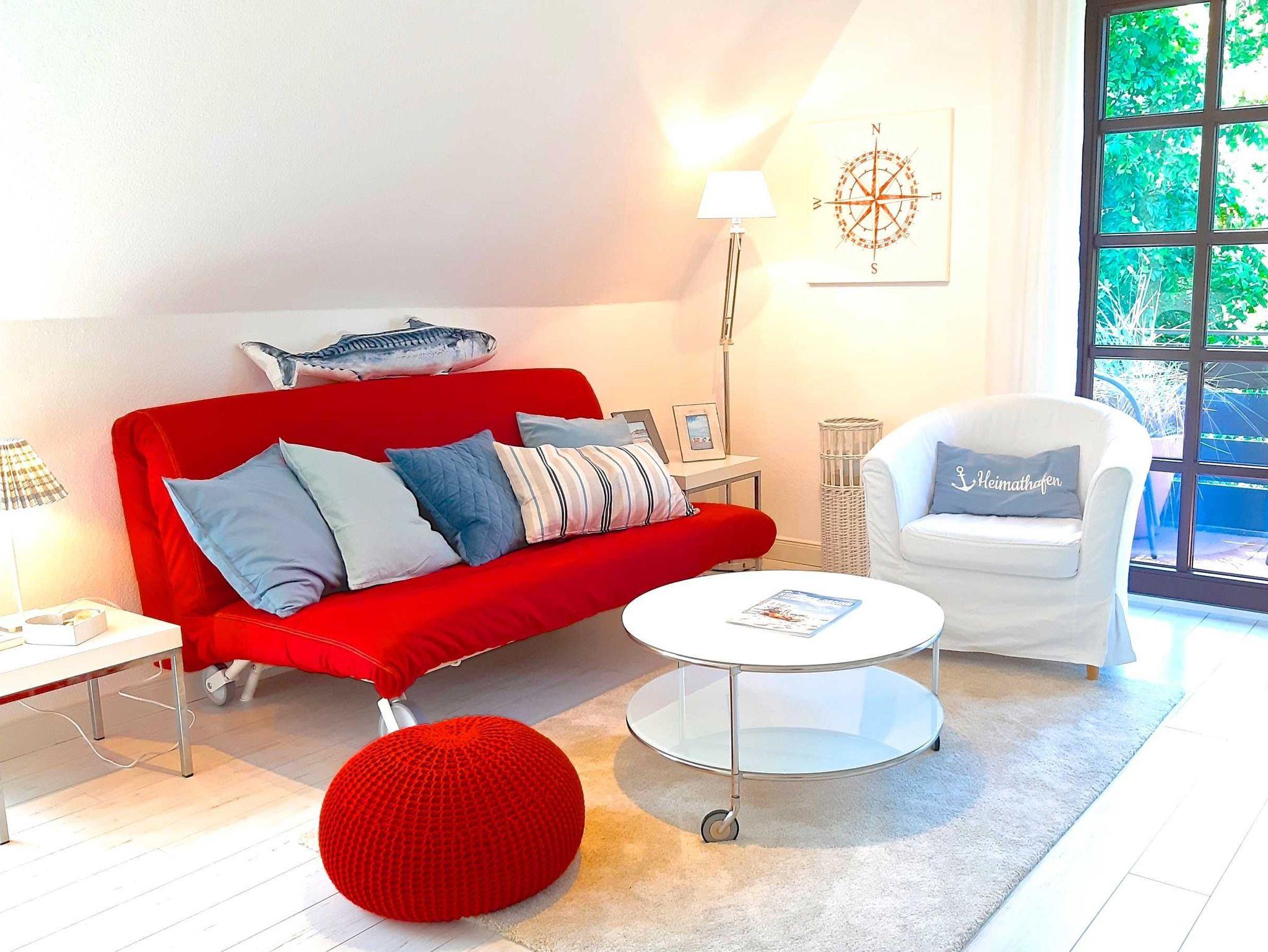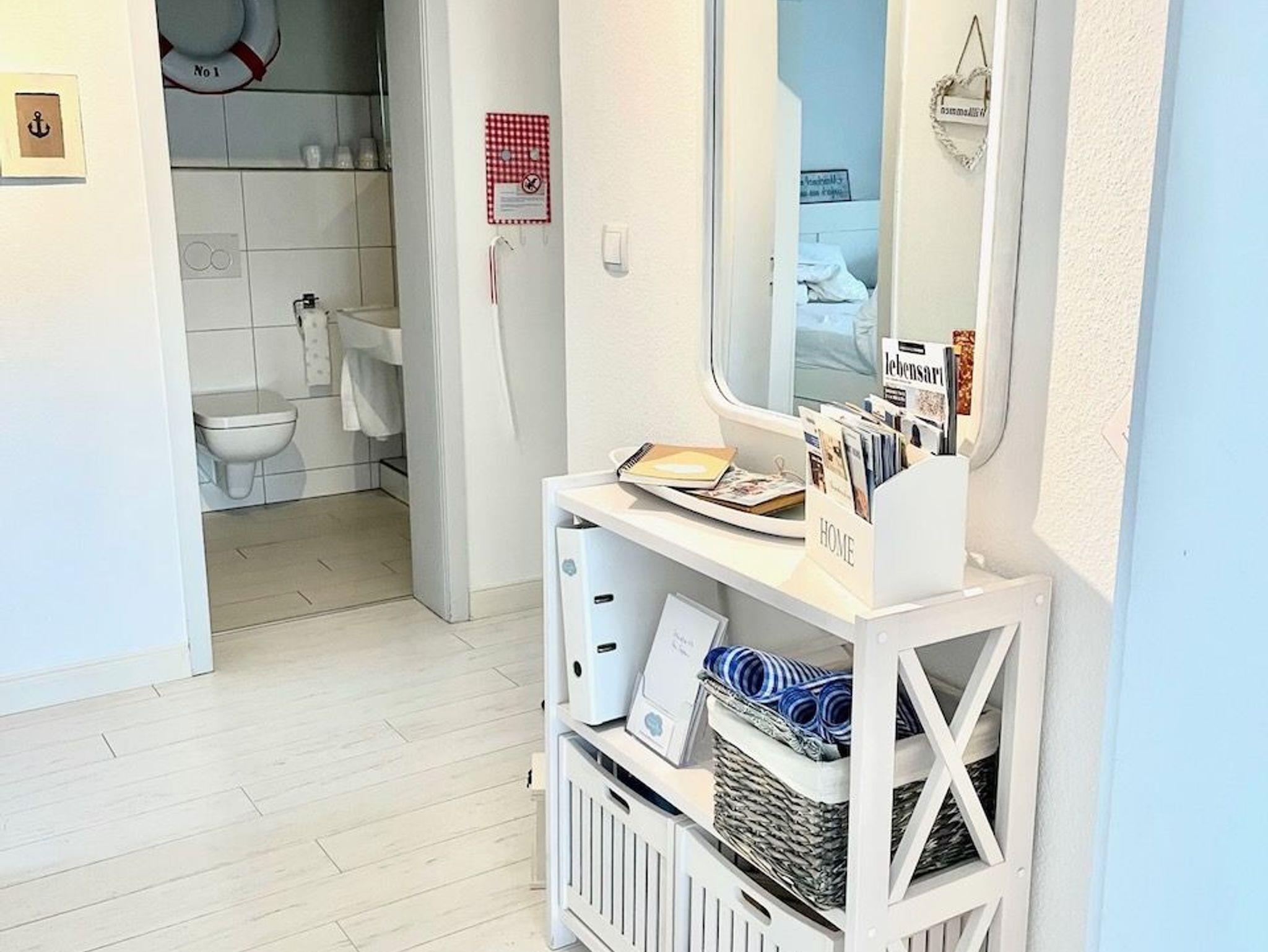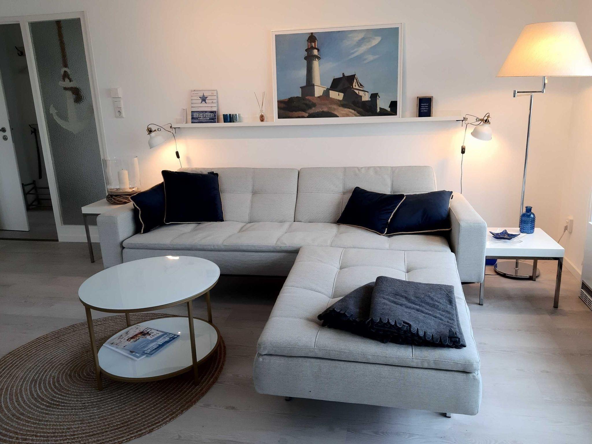 Die ganze Wohnung ist mit hellem, nordisch anmutendem Fußboden ausgelegt und in Weiß mit maritimen Elementen gehalten.