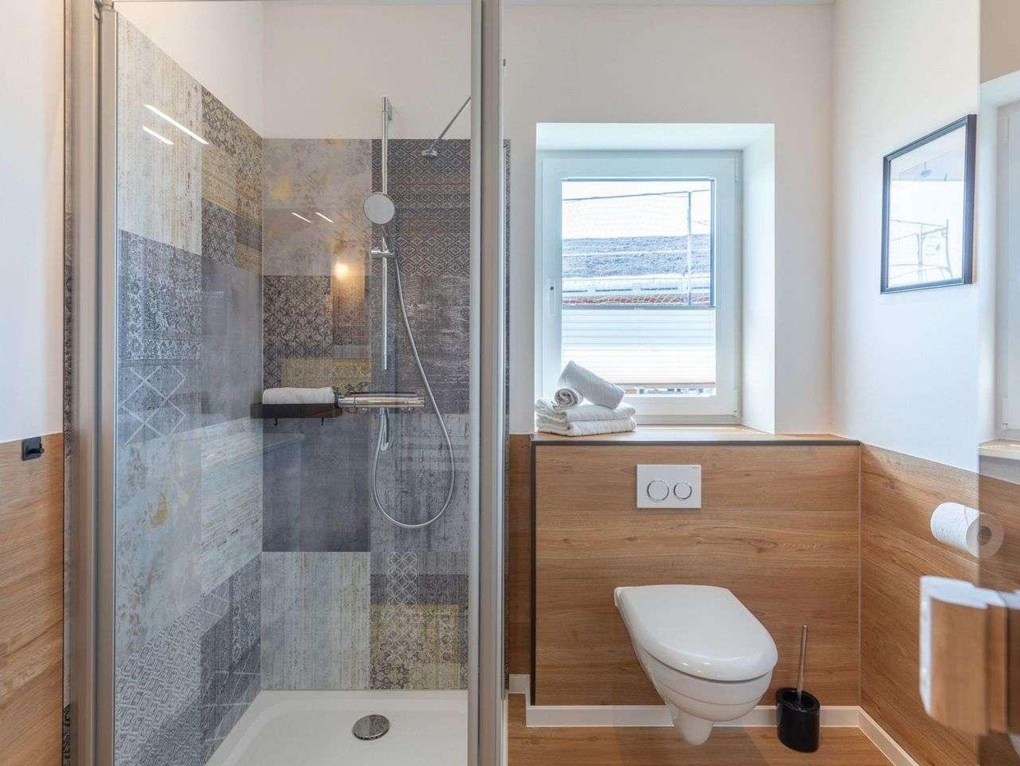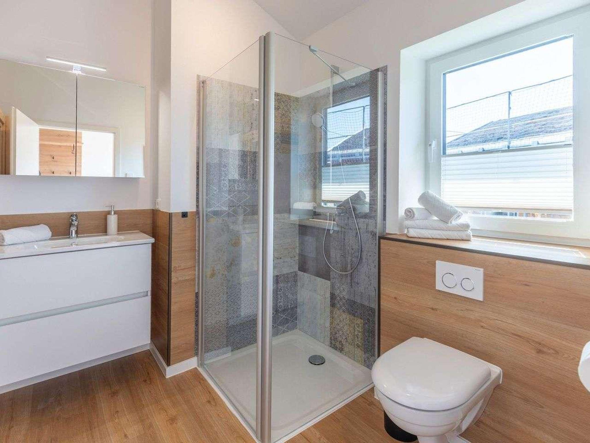 Ein modernes Badezimmer mit bodengleicher Dusche, WC und Sauna sorgen für besonderen Komfort.
