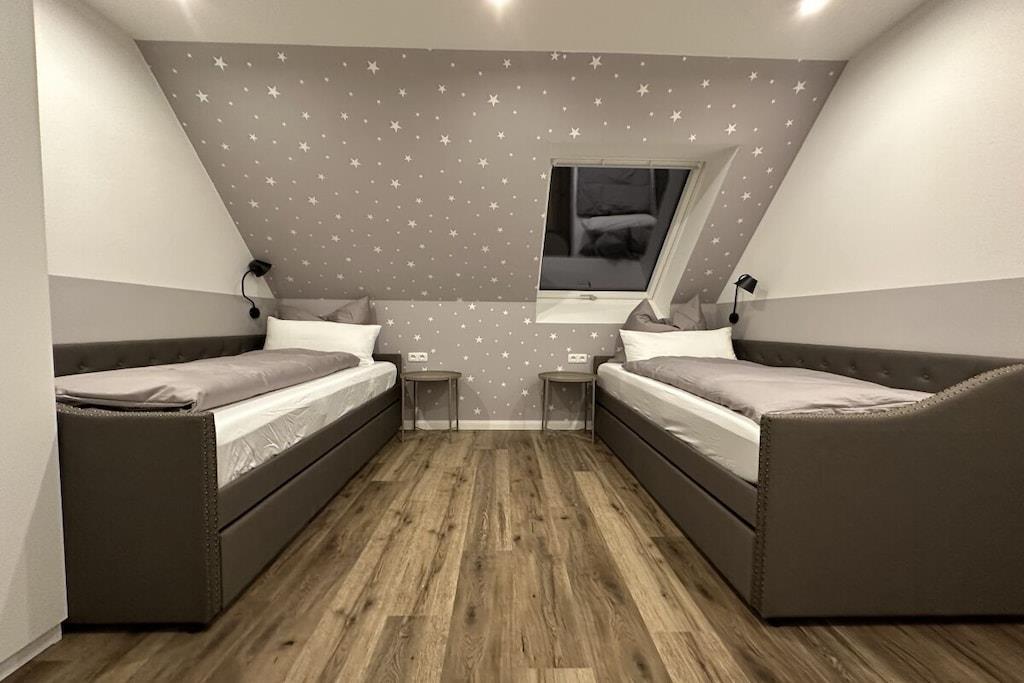 Willkommen in unseren Ferienhaus Eiderhuus in Tönning. Das Doppelhaus wurde im Jahr 2023 errichtet und mit liebevoller Hingabe eingerichtet, um Ihnen auf je 110 Quadratmetern Platz für 1-6 Personen einen unvergesslichen Urlaub nahe der Nordsee zu bieten. Der wunderbar lichtdurchflutete Wohnraum des Ferienhauses schafft eine behagliche Atmosphäre für gemeinsame Stunden mit Familie, dem Partner oder Freunden. Das einladende Sofa lädt zum Entspannen ein, der Esstisch bietet Platz für gesellige Mahlzeiten, und die voll ausgestattete Küche ermöglicht es Ihnen, kulinarische Köstlichkeiten zuzubereiten. Das „Eiderhuus“ heißt nicht nur Menschen herzlich willkommen, sondern auch Ihre vierbeinigen Begleiter, da Haustiere hier gerne gesehen sind. Die Weitläufigkeit des "Eiderhuus" zeigt sich ebenfalls im Außenbereich. Auf der großzügigen Terrasse mit dem dazugehörigen Garten erwartet Sie eine behagliche Sitzecke, ideal, um die letzten Sonnenstrahlen des Tages zu genießen. Ein vorhandener Grill lädt zu entspannten Abenden im Freien ein. Das Ferienhaus verfügt über insgesamt drei Schlafzimmer, jeweils ausgestattet mit einem hochwertigen Boxspringbett, sowie ein Zimmer mit zwei Einzelbetten. Im dritten Stock befinden sich zwei Einzelbetten, die idealerweise zu einem Doppelbett umgestaltet werden können. Bei uns finden Sie den erholsamen Schlaf, den Sie während Ihres Urlaubs an der Nordseeküste benötigen. Im Erdgeschoss befindet sich ein Badezimmer mit einer bodengleichen Dusche, während sich das zweite Badezimmer im ersten Stock mit einer Dusche und einer freistehenden Badewanne auszeichnet. Zusätzlich steht Ihnen eine großzügige Sauna zur Verfügung, um erholsame Stunden zu verbringen. Darüber hinaus haben Sie ab Ostern die Möglichkeit, optional das identische Ferienhaus Landhuus für eine Anreise mit 12 Personen zu buchen, sofern verfügbar. Bitte haben Sie Verständinis, dass bei einer Buchung unter 5 Tagen Zusatzkosten anfallen können. In Tönning wird eine Kurabgabe erhoben. Die Kurabgabe beträgt je Tag in der Zeit vom 15. Mai bis 30. September 2,20 EURO In der Zeit vom 01. April bis 14. Mai beträgt die Kurabgabe 0,90 EURO am Tag. Ermäßigungen für die Kurabgabe: Schüler und Auszubildende, die das 18. Lebensjahr vollendet haben, zahlen 0,90 EURO. Für Schwerbehinderte, die eine Behinderung von 50 % und mehr nachweisen, wird die Kurabgabe auf 50 % ermäßigt. Dies gilt auch für die erforderliche Begleitperson.