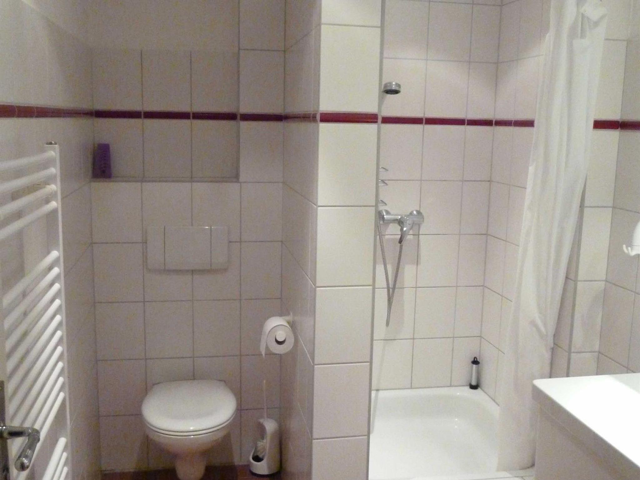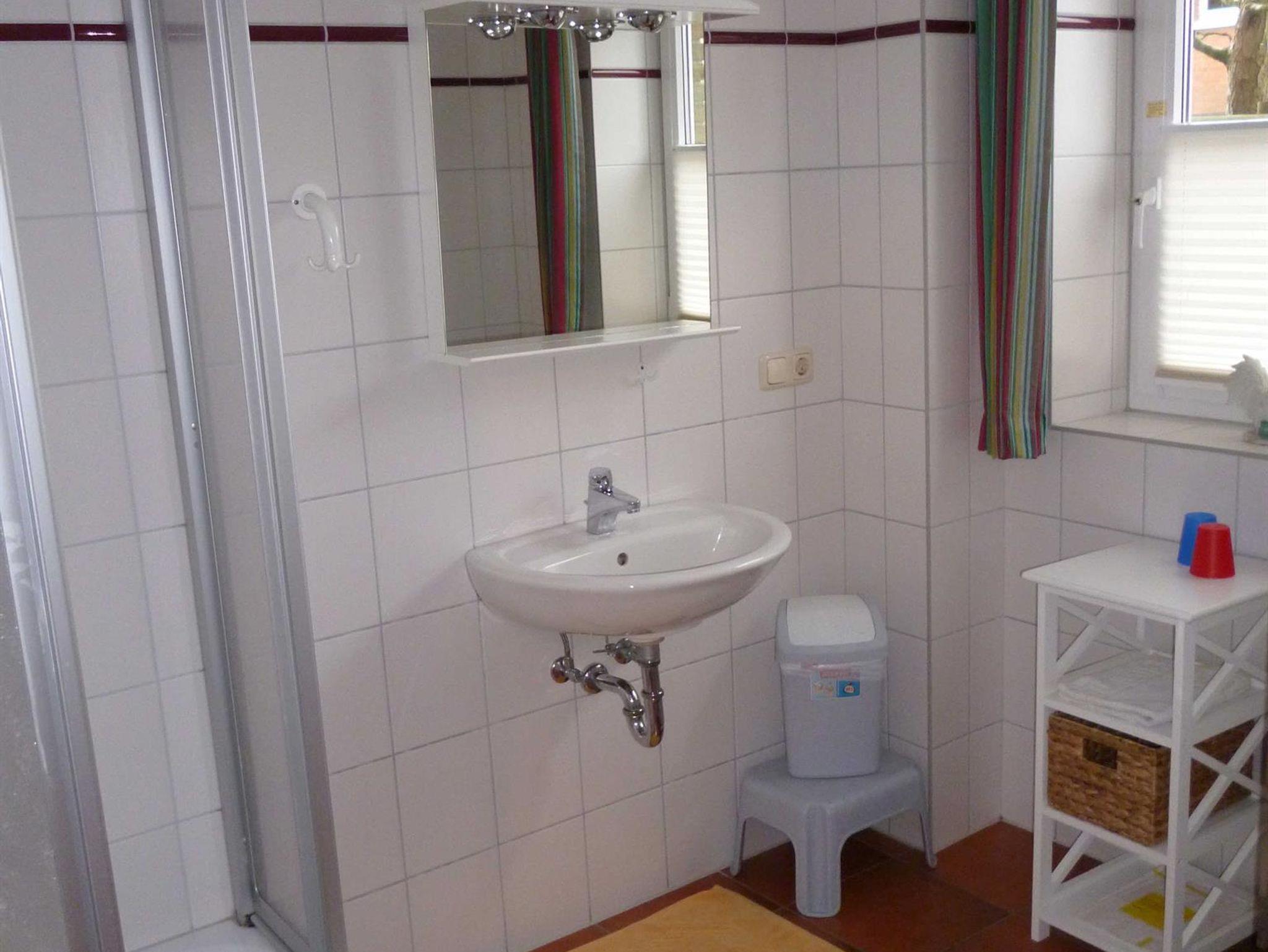 Das friesische Landhaus besitzt 2 Bäder mit Fußbodenheizung. Im Erdgeschoß-Bad steht eine Waschmaschine zur Verfügung.