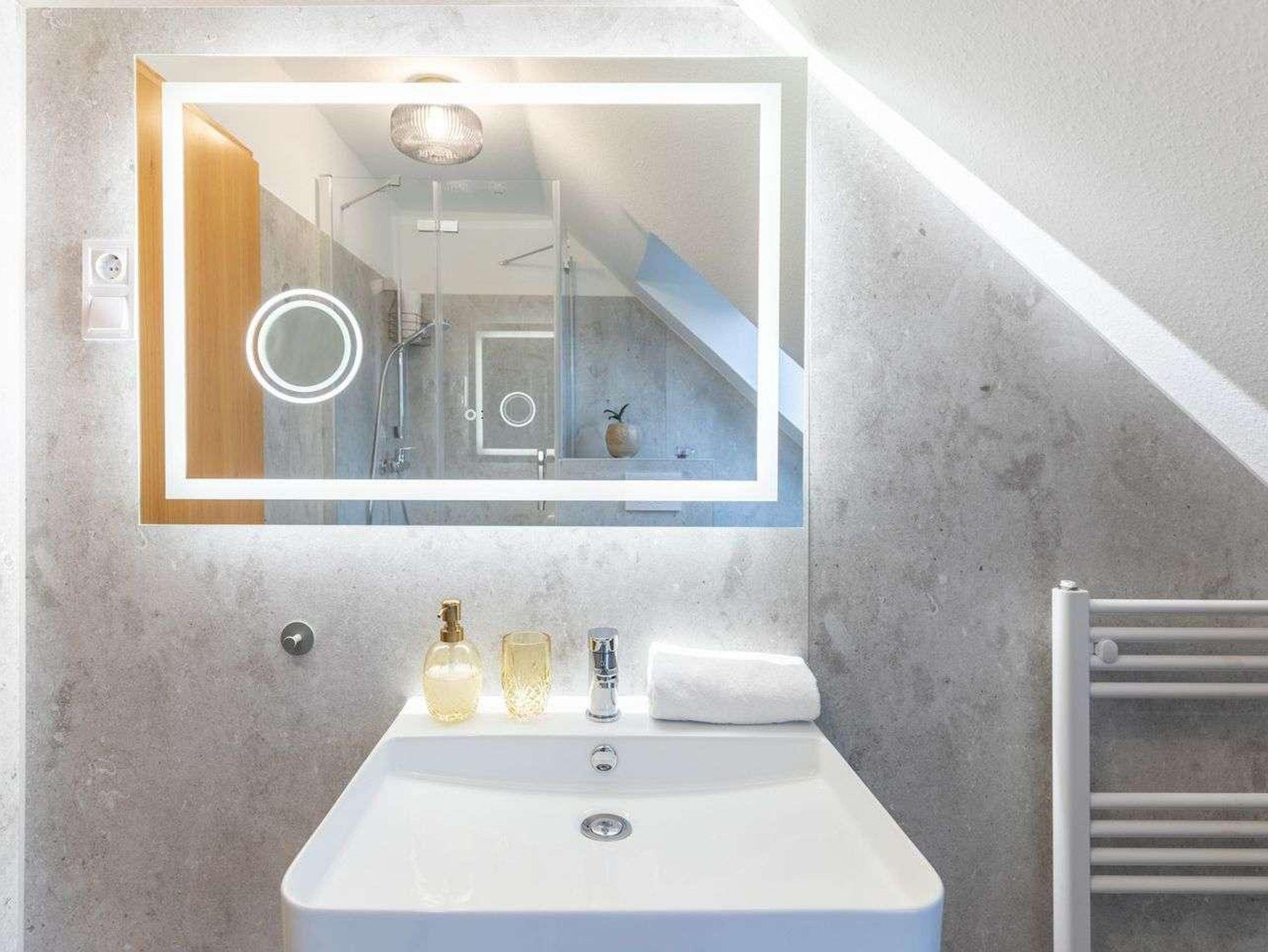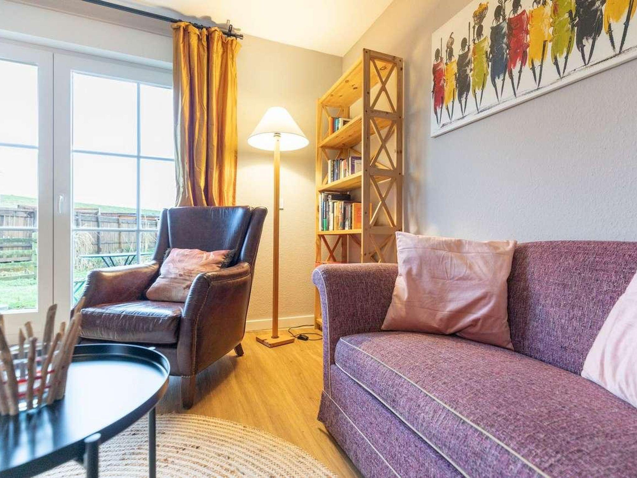 Im Obergeschoss befindet sich ein Schlafzimmer mit einem Kleiderschrank sowie einem King-Size-Boxspringbett (180 x 200), aus welchem Sie direkt auf den Deich schauen können. Das Badezimmer befindet sich auf derselben Etage und ist mit einer modernen Dusche, Toilette, Waschbecken und einem beleuchteten Spiegel ausgestattet. Über eine Treppe gelangen Sie in den offenen Wohnraum. Hier finden Sie eine gut ausgestattete Küche mit Kühlschrank, Backofen, Geschirrspülmaschine, Wasserkocher, Toaster und einer Tchibo - Kaffeemaschine.