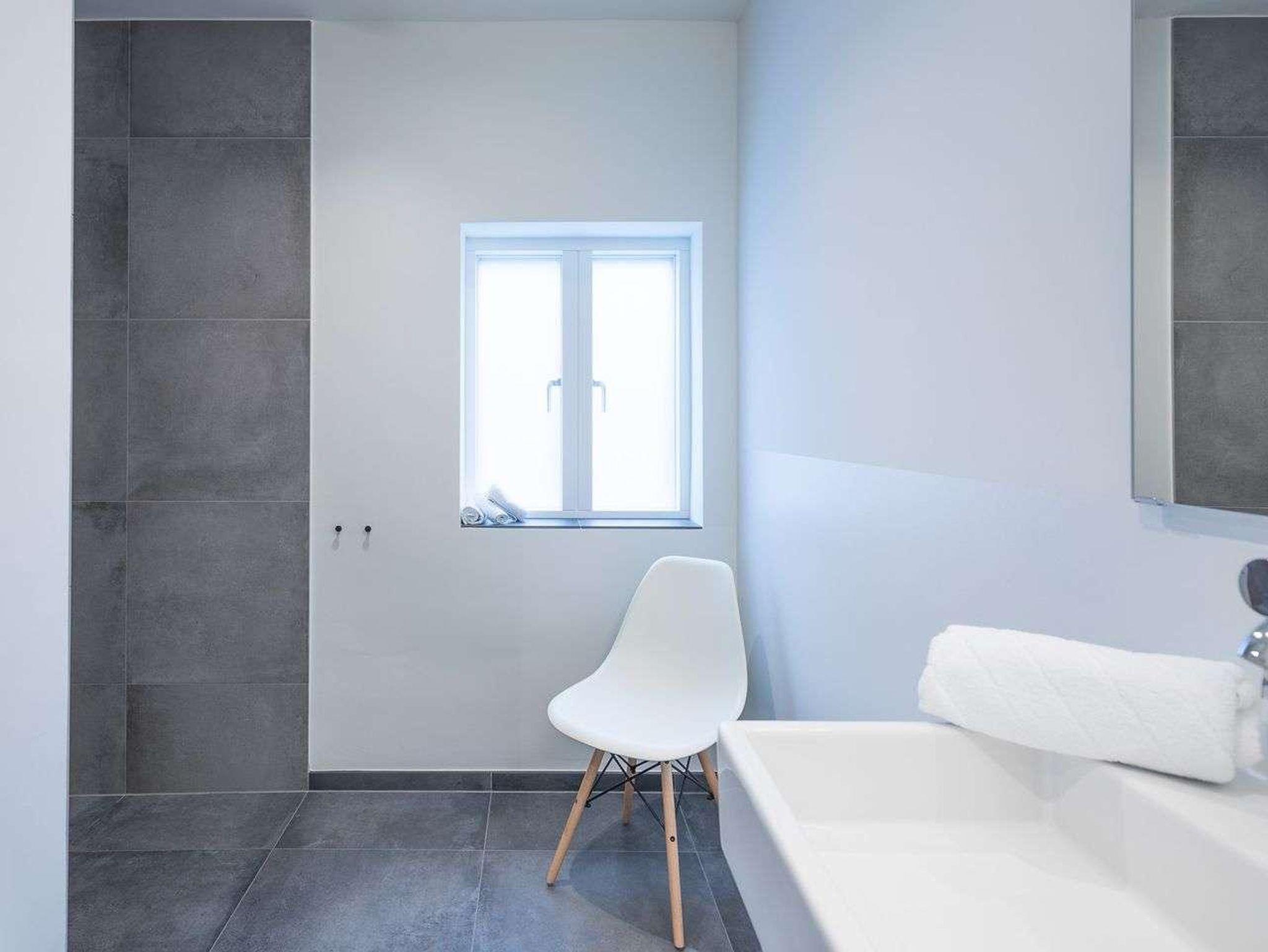 Im Erdgeschoss wird Ihnen ein großzügiges Badezimmer mit WC und Walk-in-Dusche geboten.