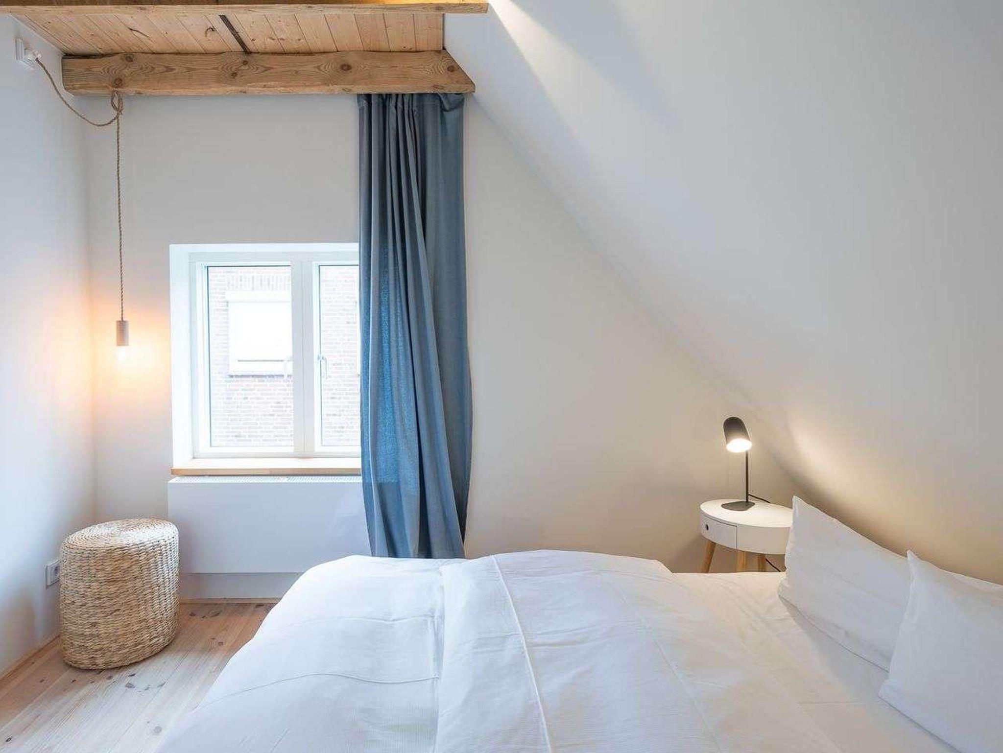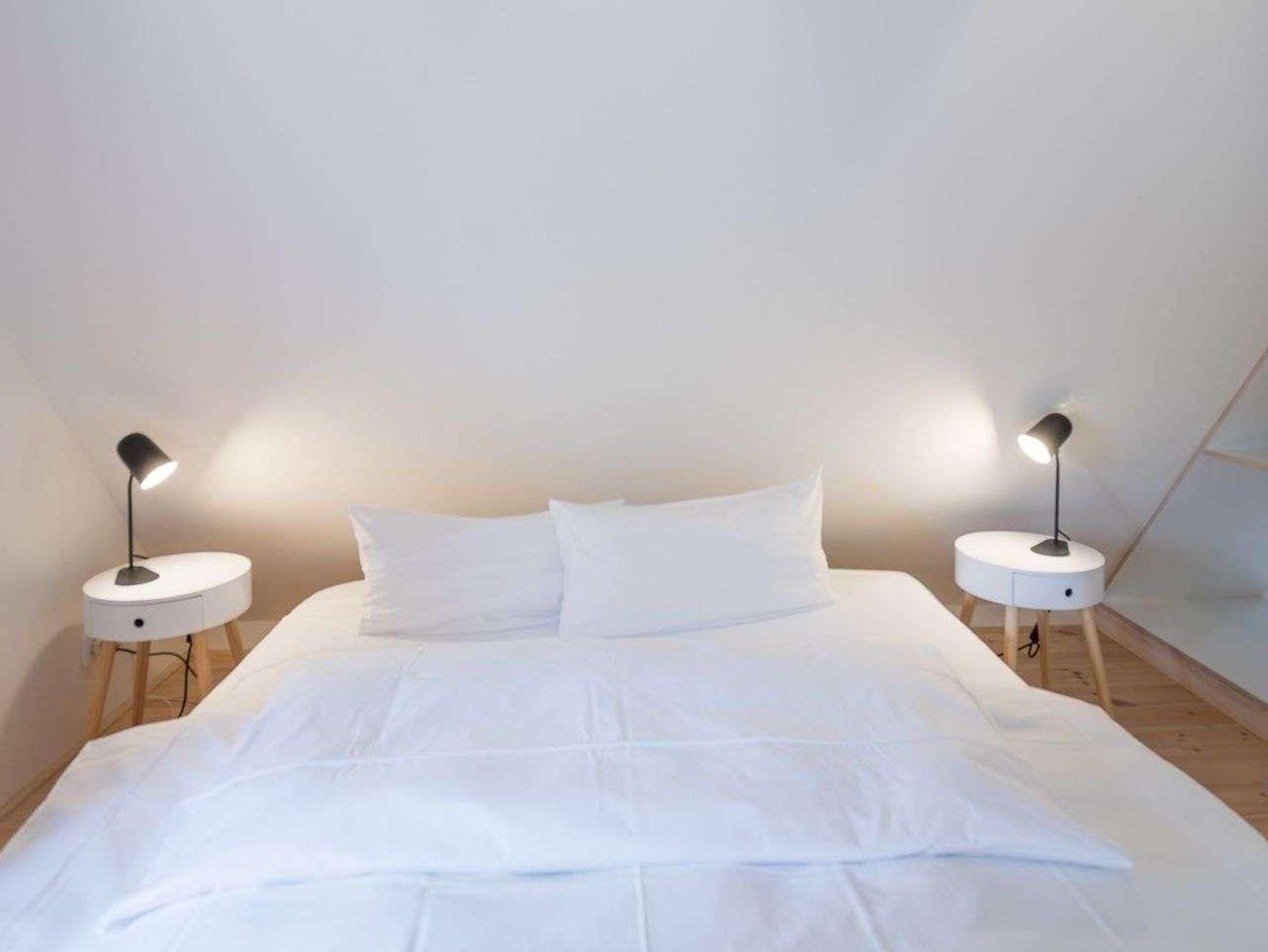 Über eine offene Holztreppe erreichen Sie den Schlafbereich: Das Ferienhaus verfügt über zwei Schlafzimmer und einen weiteren Schlafbereich im Dachgeschoss (über eine Leiter erreichbar) : Alle Schlafzimmer sind mit bequemen Doppelbetten (je 180 x 200) ausgestattet. Insbesondere das große Schlafzimmer hat einen offenen Charakter und lässt sich – wie auch das Dachgeschosszimmer nicht komplett abdunkeln.