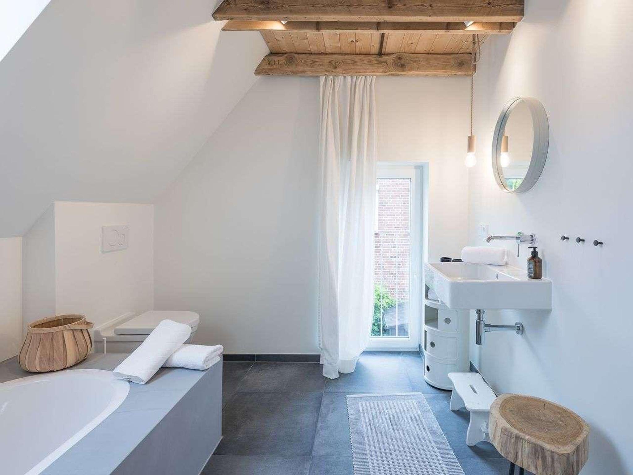 Im Obergeschoss befindet sich ein weiteres Badezimmer mit Badewanne und WC.