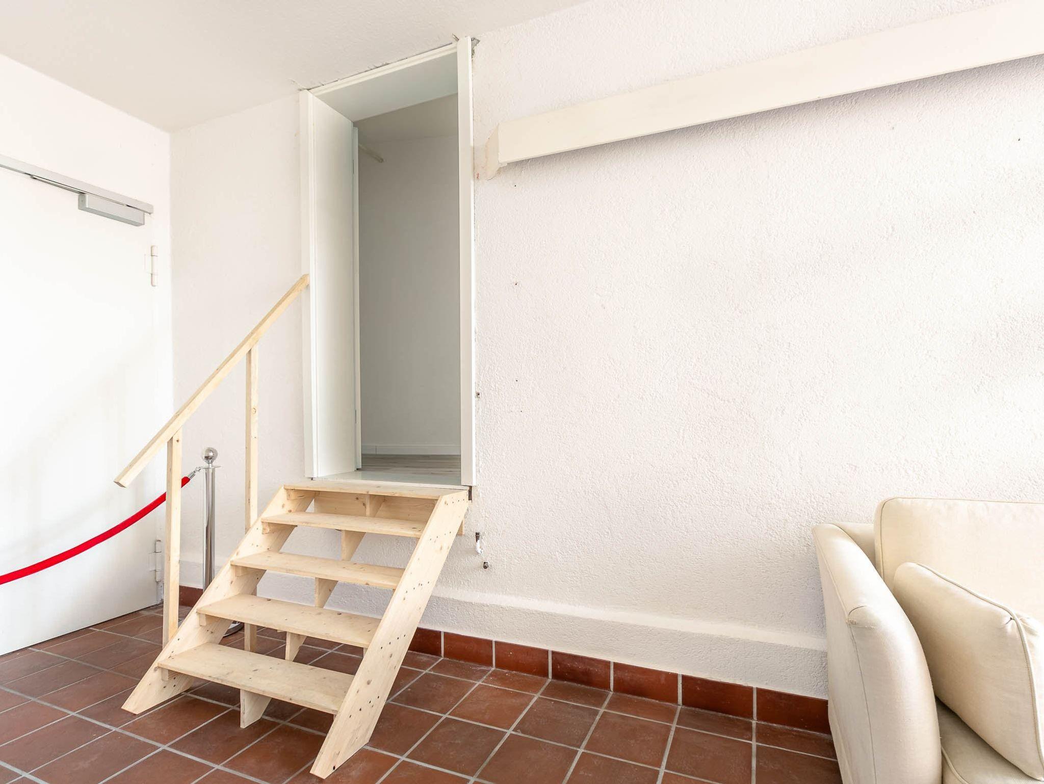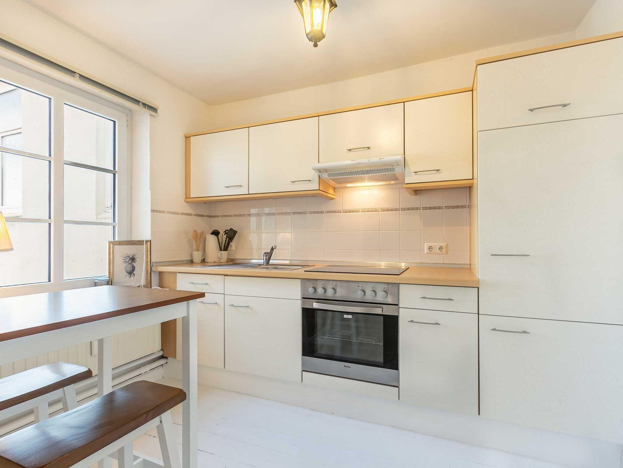 Separate Küche mit Backofen, Mikrowelle, Kühlschrank mit Gefrierfach und Hochtisch mit Hockern.