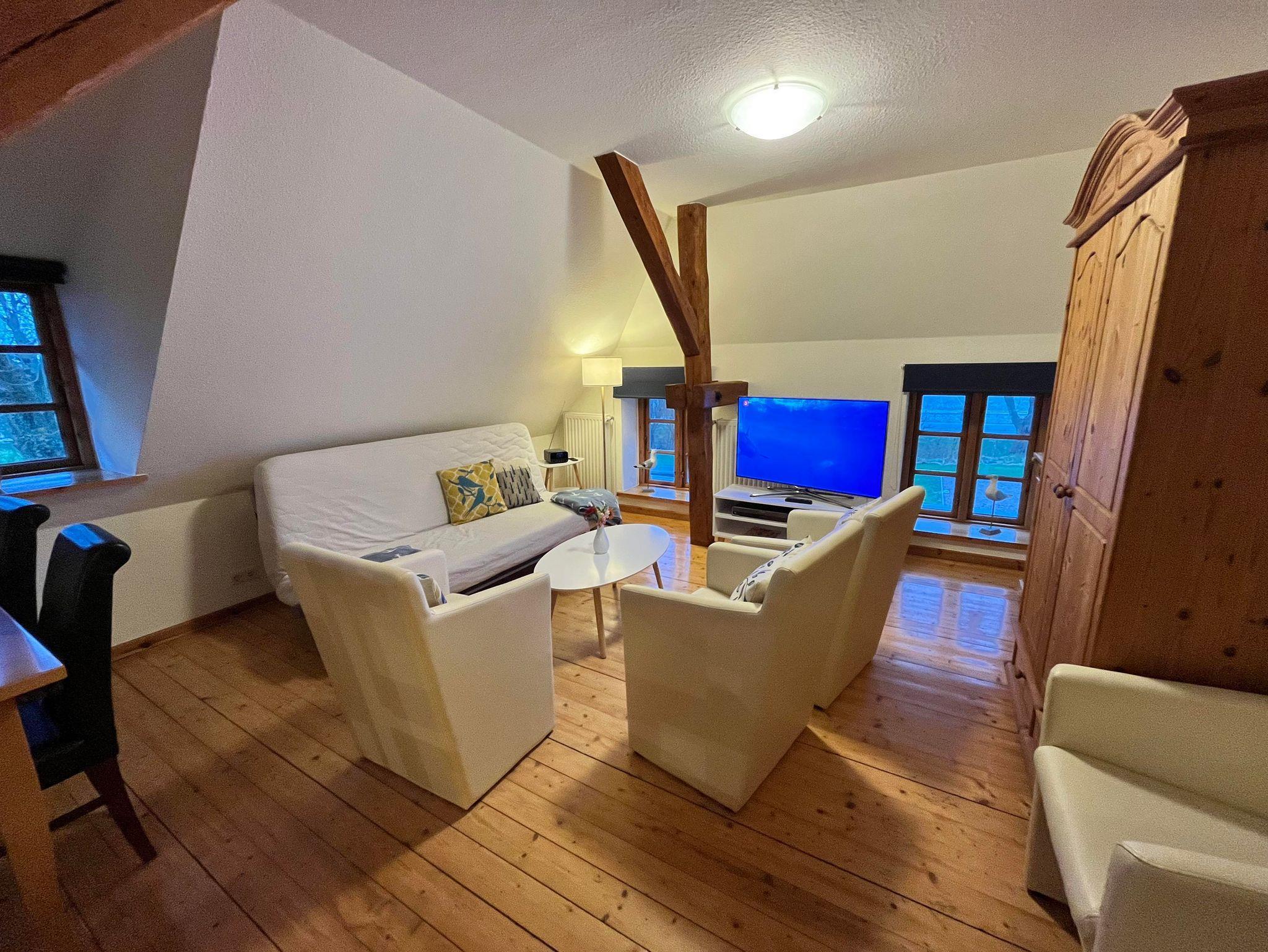 Unsere gemütliche Ferienwohnung Wiesenduft im Dachgeschoss unseres reetgedeckten Anwesens mit ca. 55 qm bietet ausreichend Platz für 2-4 Personen. Sie verfügt über einen kombinierten Wohn-Ess-Küchenbereich mit Schlafcouch (140x200 xm), ein Schlafzimmer mit Doppelbett (180x200 cm) und Kinderbett (60x120cm) sowie ein Duschbad mit WC.
