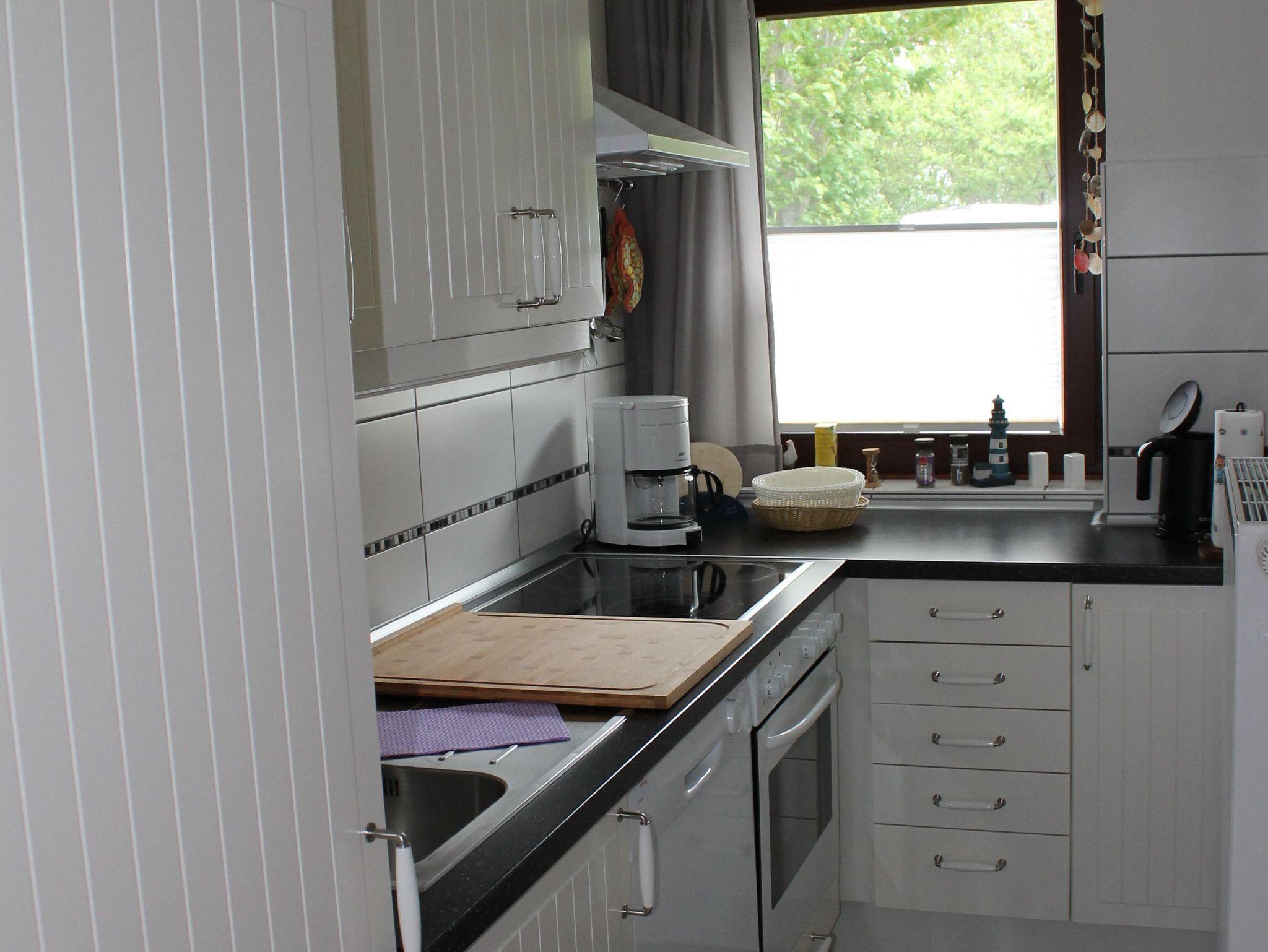 Diese Wohnung ist ca. 40 m² groß und hat einen Schlafraum für 2 Personen mit Doppelbett, Bettdecken 140 x 200 cm (die Betten sind 80 x 200 cm groß) und einen Wohn-/Essraum mit einer bequemen Schlafcouch, Bad mit Dusche und WC, Zugang zur Terrasse über den Wohnraum. Die Küche ist ausgestattet mit Cerankochfeld, Backofen, Mixer, Toaster, Kaffeemaschine, Wasserkocher, Eierkocher, Kühlschrank mit Gefrierfach, Fernseher, kleine Musikanlage.
