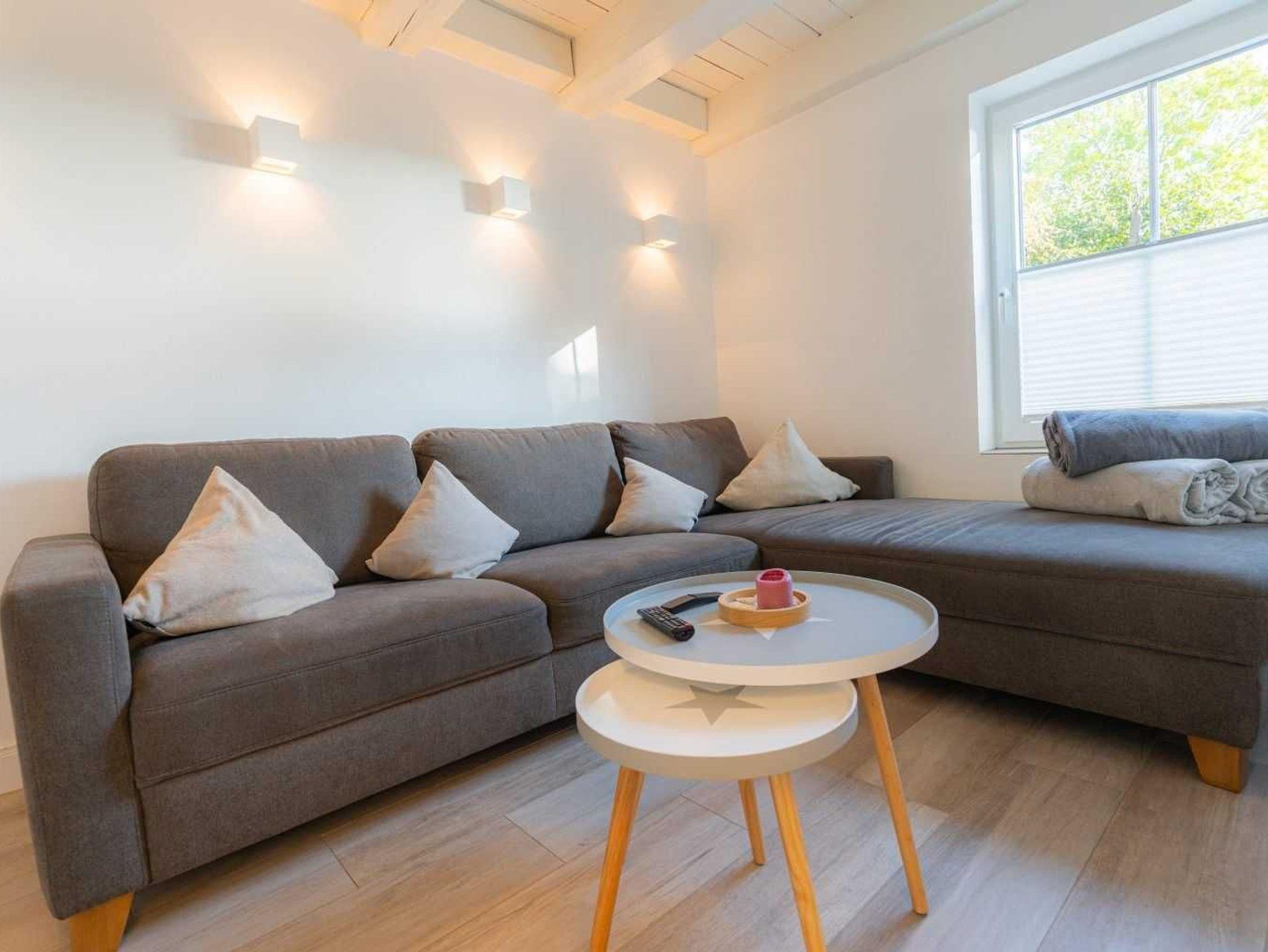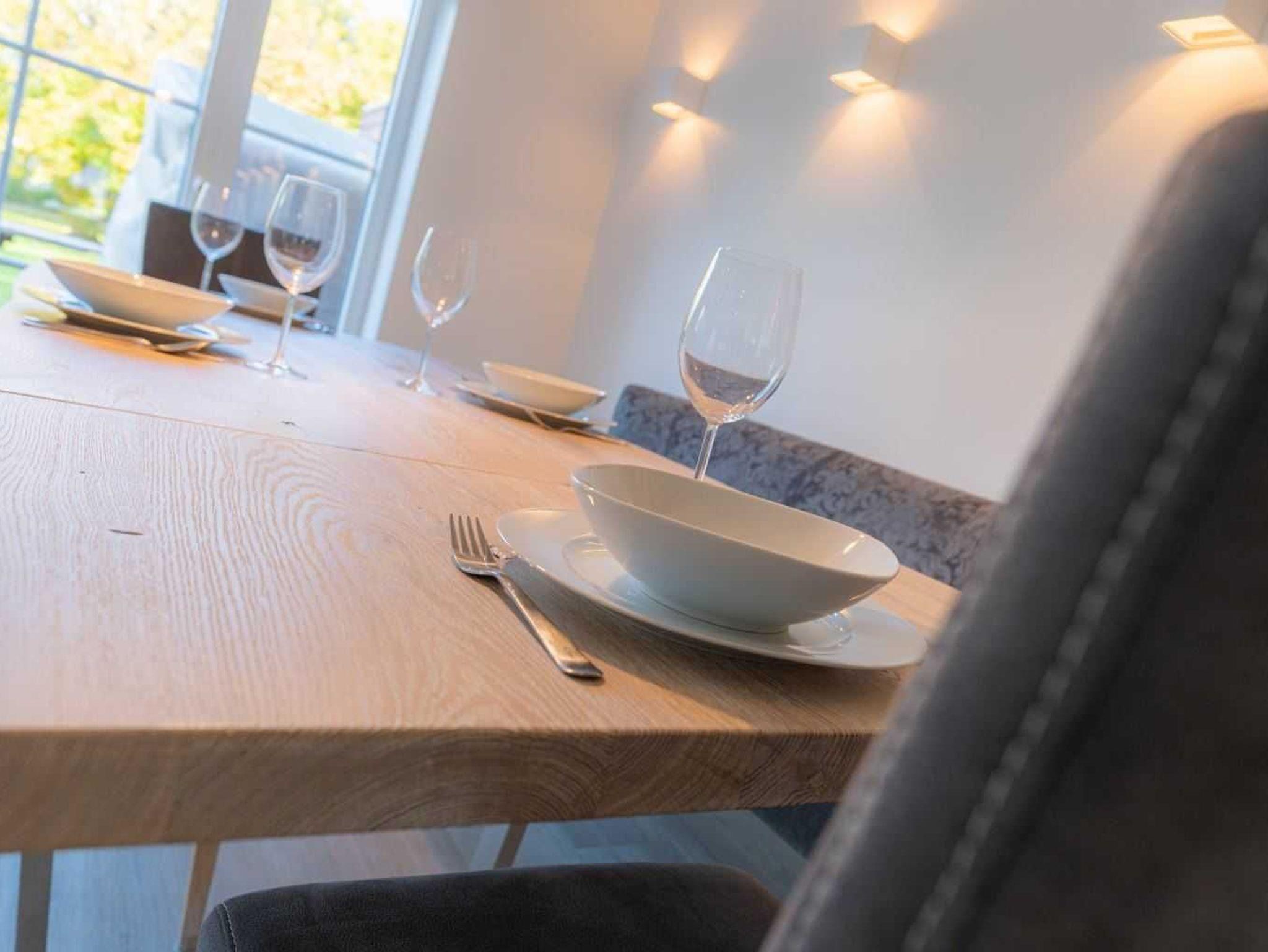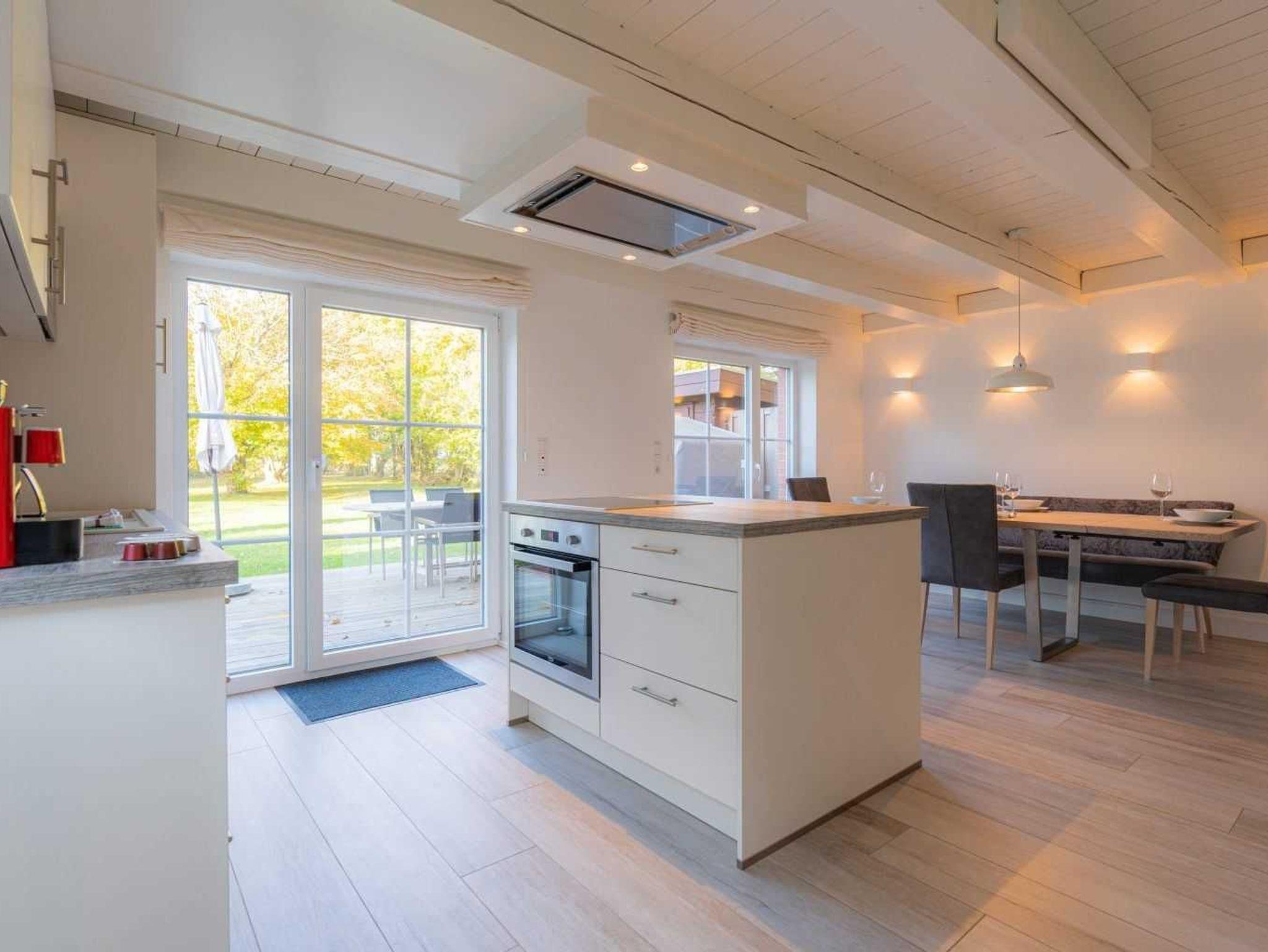 Wohnzimmer mit großem Ecksofa, SMART-TV (Sat) und Kaminofen. Essbereich mit großem Esstisch, gemütlichem Sofa für 2-3 Personen und 3 Stühlen. Offene Küche mit Kochinsel, Backofen, Mikrowelle, Geschirrspüler, Kühlschrank mit Gefrierfach und Waschtrockner. Direkter Zugang zur möblierten Garten-Terrasse nach Nordwesten.