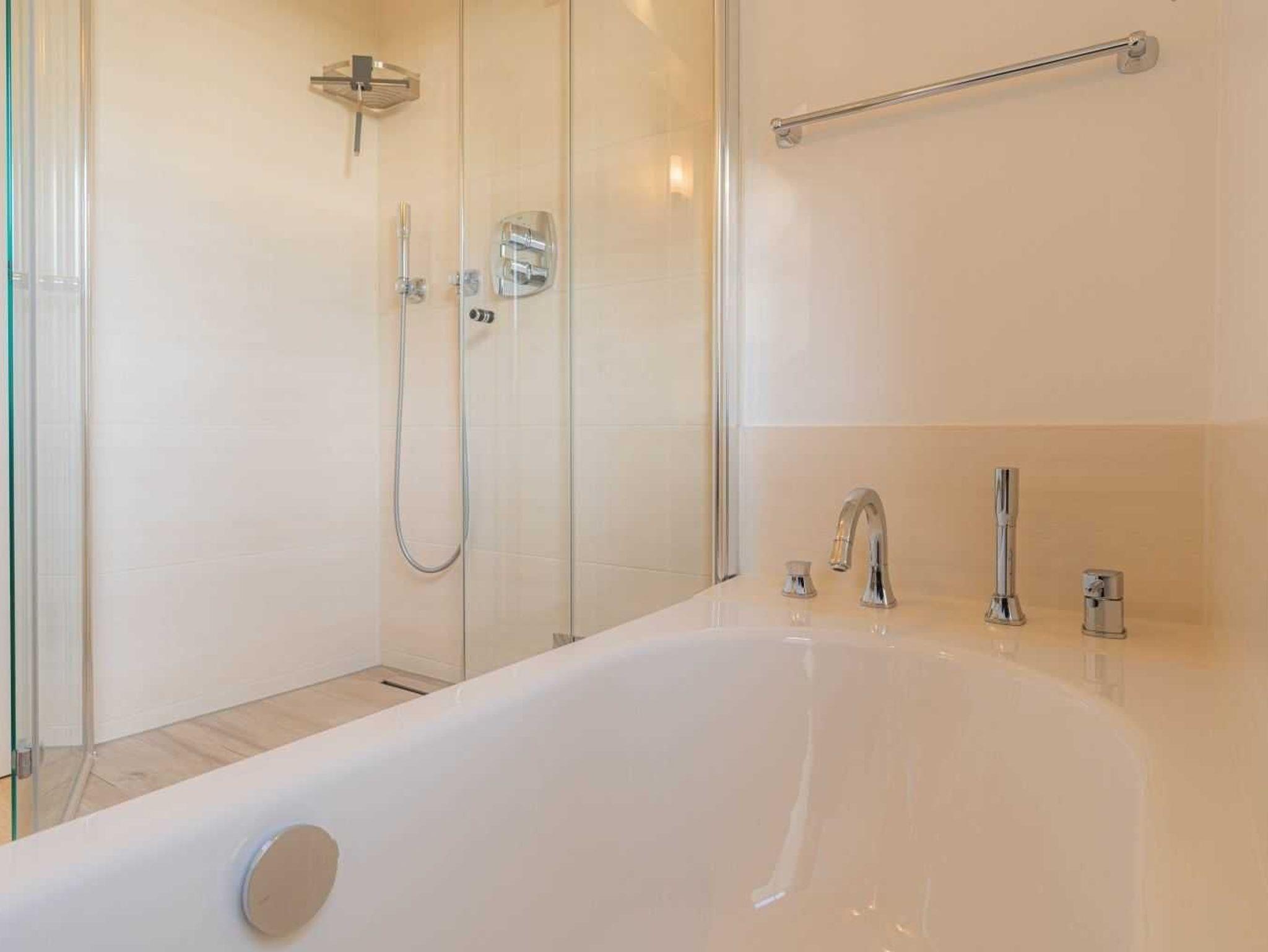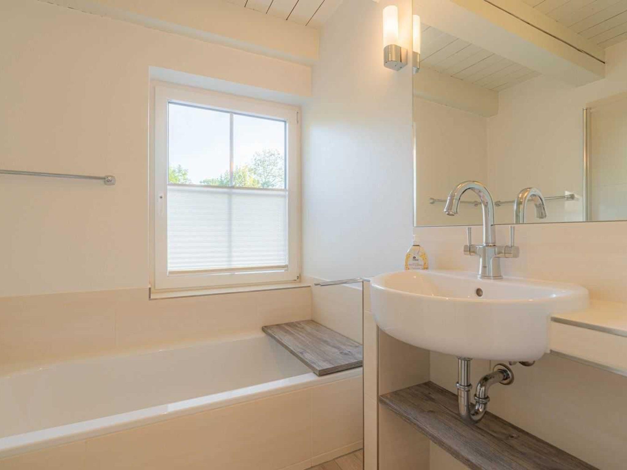 Badezimmer (Vollbad) mit Badewanne, bodengleicher Regen-Dusche, WC und Tageslicht.
