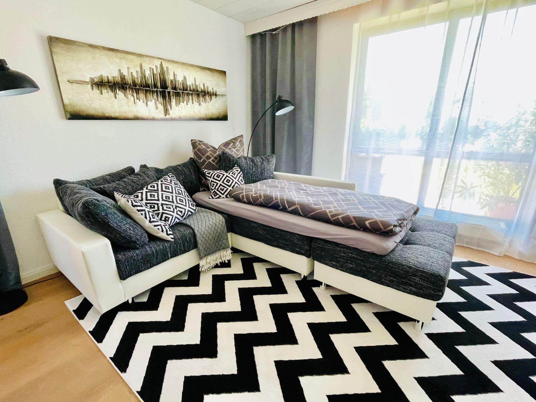 - ein gemütliches Wohnzimmer mit einem großen Sofas und einem kleinen Sofa, die sich bei Bedarf in Schlafsofas verwandeln lassen