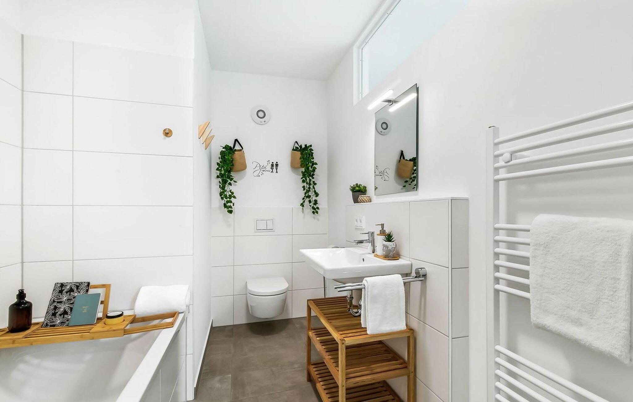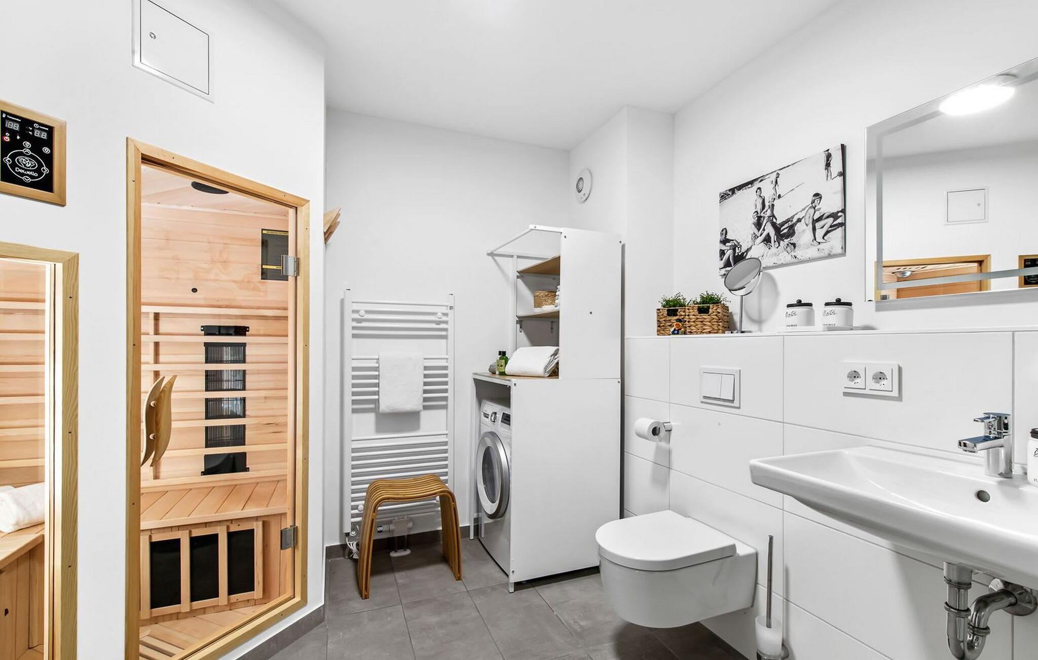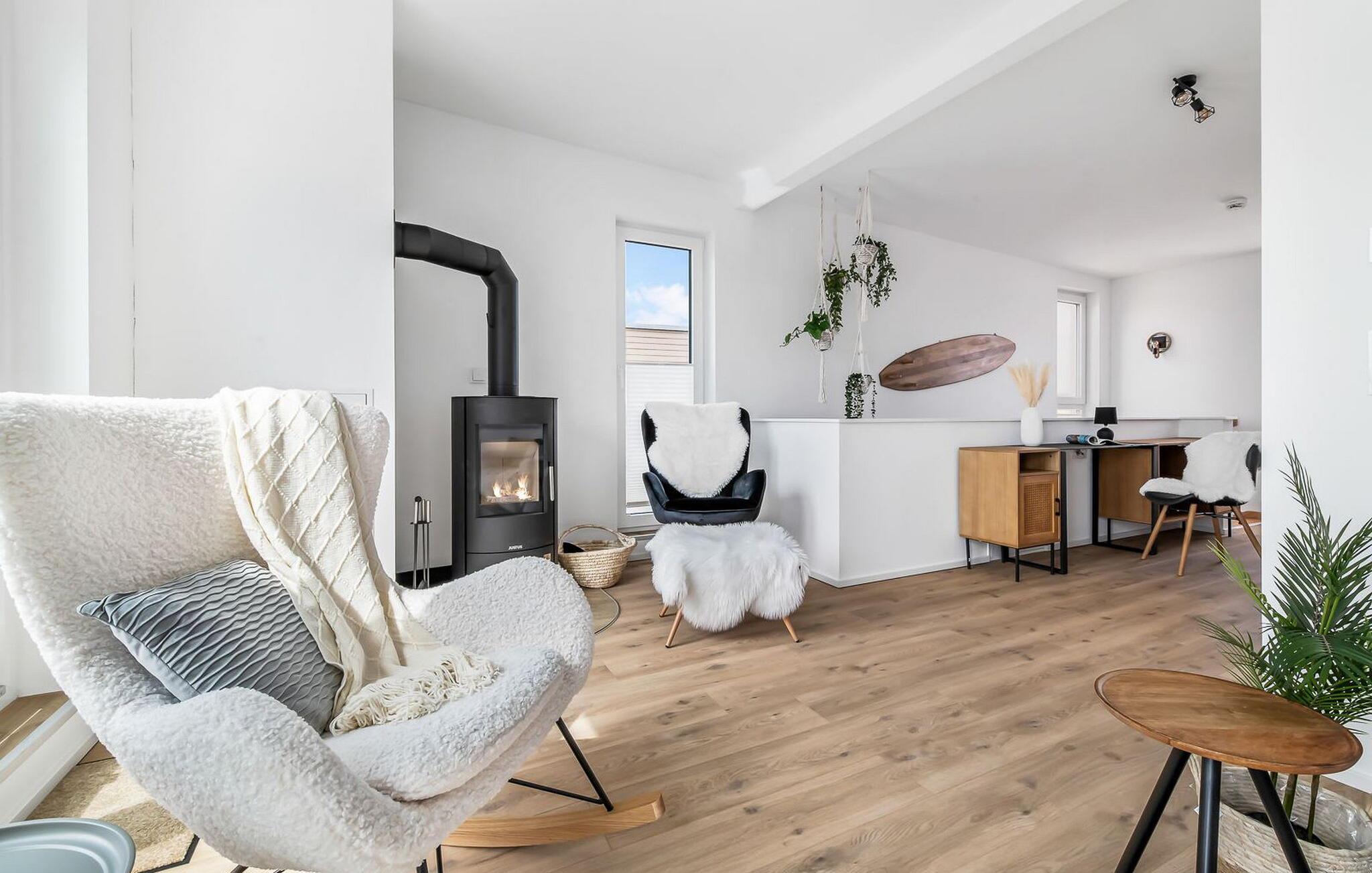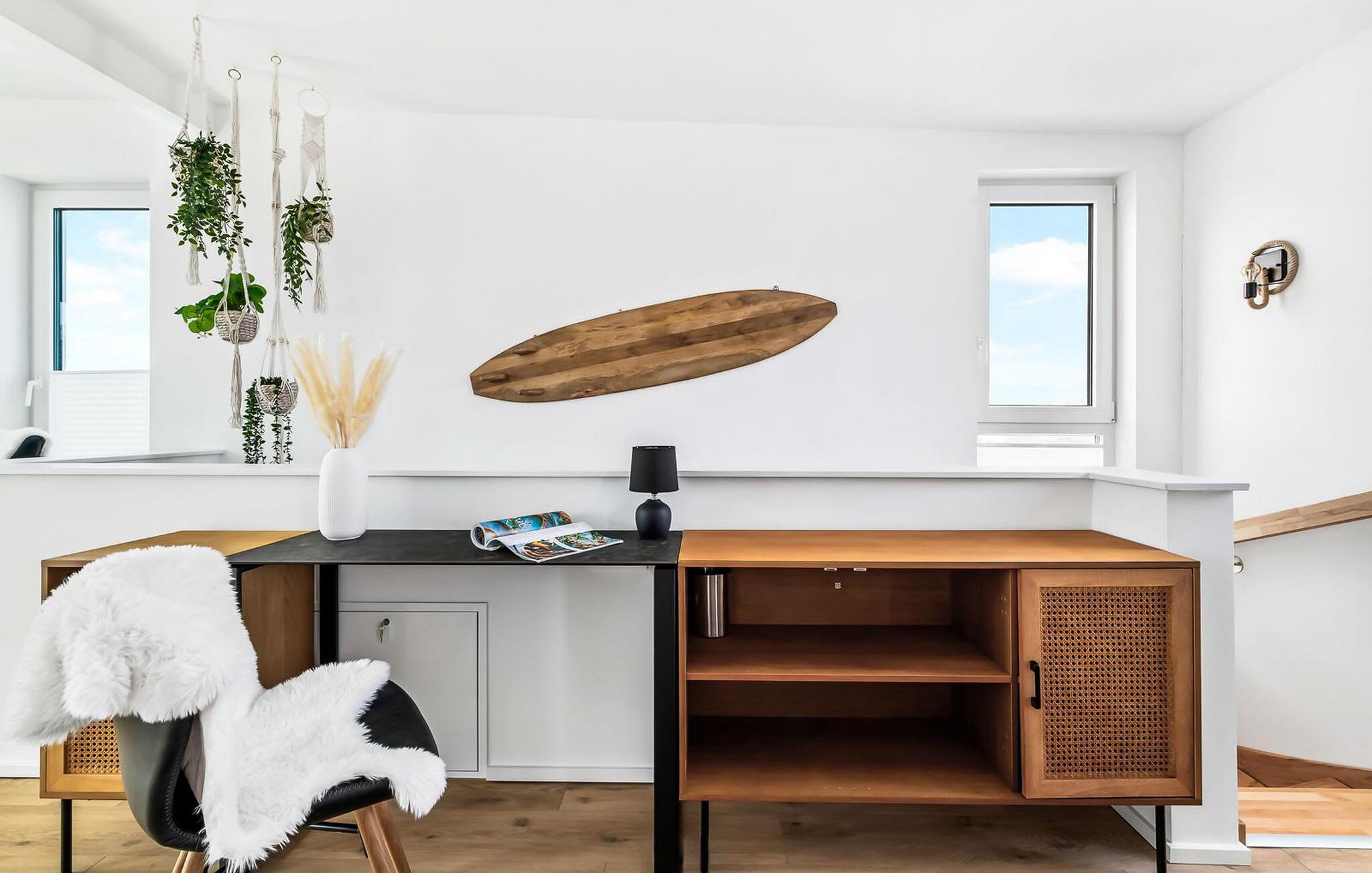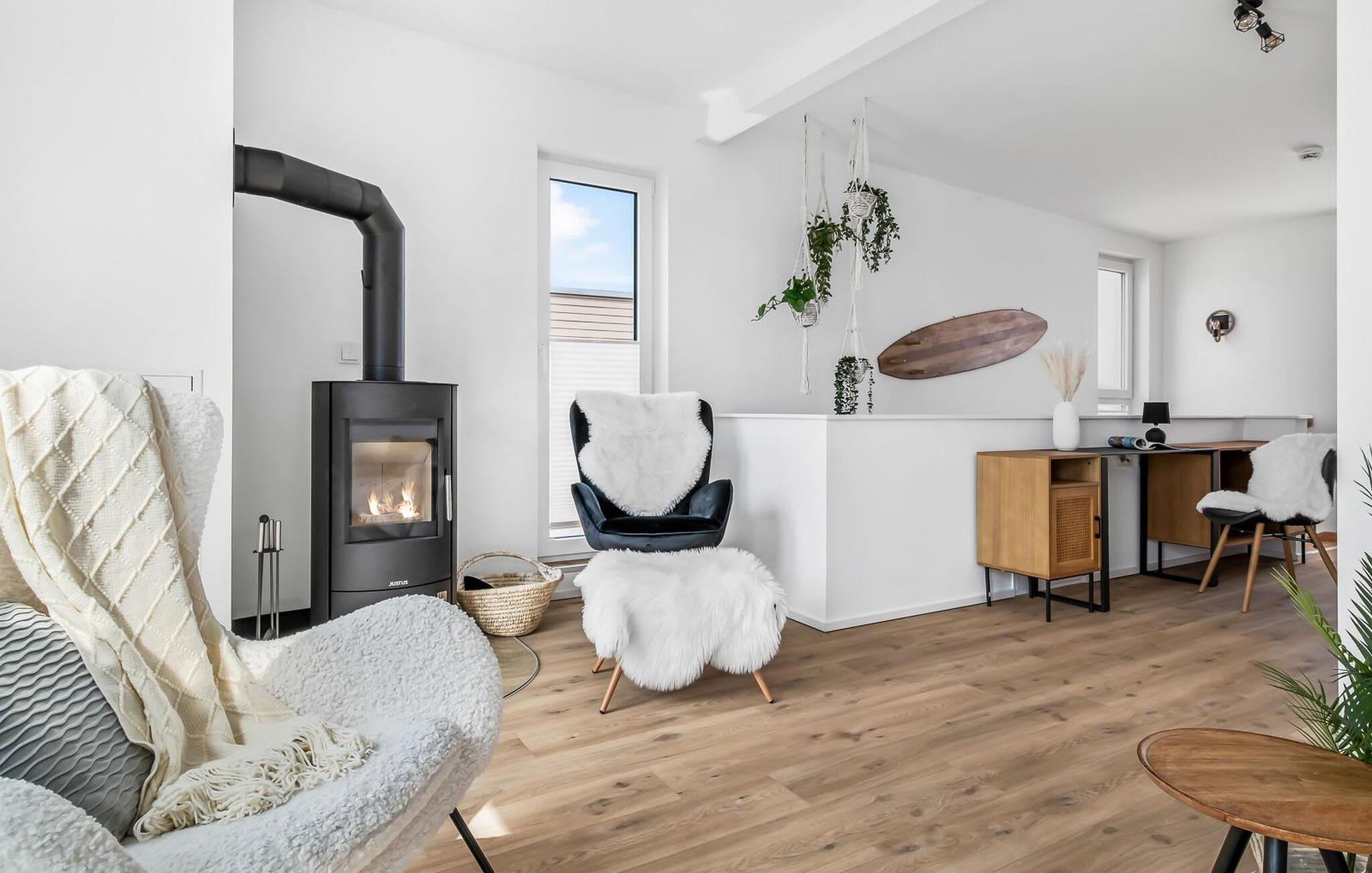TAKA TUKA LOUNGE er en rummelig og rummelig maisonette-ferielejlighed for op til 8 personer på første og anden sal med direkte udsigt over de naturbevarende strandenge og Østersøen bag dem. Det er beliggende i den sydlige udkant af feriestedet ved Østersøen og er det perfekte tilflugtssted for jeres familieferie. Sandstranden Weidefelder med kiosk, restaurant og strandstole ligger i gåafstand og er et attraktivt rejsemål på alle tider af året. Minigolfbanen med maritimt tema ligger også i umiddelbar nærhed og nydes af både unge og gamle. Lystbådehavnen og havnepromenaden med supermarked og restaurant kan også nås på få minutter til fods. Når I træder ind i ferielejligheden på første sal, begynder nedbremsningen fra allerførste øjeblik. Afslapningsområdet i lejligheden åbner sig. Der er tre rummelige soveværelser på denne etage, uanset hvilket et I vælger, kan I være sikker på en afslappende søvn. Det ene soveværelse er udstyret med en dobbeltseng i høj kvalitet, og det andet soveværelse har to separate enkeltsenge. I det tredje soveværelse kan I forvente en ungdomslounge-følelse med jeres eget tv og sækkestole. Her har I to kabinesenge, der kan udvides til fire sovepladser. Der er også et wellness-badeværelse på denne etage med bruser i gulvniveau, infrarød sauna og et stort spejl. En gang på anden sal lever TAKA TUKA Lounge op til sit navn. Den moderne boho chic får jer til at føle, at I er på en ø. Lad tankerne vandre og nyd udsigten fra gulv-til-loft vinduerne og fra den store solterrasse med udsigt over de naturbeskyttede strandenge og Østersøen. Ren afslapning! Skal I lave noget arbejde på ferien, finder I et lille hjemmekontorhjørne i opholdsområdet. Når vejret ikke er så solrigt, sørger den hyggelige opholdsstue og den knitrende pejs for en hyggelig hyggefaktor. Hverdagen bliver mere og mere fjern. Det åbne køkken er udstyret til en høj standard og vil få enhver hobbykoks hjerte til at banke hurtigere, og terrassen med en elektrisk Weber-grill indbyder til en afslappet grill. Også på øverste etage er der et andet badeværelse med badekar, som runder følelsen af og sikrer et afslappende ophold på alle tider af året. Foran ferielejligheden finder I jeres egen parkeringsplads. Vores favoritsted: nyd solen og udsigten over naturen fra terrassen, ligesom i Taka Tuka Land! Bemærk venligst: OstseeResort Olpenitz er meget populært, og der bygges fortsat i parken. Ikke desto mindre kan I se frem til en 5-stjernet standard og et førsteklasses ophold. Byggeaktiviteterne kommer ikke til at forstyrre jer på ferien, og derfor gives der ikke yderligere afslag i prisen.