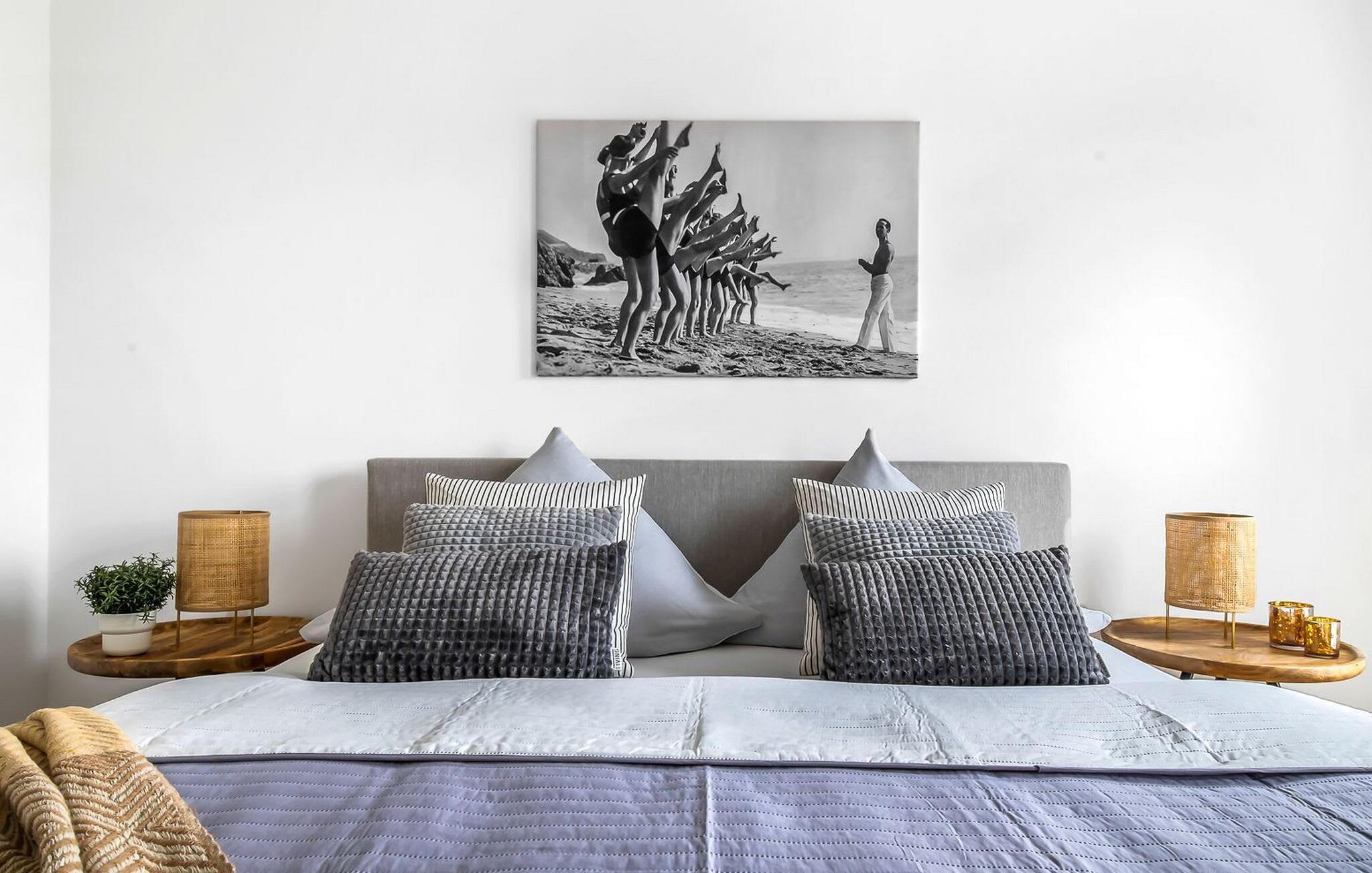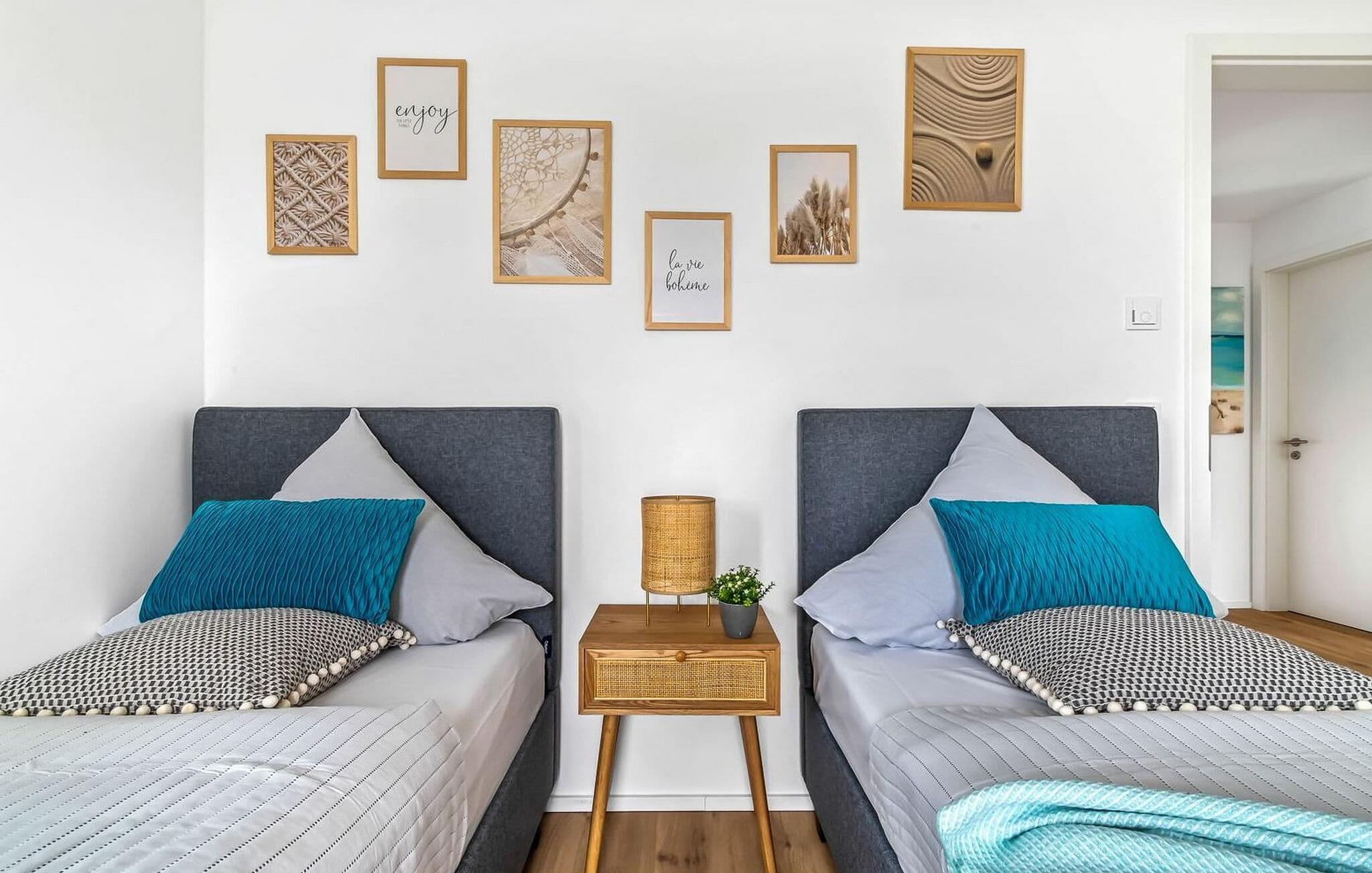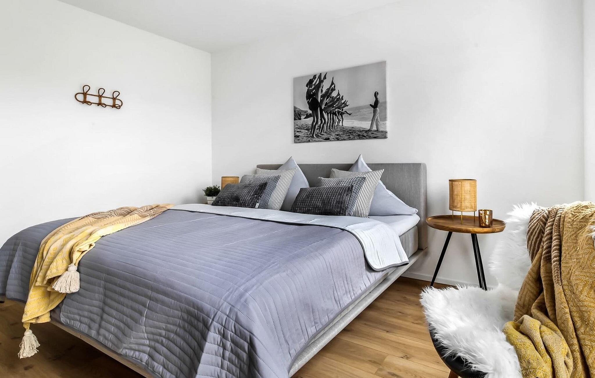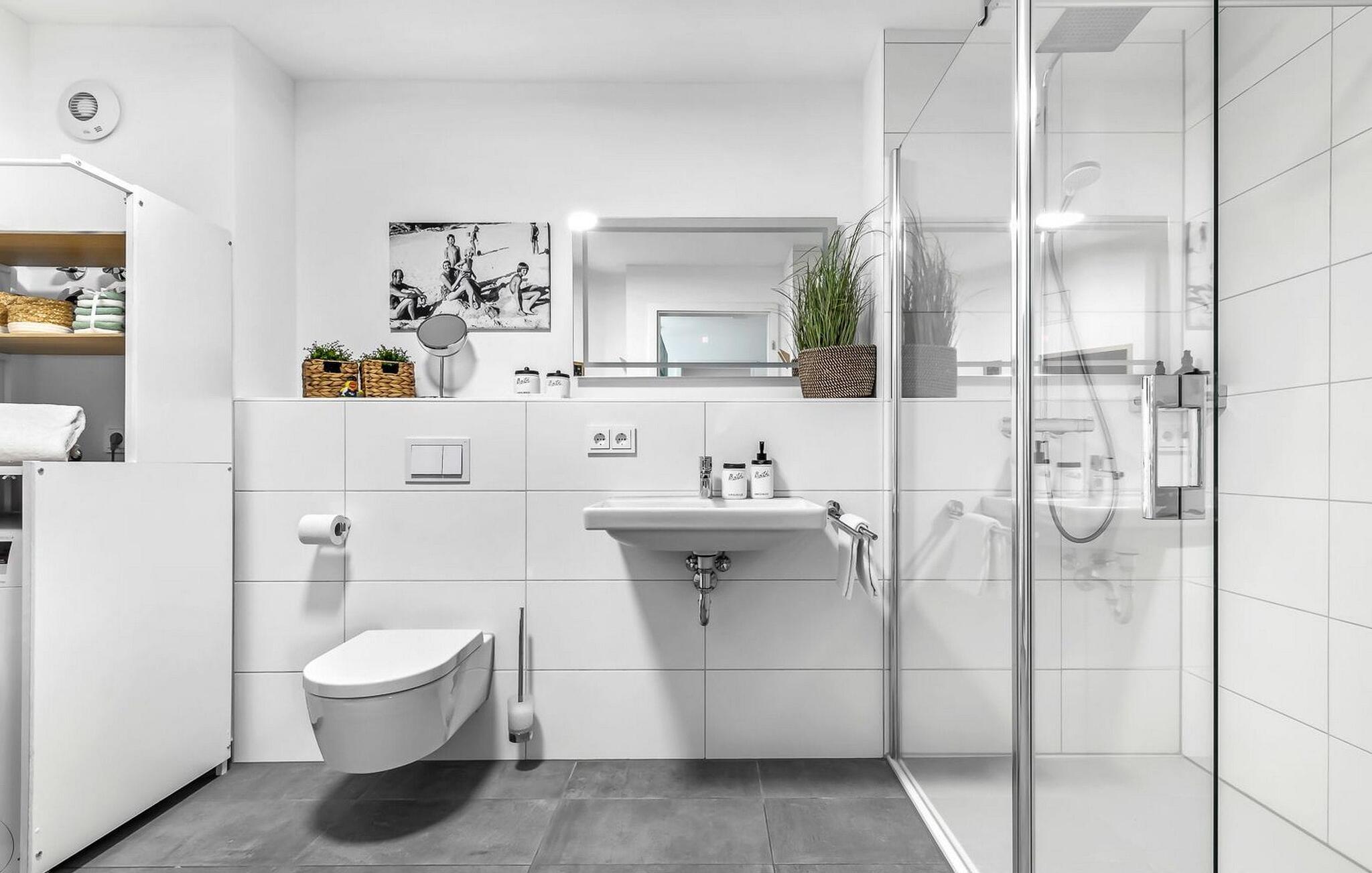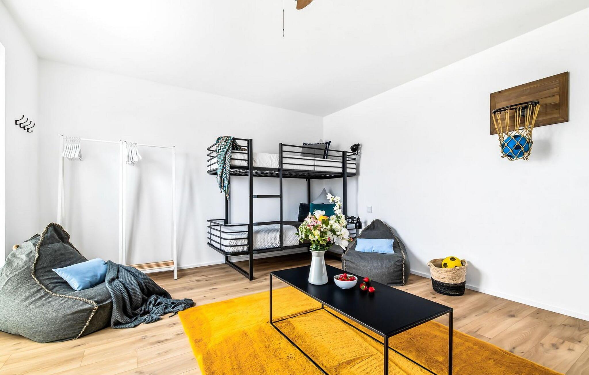 TAKA TUKA LOUNGE er en rummelig og rummelig maisonette-ferielejlighed for op til 8 personer på første og anden sal med direkte udsigt over de naturbevarende strandenge og Østersøen bag dem. Det er beliggende i den sydlige udkant af feriestedet ved Østersøen og er det perfekte tilflugtssted for jeres familieferie. Sandstranden Weidefelder med kiosk, restaurant og strandstole ligger i gåafstand og er et attraktivt rejsemål på alle tider af året. Minigolfbanen med maritimt tema ligger også i umiddelbar nærhed og nydes af både unge og gamle. Lystbådehavnen og havnepromenaden med supermarked og restaurant kan også nås på få minutter til fods. Når I træder ind i ferielejligheden på første sal, begynder nedbremsningen fra allerførste øjeblik. Afslapningsområdet i lejligheden åbner sig. Der er tre rummelige soveværelser på denne etage, uanset hvilket et I vælger, kan I være sikker på en afslappende søvn. Det ene soveværelse er udstyret med en dobbeltseng i høj kvalitet, og det andet soveværelse har to separate enkeltsenge. I det tredje soveværelse kan I forvente en ungdomslounge-følelse med jeres eget tv og sækkestole. Her har I to kabinesenge, der kan udvides til fire sovepladser. Der er også et wellness-badeværelse på denne etage med bruser i gulvniveau, infrarød sauna og et stort spejl. En gang på anden sal lever TAKA TUKA Lounge op til sit navn. Den moderne boho chic får jer til at føle, at I er på en ø. Lad tankerne vandre og nyd udsigten fra gulv-til-loft vinduerne og fra den store solterrasse med udsigt over de naturbeskyttede strandenge og Østersøen. Ren afslapning! Skal I lave noget arbejde på ferien, finder I et lille hjemmekontorhjørne i opholdsområdet. Når vejret ikke er så solrigt, sørger den hyggelige opholdsstue og den knitrende pejs for en hyggelig hyggefaktor. Hverdagen bliver mere og mere fjern. Det åbne køkken er udstyret til en høj standard og vil få enhver hobbykoks hjerte til at banke hurtigere, og terrassen med en elektrisk Weber-grill indbyder til en afslappet grill. Også på øverste etage er der et andet badeværelse med badekar, som runder følelsen af og sikrer et afslappende ophold på alle tider af året. Foran ferielejligheden finder I jeres egen parkeringsplads. Vores favoritsted: nyd solen og udsigten over naturen fra terrassen, ligesom i Taka Tuka Land! Bemærk venligst: OstseeResort Olpenitz er meget populært, og der bygges fortsat i parken. Ikke desto mindre kan I se frem til en 5-stjernet standard og et førsteklasses ophold. Byggeaktiviteterne kommer ikke til at forstyrre jer på ferien, og derfor gives der ikke yderligere afslag i prisen.