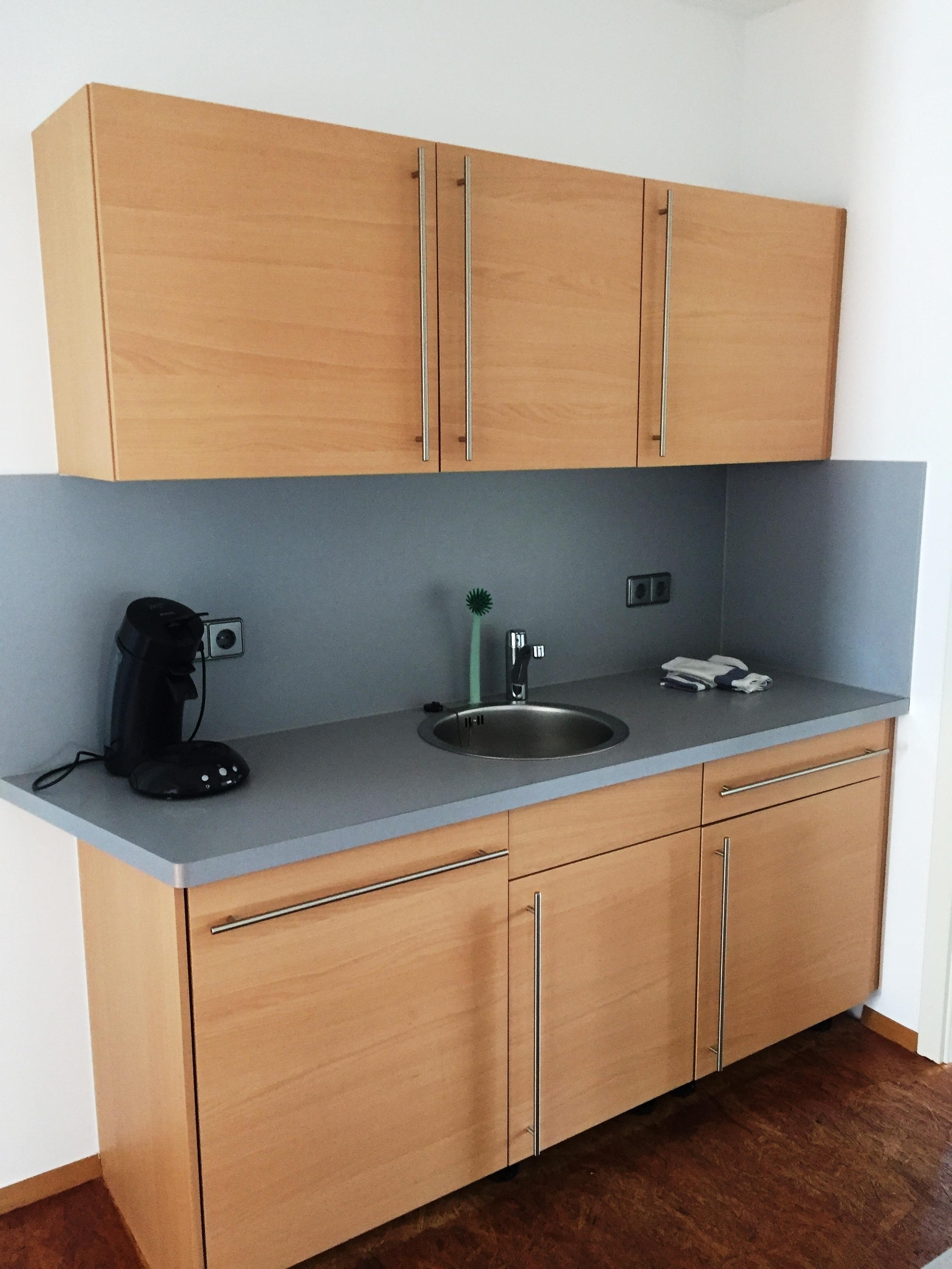 Kühlschrank, Kaffemaschine mit Pads, Toaster und Wasserkocher.
