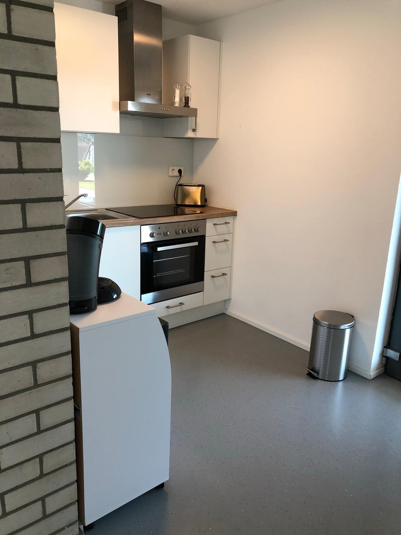 Die funktionell eingerichtete Kochzeile verfügt über einen Herd mit Cerankochfeld, Mikrowelle Kühlschrank, Kaffeemaschine mit Pads, Toaster und Wasserkocher.