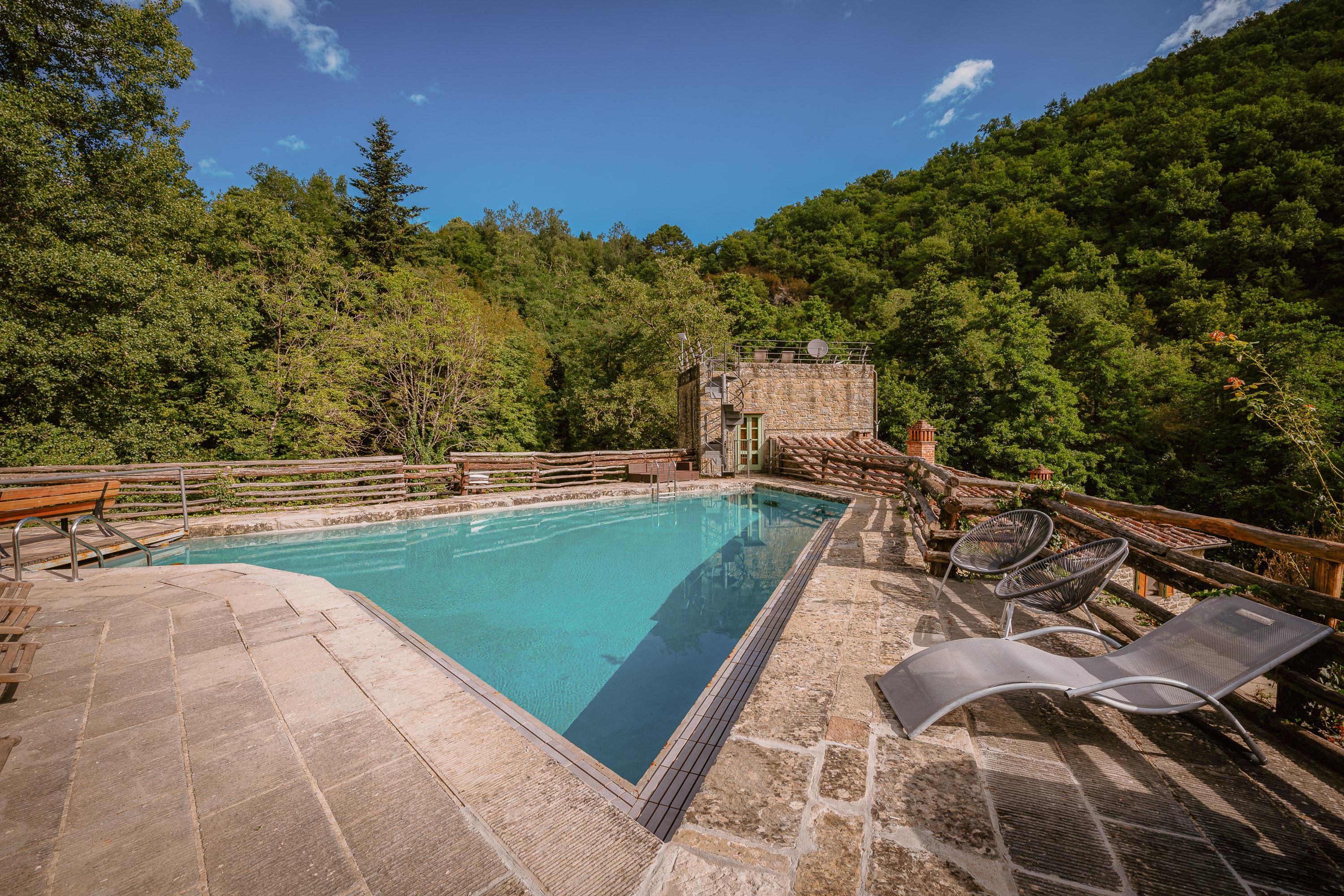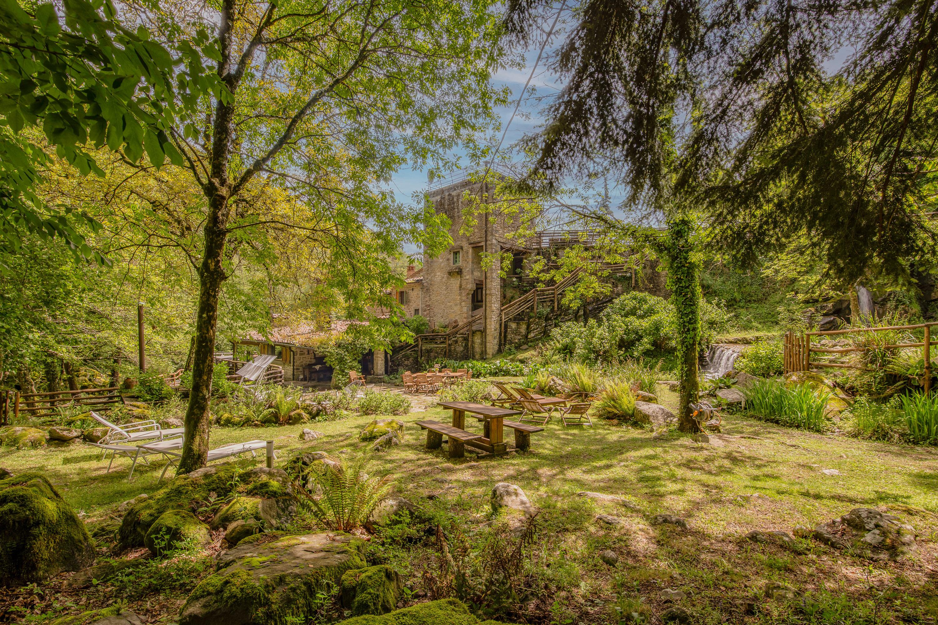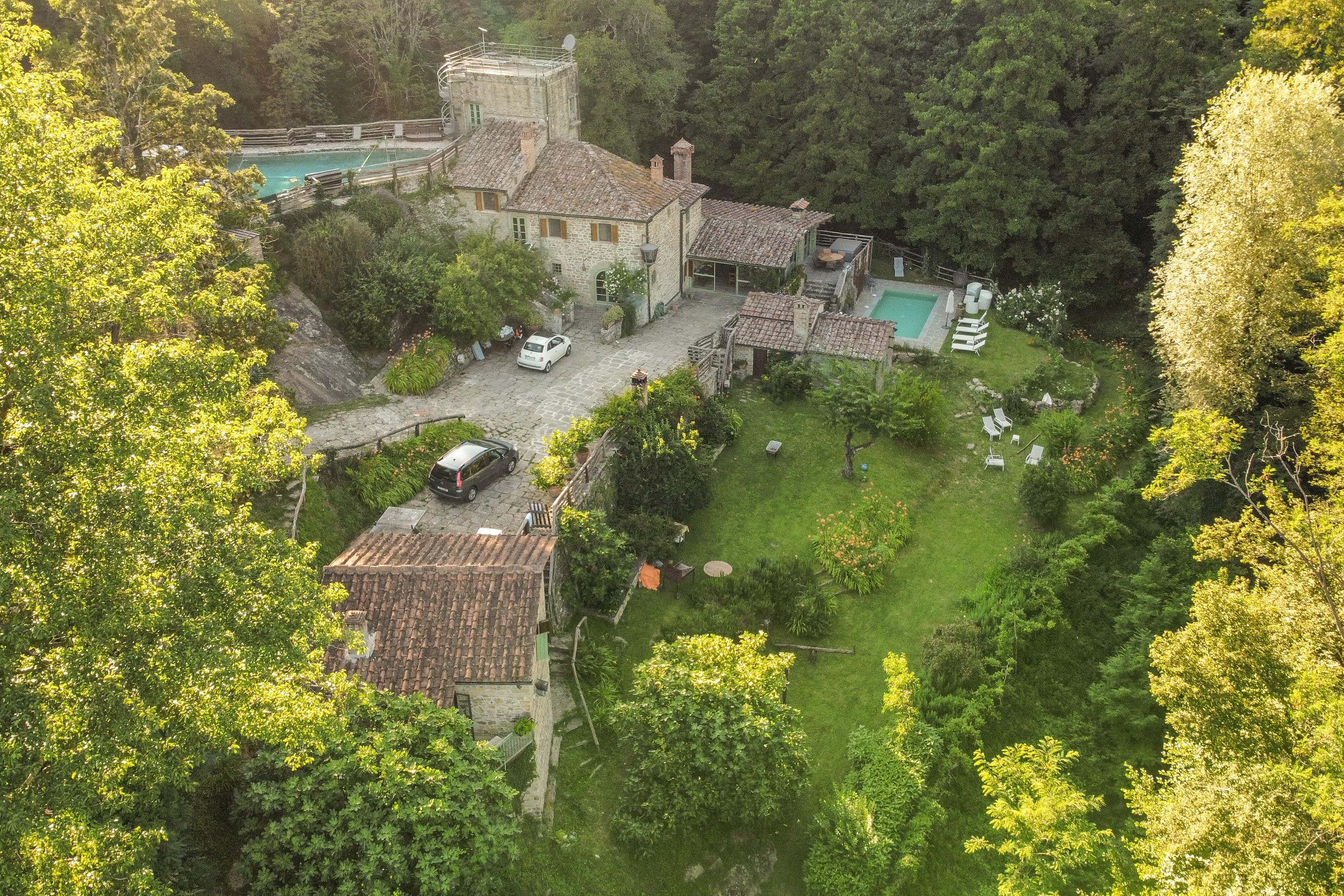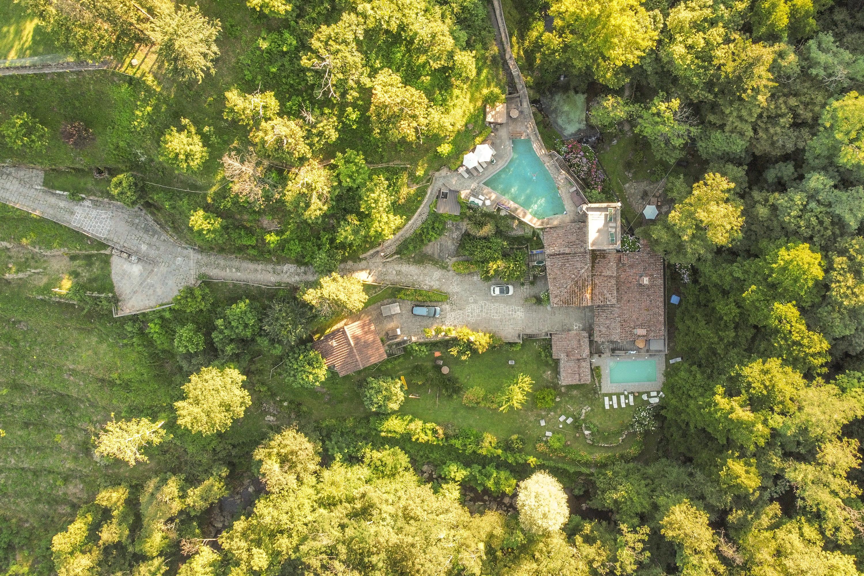 Das märchenhafte Anwesen erstreckt sich über ein 80.000 qm großes Grundstück, von dem 4 Hektar mit einem 2 Meter hohen Zaun ausbruchsicher geschlossen sind. Der große Pool auf dem Sonnendeck lässt die Herzen von Sonnenanbetern höher schlagen. Die kleinen Bächlein, die das Grundstück durchziehen, haben Trinkwasserqualität und sind bekannt für ihre Sauberkeit. Ein weiterer Swimmingpool mit Sonnenliegen befindet sich im vorderen Bereich des Hauses. Zahlreiche Hängematten wurden zwischen den Bäumen am Ufer angebracht, sodass jeder seinen persönlichen Ruheplatz finden kann. In den heißen Sommermonaten sorgt der hohe und dichte Baumbestand für ein angenehm kühles Klima. Der Bach fließt etwa 1000 Meter durch das gesamte Grundstück und bildet dabei zwei große natürliche Badebecken mit eigenen Wasserfällen, ideal zum Bauen von Staudämmen und zum sicheren Toben für Kleinkinder. Oberhalb des Hauses befindet sich ein großer Platz, der als Tennisplatz oder Volleyballfeld genutzt werden kann. Das Grundstück verfügt über sechs Parkplätze. Dank der etwa 100 cm dicken Wände benötigt die Casa nel Bosco keine Klimaanlage und bietet zu jeder Jahreszeit ein angenehmes Wohnklima.