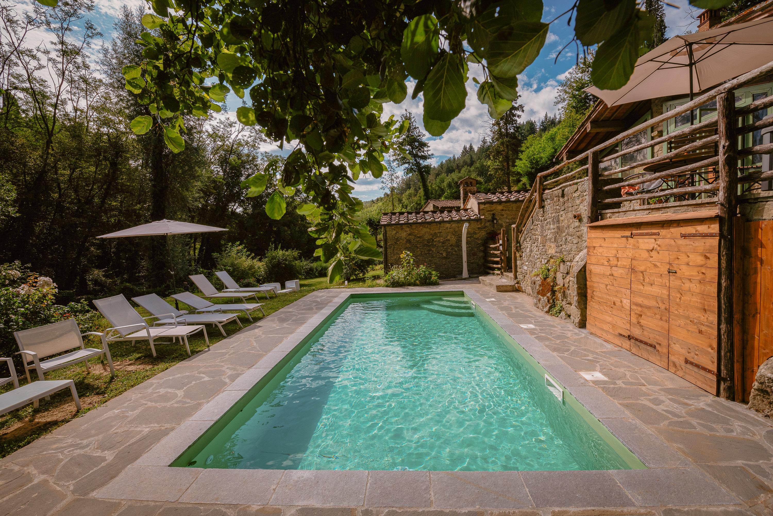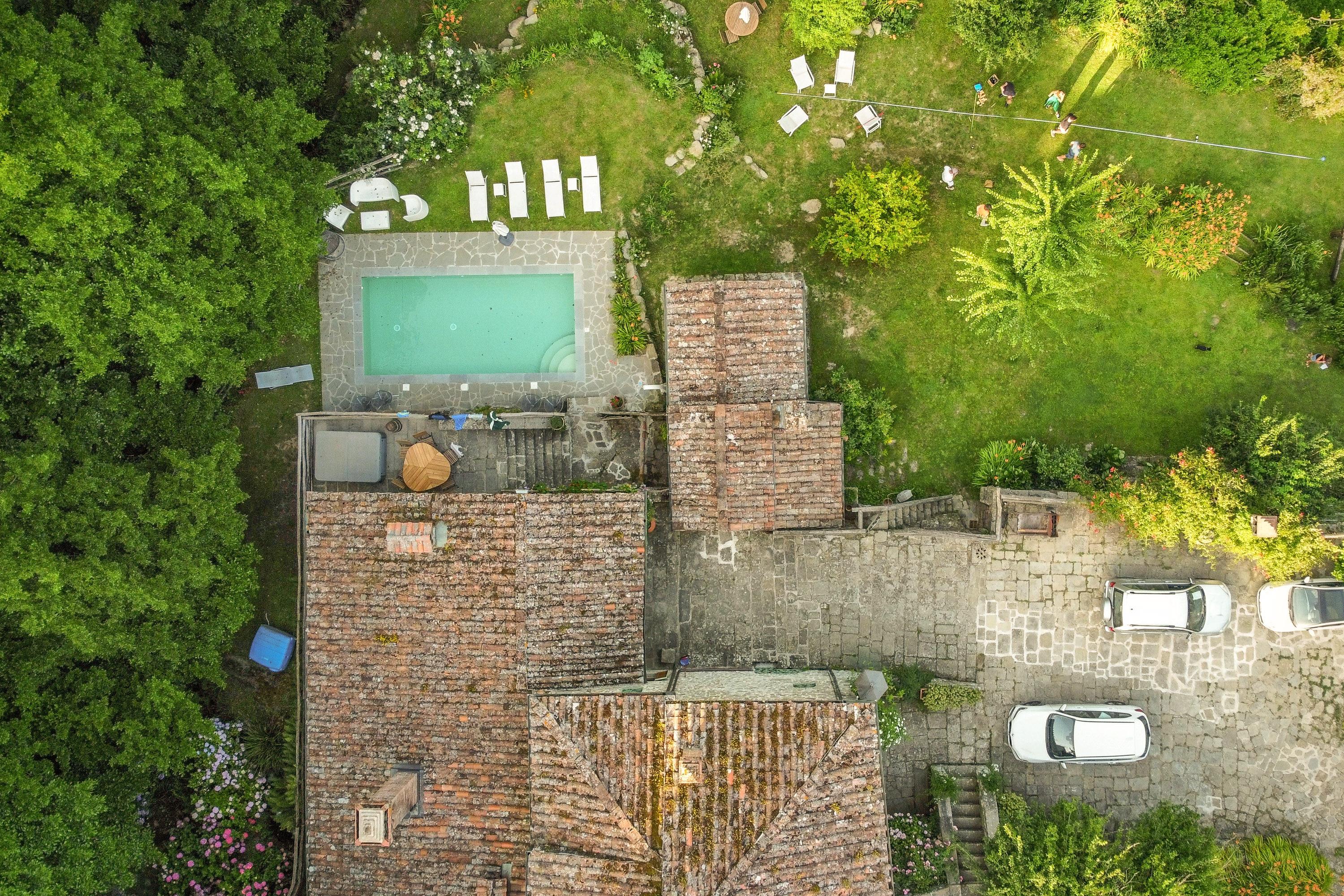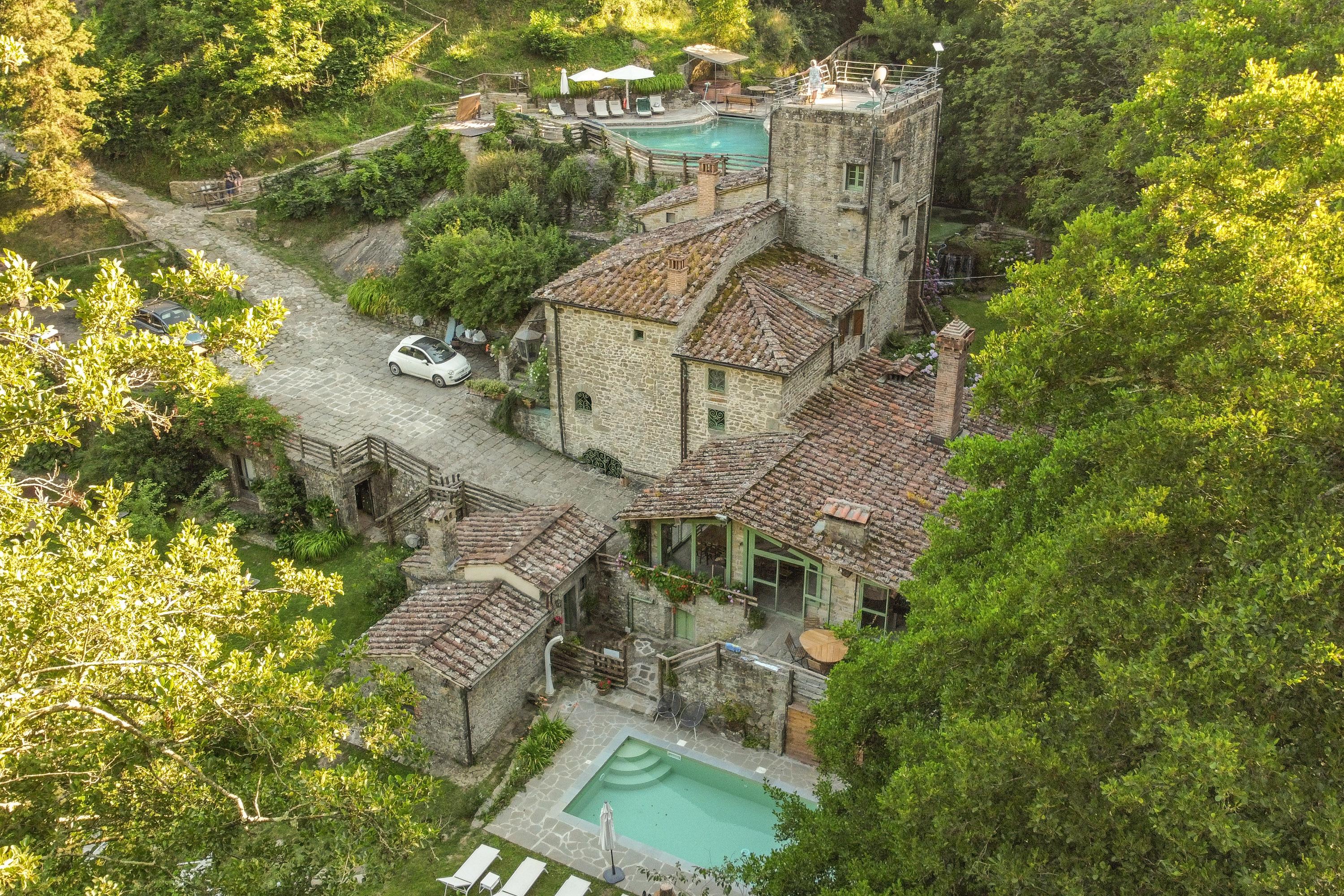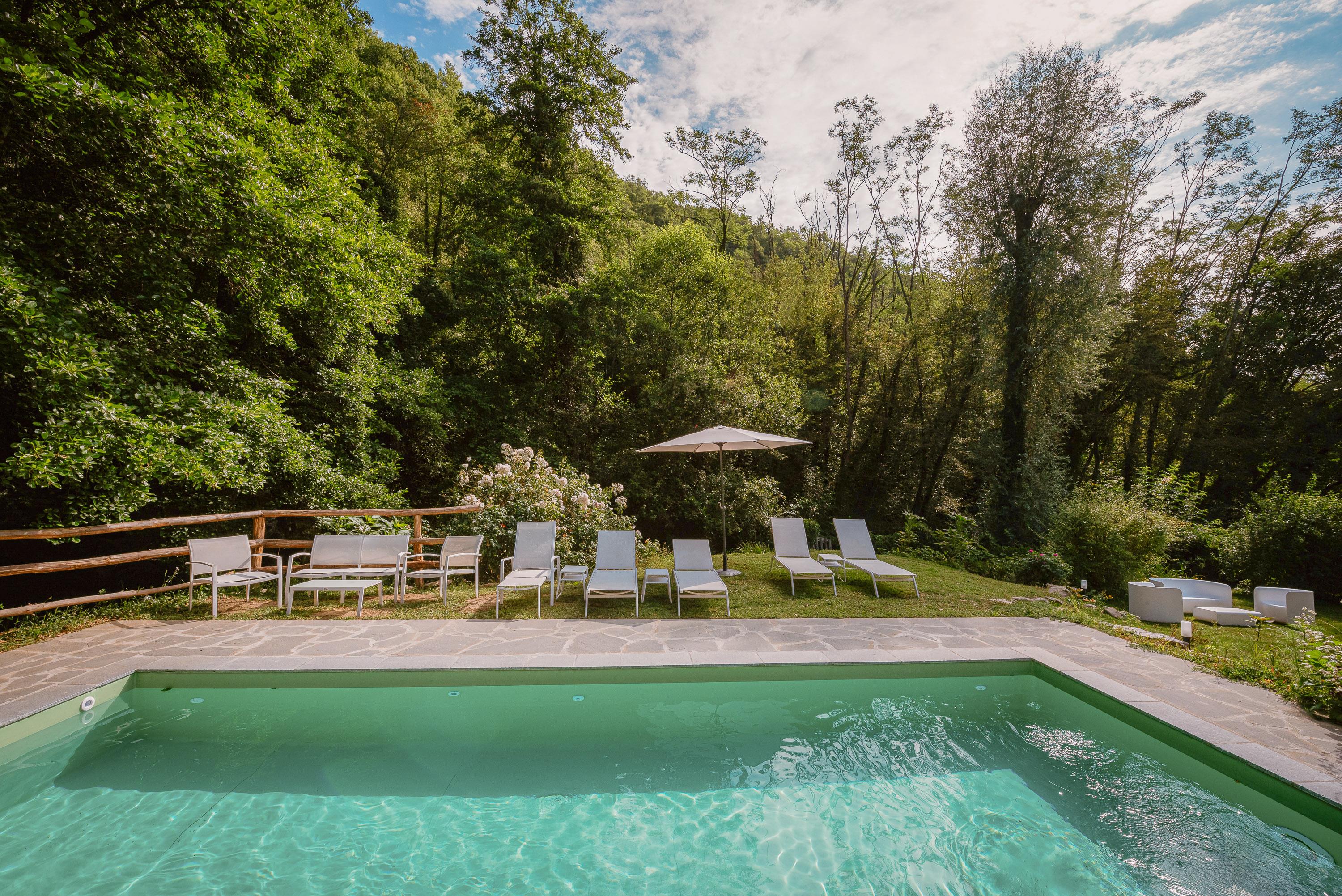 Das märchenhafte Anwesen erstreckt sich über ein 80.000 qm großes Grundstück, von dem 4 Hektar mit einem 2 Meter hohen Zaun ausbruchsicher geschlossen sind. Der große Pool auf dem Sonnendeck lässt die Herzen von Sonnenanbetern höher schlagen. Die kleinen Bächlein, die das Grundstück durchziehen, haben Trinkwasserqualität und sind bekannt für ihre Sauberkeit. Ein weiterer Swimmingpool mit Sonnenliegen befindet sich im vorderen Bereich des Hauses. Zahlreiche Hängematten wurden zwischen den Bäumen am Ufer angebracht, sodass jeder seinen persönlichen Ruheplatz finden kann. In den heißen Sommermonaten sorgt der hohe und dichte Baumbestand für ein angenehm kühles Klima. Der Bach fließt etwa 1000 Meter durch das gesamte Grundstück und bildet dabei zwei große natürliche Badebecken mit eigenen Wasserfällen, ideal zum Bauen von Staudämmen und zum sicheren Toben für Kleinkinder. Oberhalb des Hauses befindet sich ein großer Platz, der als Tennisplatz oder Volleyballfeld genutzt werden kann. Das Grundstück verfügt über sechs Parkplätze. Dank der etwa 100 cm dicken Wände benötigt die Casa nel Bosco keine Klimaanlage und bietet zu jeder Jahreszeit ein angenehmes Wohnklima.