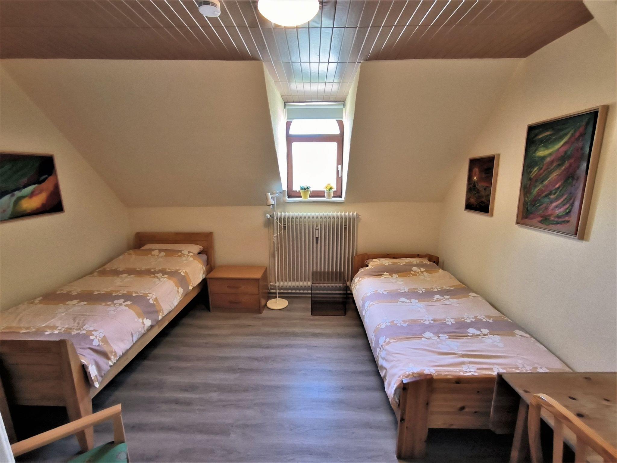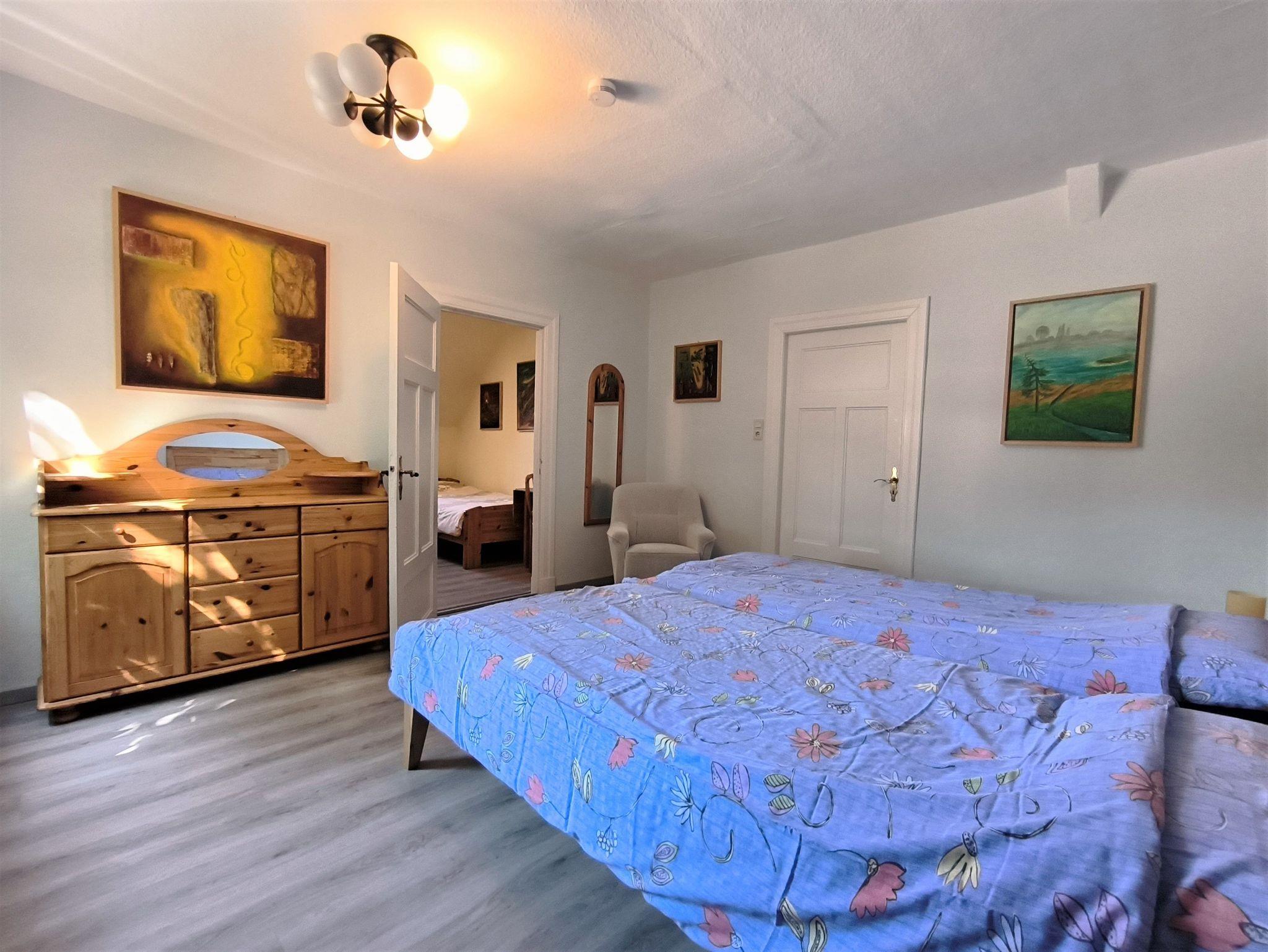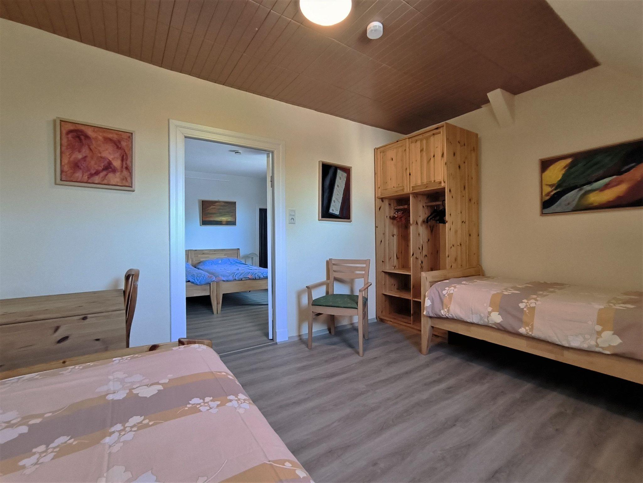 Schlafzimmer ist ein Durchgangszimmer): im ersten Schlafzimmer stehen die Bettennebeneinander, im zweiten Schlafzimmer getrennt. Beide Zimmer lassen sich verdunkeln. Auf Nachfrage kann noch ein Schlafsofa für eine Person in der kleinen Kammer hergerichtet werden, so dass insgesamt fünf Personen übernachten können.