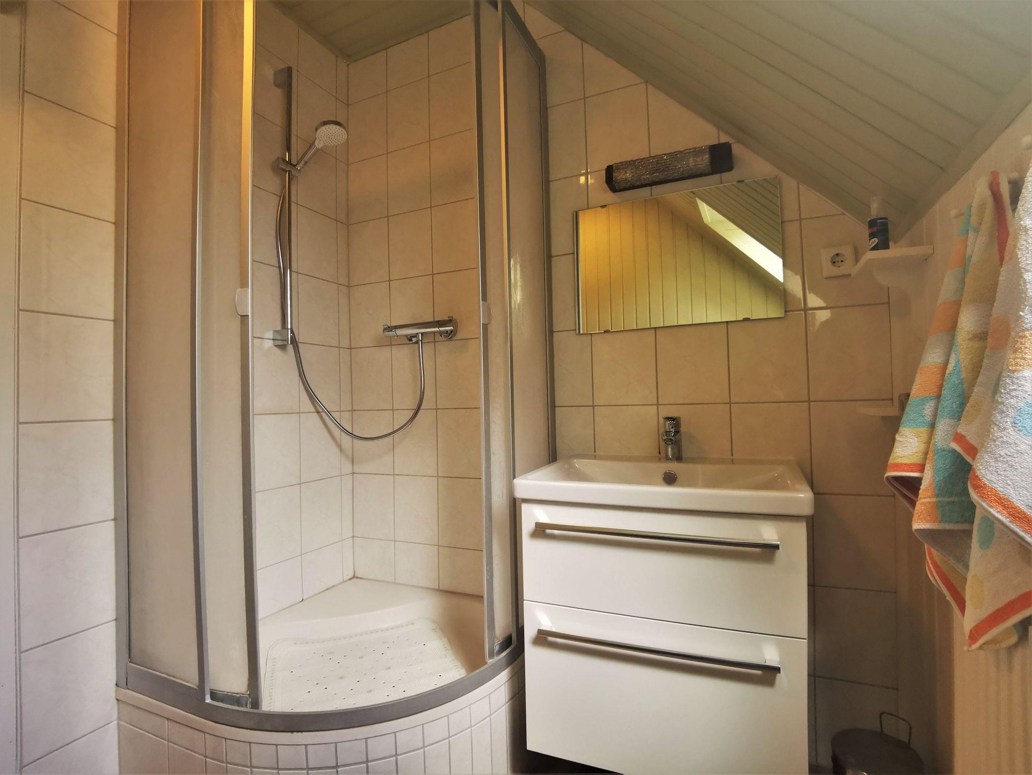 Die Ferienwohnung besteht aus zwei Schlafzimmern mit je zwei Einzelbetten. Das kleine Bad ist mit Toilette, Waschtisch und Dusche ausgestattet (bitte beachten: hoher Einstieg in die Dusche). Weiter gibt es eine Waschmaschine. Die Küche ist das Herzstück der Wohnung und ist sehr gut ausgestattet (Geschirrspülmaschine, Mikrowelle, Kühlschrank mit kleinem Gefrierfach) und lädt mit einem Tresen zum gemeinsamen Zubereiten der Mahlzeiten oder zum netten Austausch ein. Der Esstisch für vier Personen steht im unmittelbar angrenzenden Wohnzimmer, das außerdem über eine gemütliche Sitzecke und einen Flachbild-Fernseher verfügt. Im Wohnzimmer steht eine große Schrankwand (auch für die Kleider zu nutzen, da in den Schlafzimmern keine Kleiderschränke vorhanden sind). Auf der tollen Dachterrasse sitzt man geschützt (teilweise überdacht) und kann sich mit dem Elektrogrill leckere Mahlzeiten zubereiten.