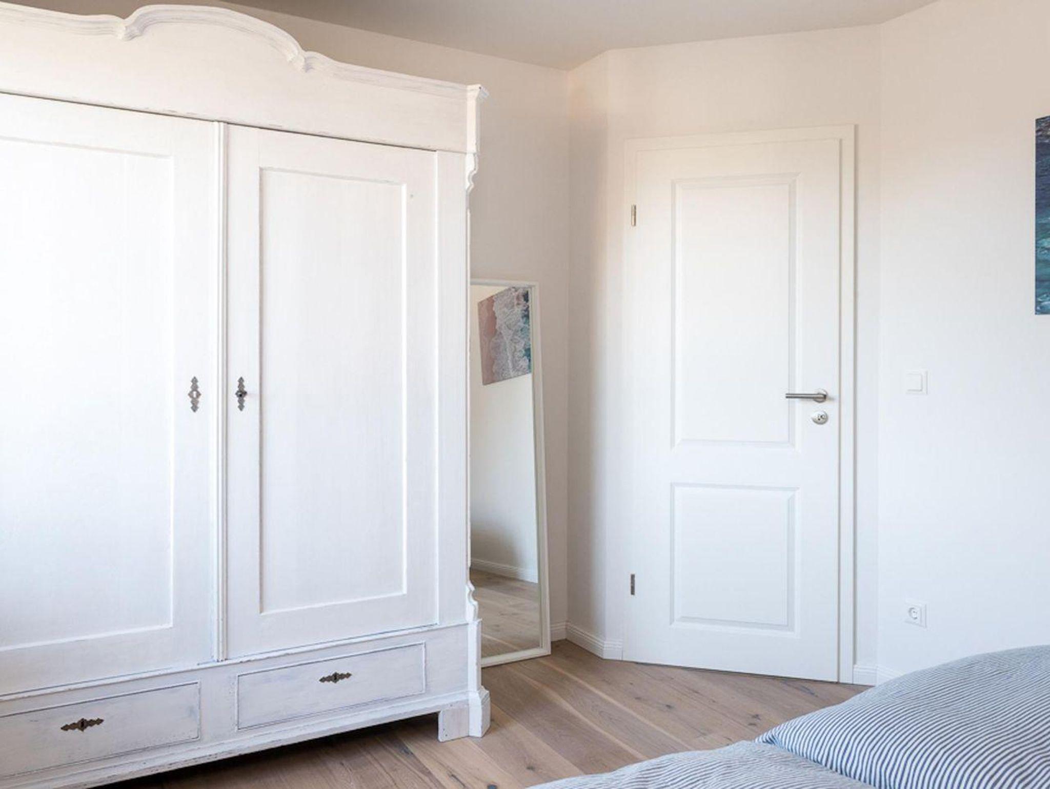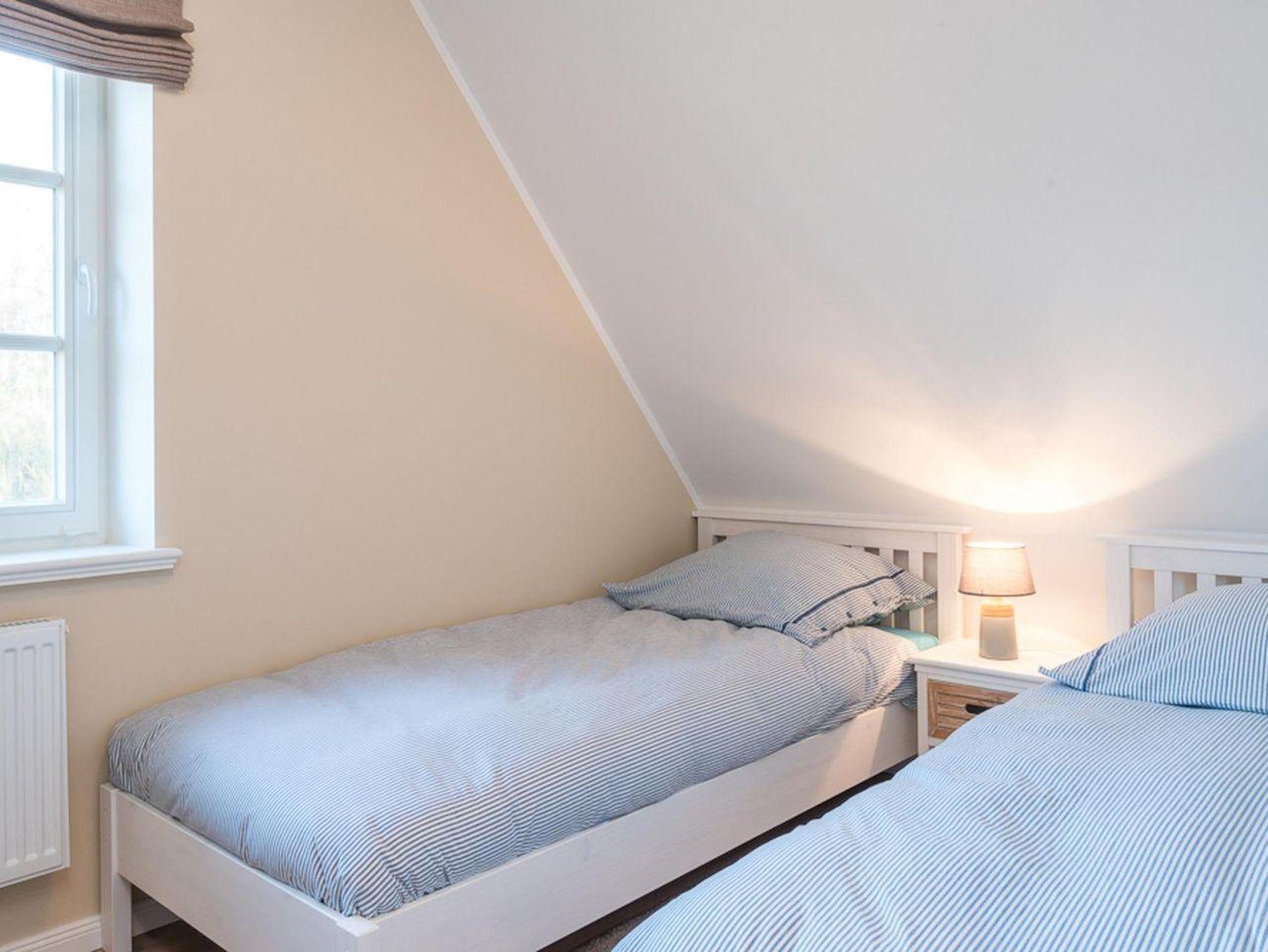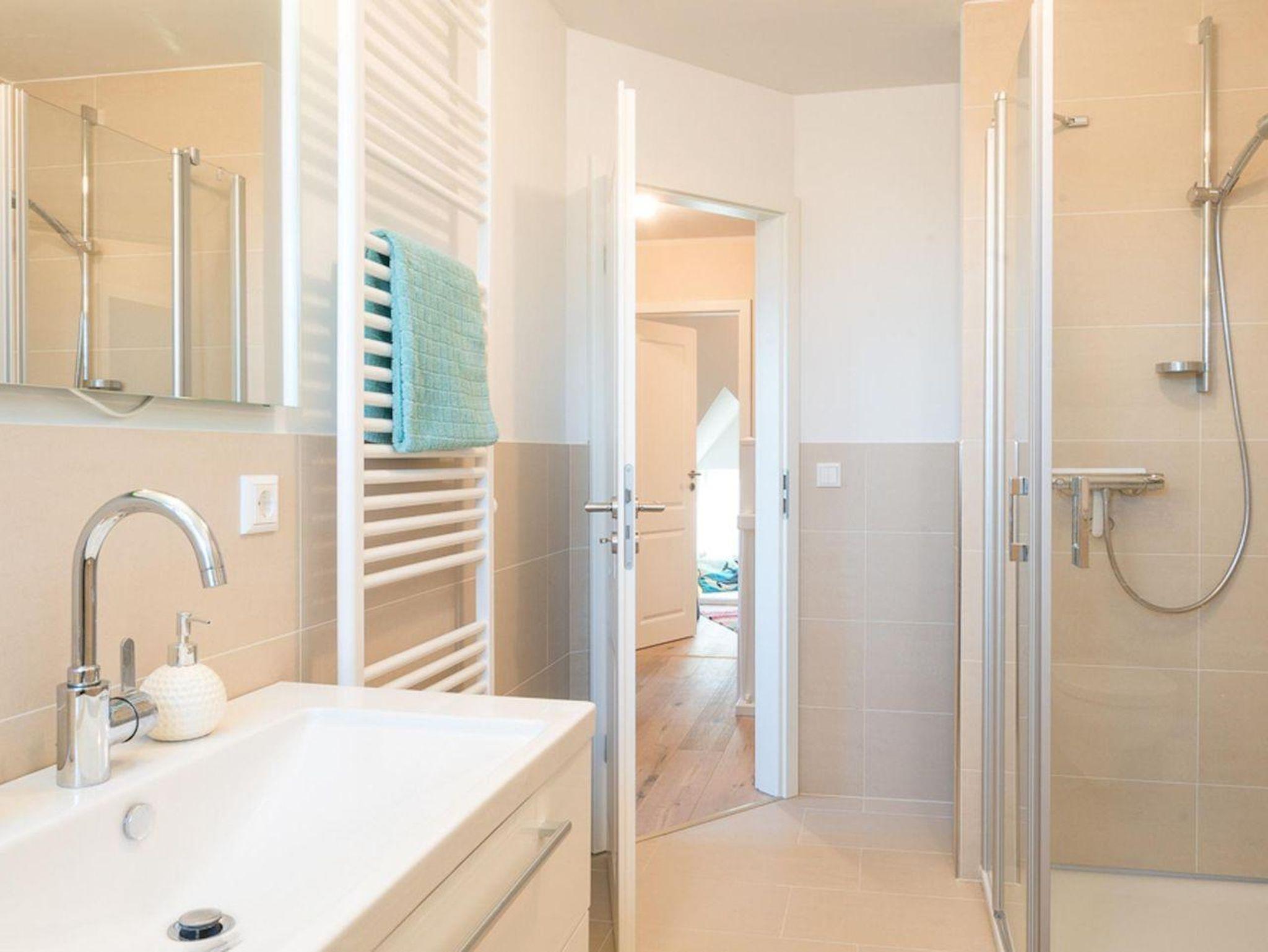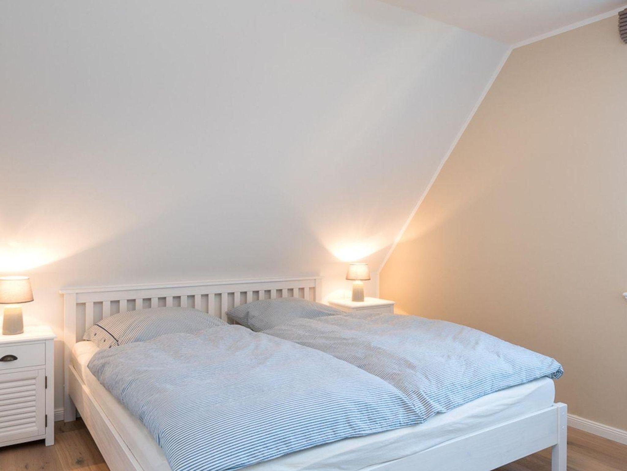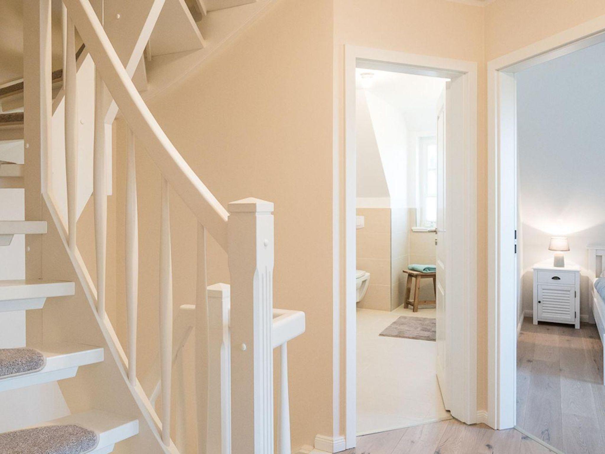 Über eine schöne weiße Holztreppe gelangt man in das mit Parkett ausgelegte Obergeschoss. Hier befinden sich ein Schlafzimmer mit einem Doppelbett (180 x 200cm), ein Schlafzimmer mit 2 Einzelbetten (je 90 x 200cm) und TV. Außerdem ist im Obergeschoss eine Kuschelkoje mit einem Einzelbett (90 x 200cm) vorhanden zum Zurückziehen oder Spielen. Alle Schlafzimmer verfügen über ein Verdunkelungsrollo und sehr gut getestete Matratzen für einen angenehmen gesunden Schlaf. Schränke gewähren Ihnen hinreichend Ablageflächen. Darüber hinaus befindet sich im Obergeschoss ein weiteres, geräumiges Bad mit Dusche. Auch für die kleinen Gäste ist gesorgt: Es gibt Spielzeug, ein Reisebett, einen Kinderhochstuhl, Kindernachtleuchten, einen Kinderhocker im Bad und einen Kinder-WC-Sitz.