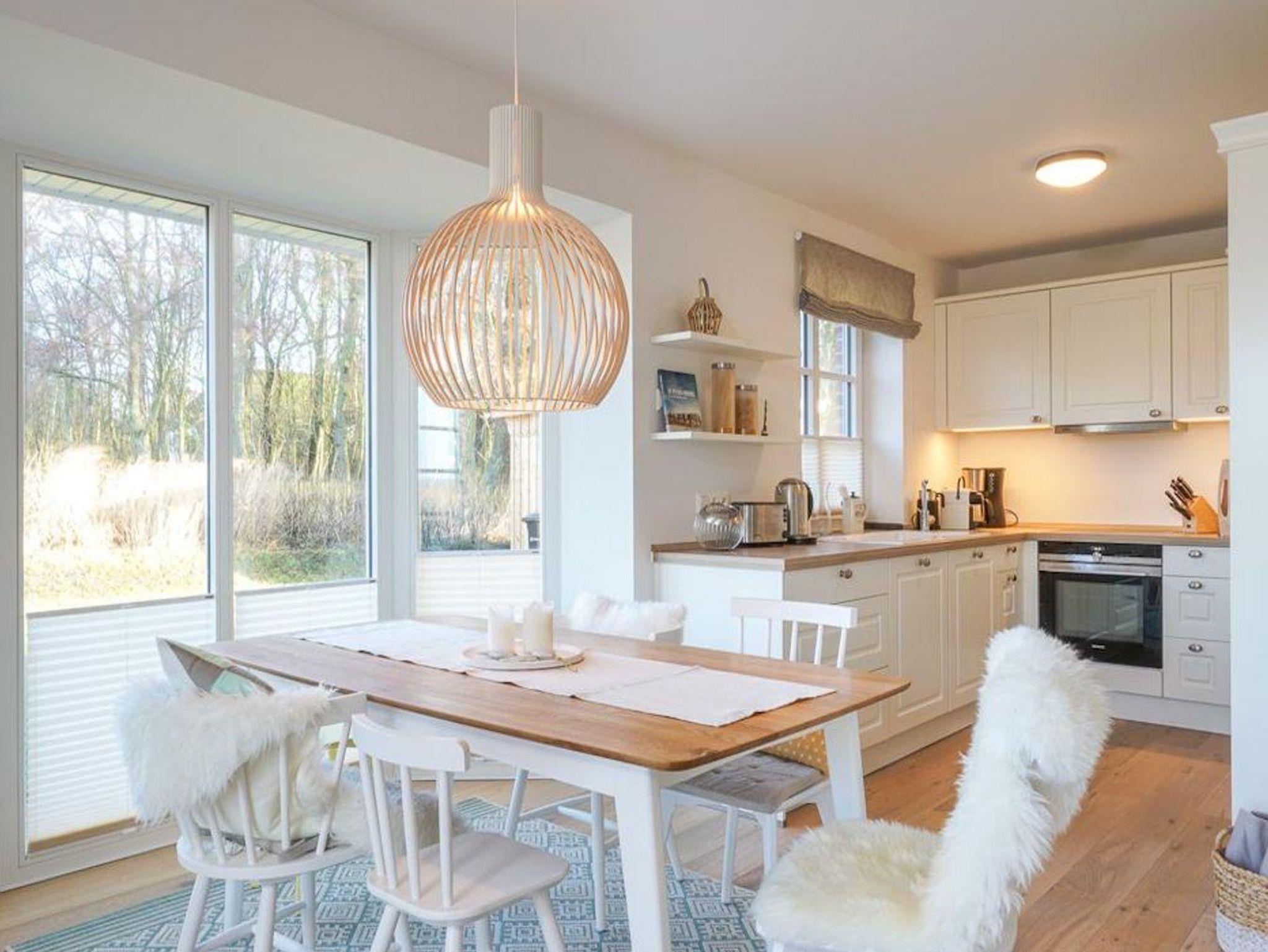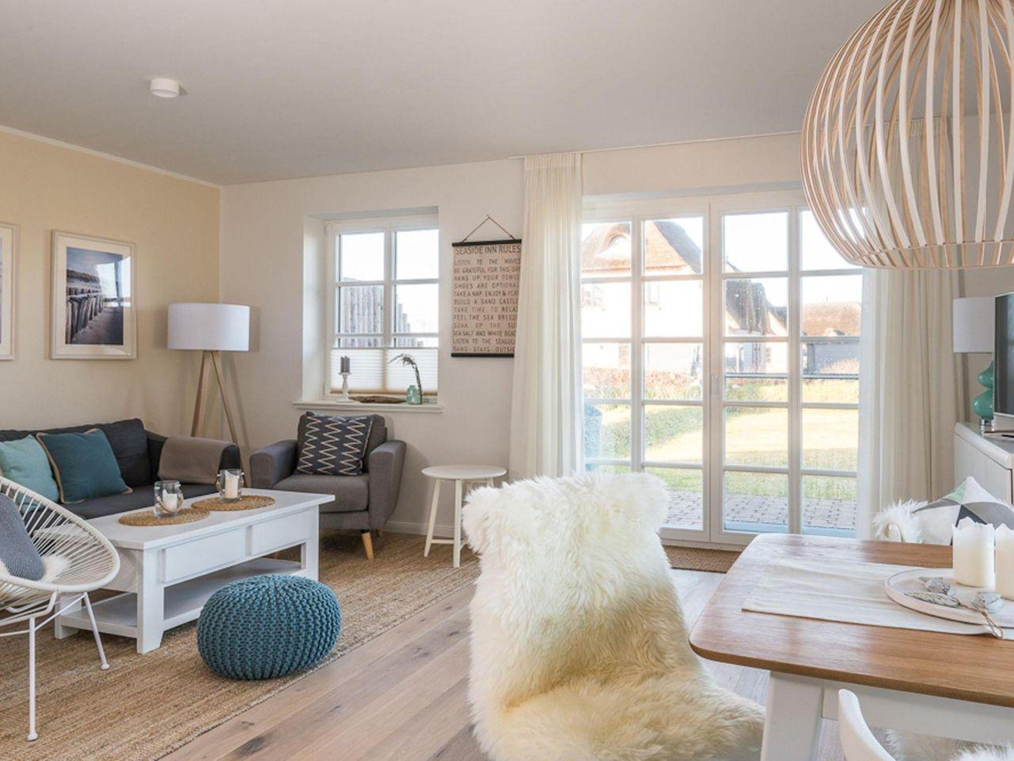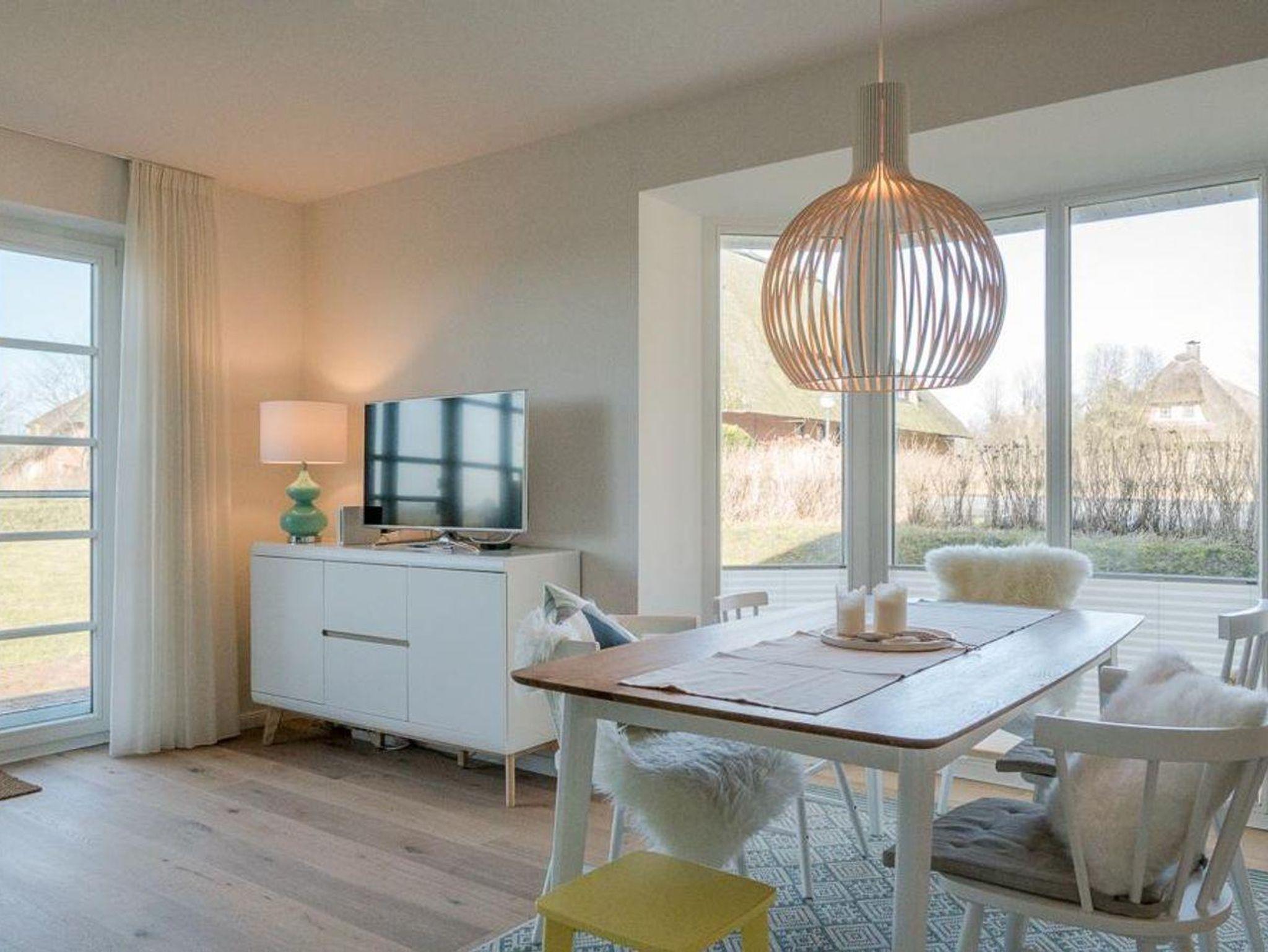 Im Erdgeschoss befindet sich der lichtdurchflutete Wohnraum mit TV, Apple TV, kleine Musikanlage mit Dockingstation für iPhone, Kaminofen, einer offenen Küche sowie einem stilvollen hellen Essbereich mit Blick auf die Düne. Die Wohnräume sind mit exklusiven Möbeln ausgestattet. Die Küche verfügt über hochwertige Elektrogeräte und lässt von der Nespressomaschine über ein Waffeleisen bis zur Salatschleuder keinen Wunsch offen. An den Wohnbereich schließen sich ein Flur mit eingebauter Garderobe, ein Hauswirtschaftsraum mit Waschmaschine und Trockner und ein Duschbad an. Das gesamte Erdgeschoss verfügt über ein hochwertiges weiß gekalktes Eichenparkett, welches über Fußbodenheizung beheizt werden kann.